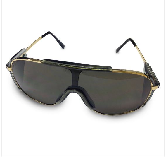 Metallbåge med en lins, gråtonad polykarbonatlins mot bländning, säkerhetsglasögon.