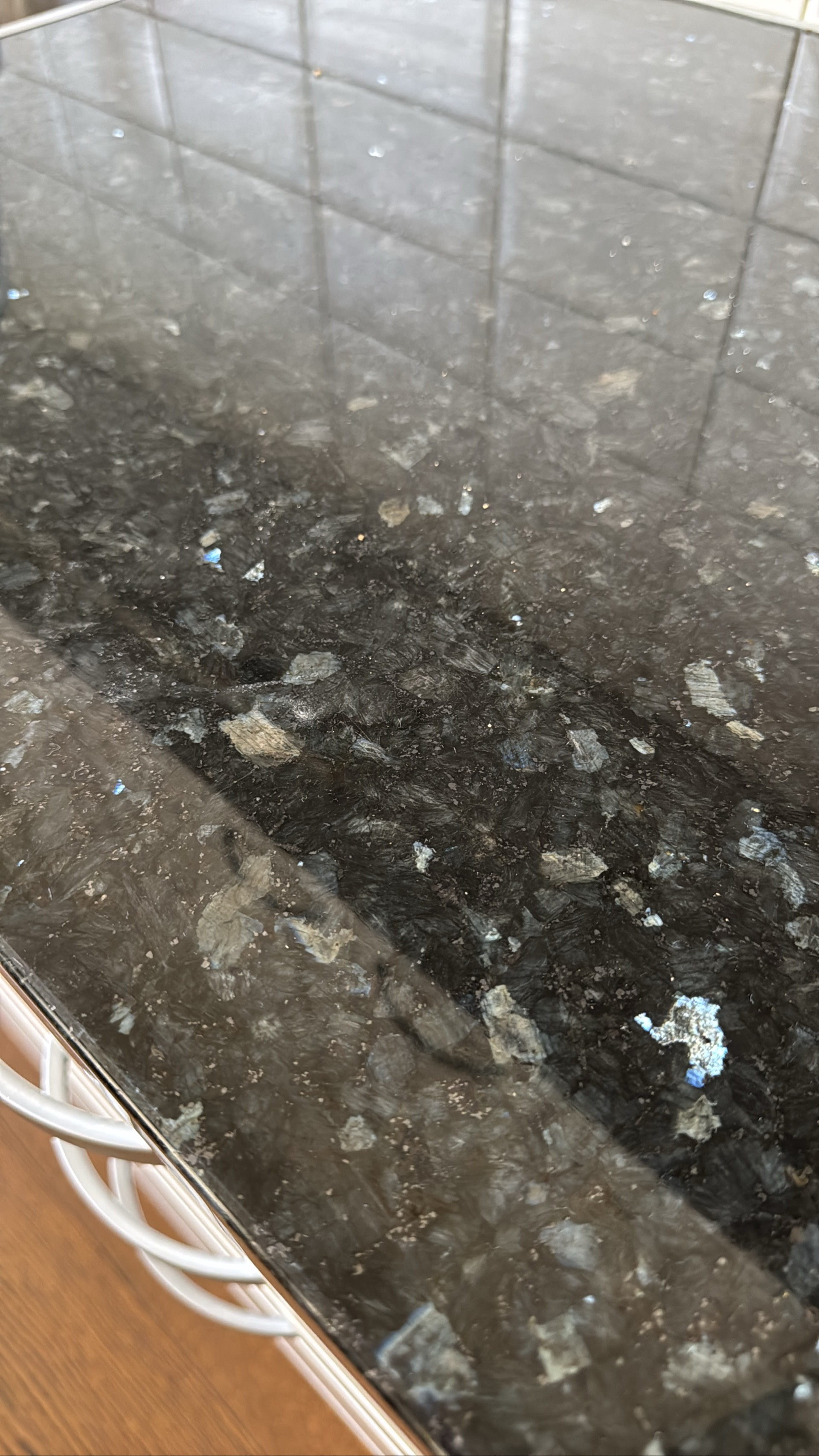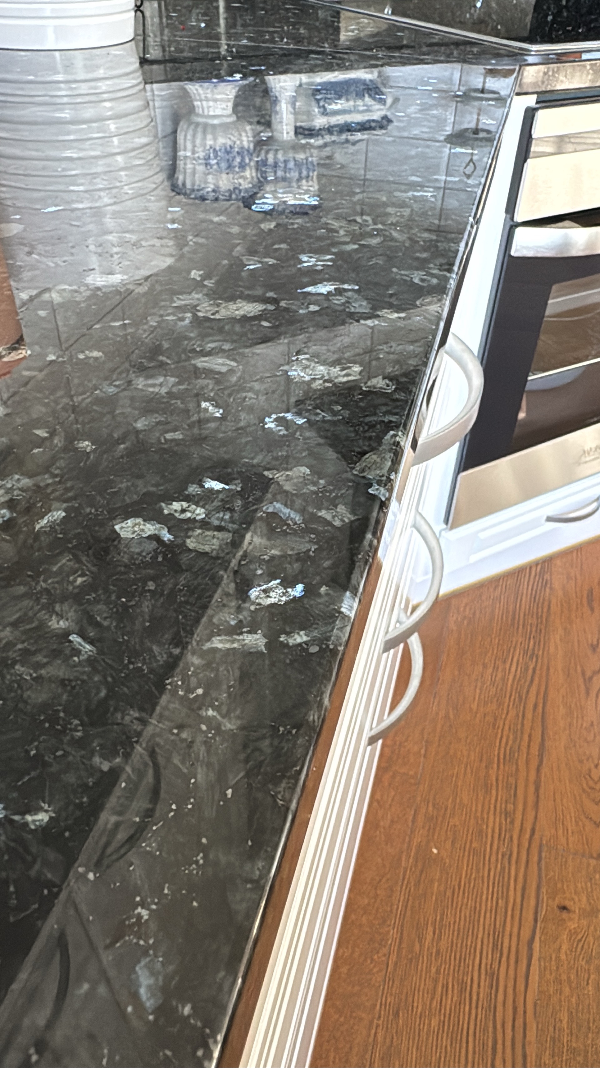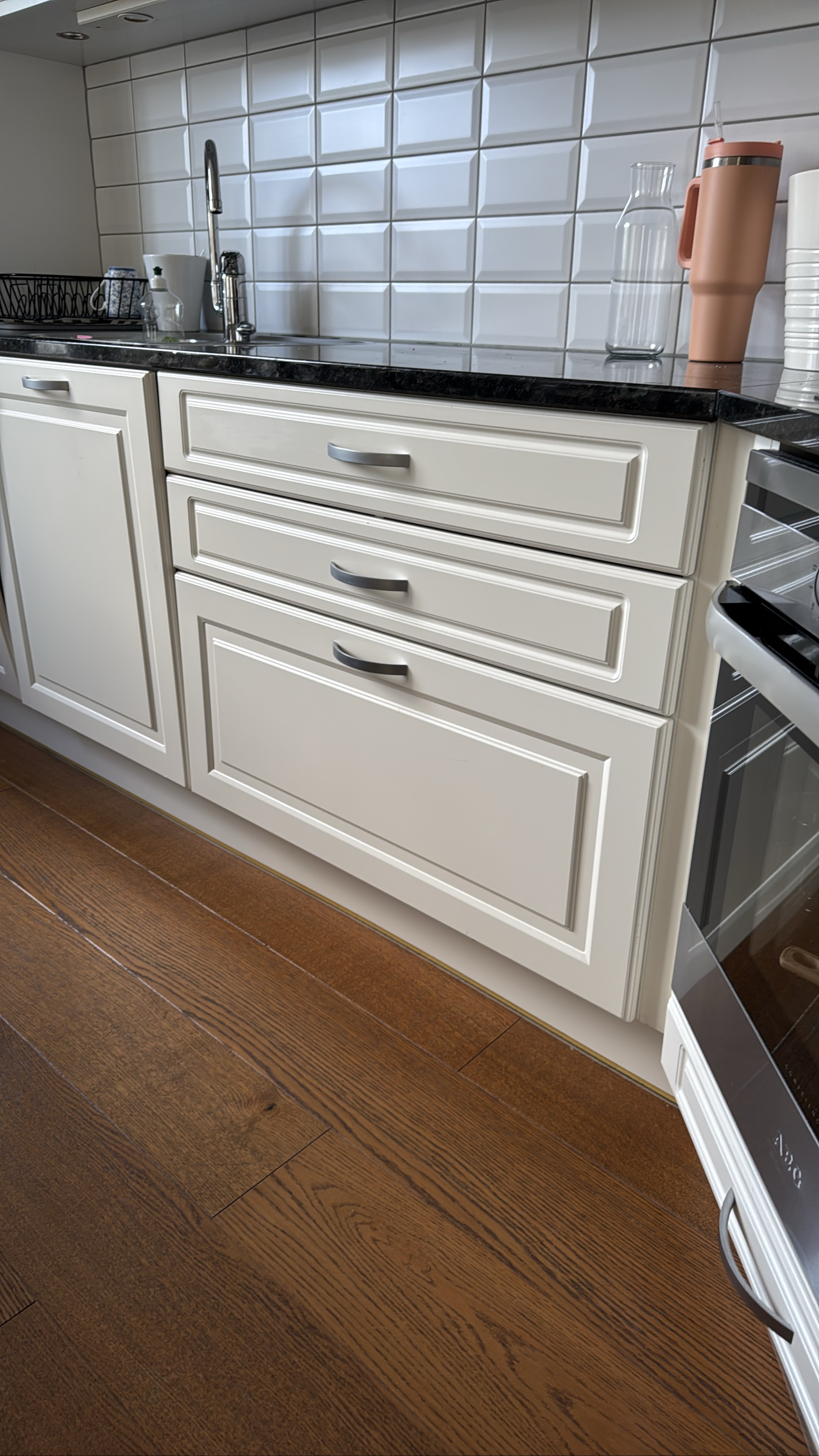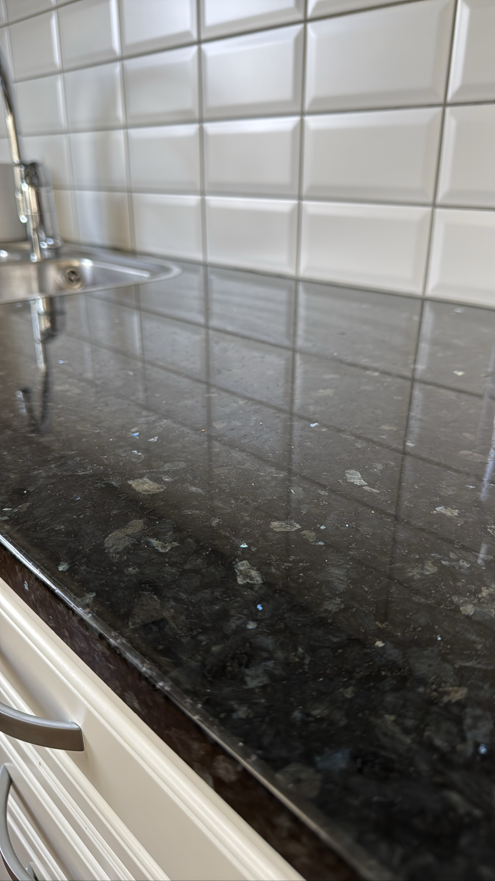 - Granitbänkskiva tjocklek 3 cm, djup 60 cm. Bredd från vänster i bild: 63 cm +197cm+ hörn -71 cm i framkant - rak bit mot vägg 26 cm + 119 cm + 25 cm. Hörnbit om 48 cm)