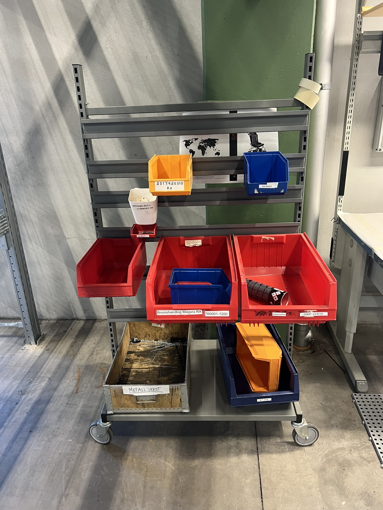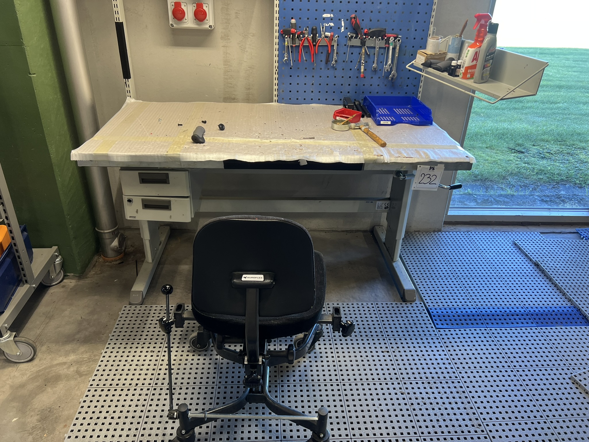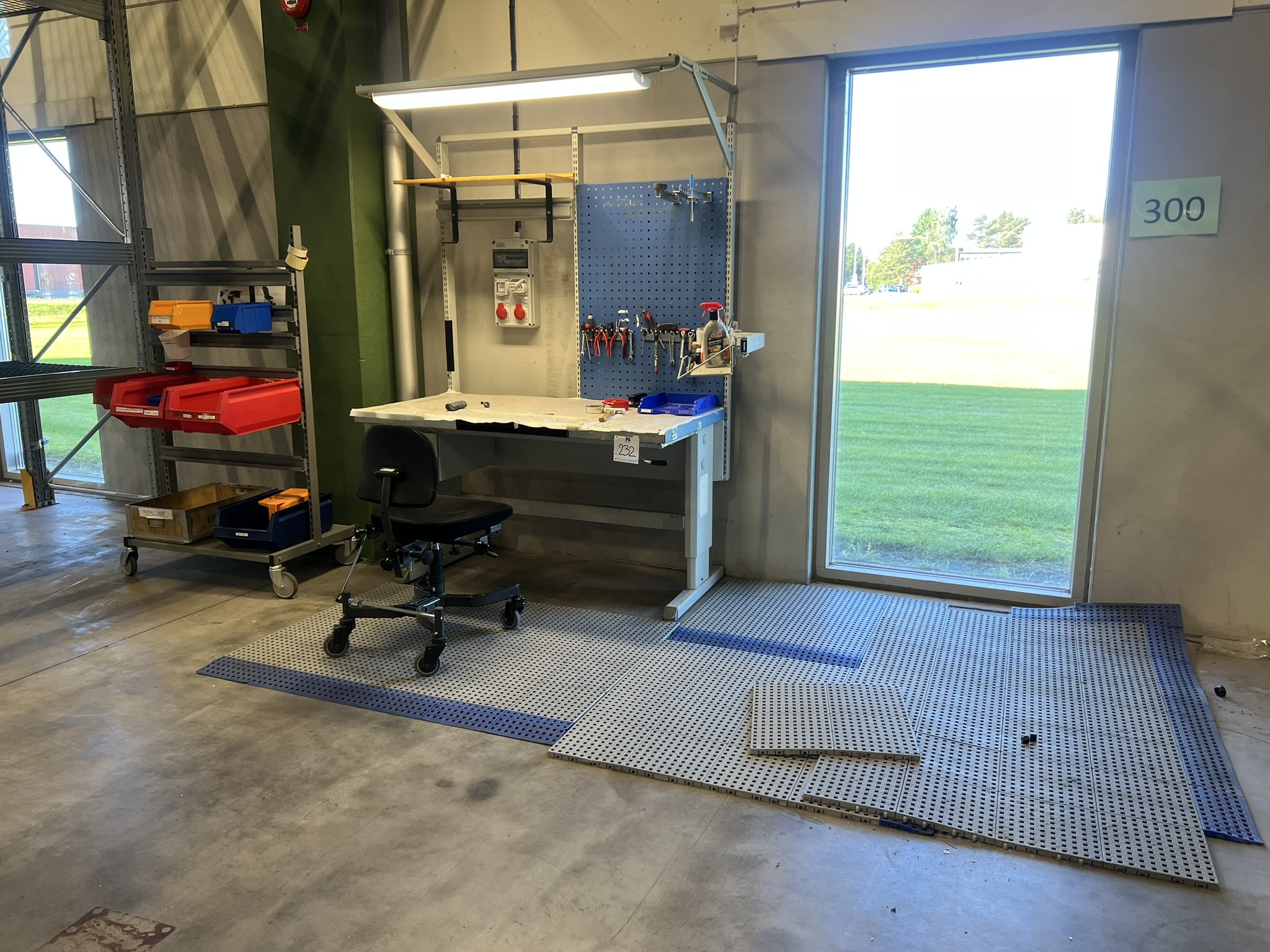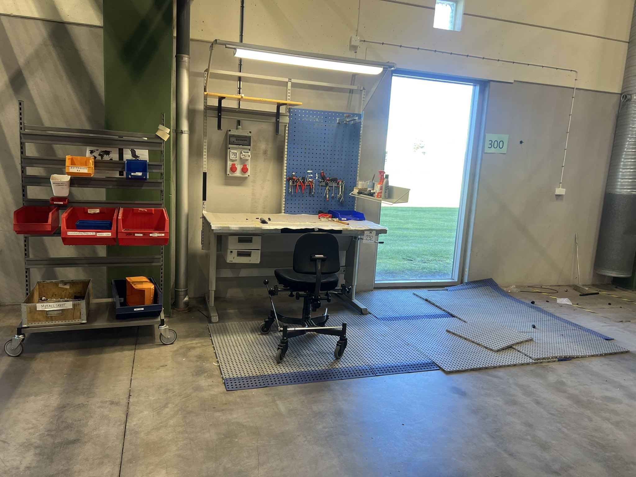 Lampa, verktygstavla, lagerlådsvagn, stol och arbetsmatta