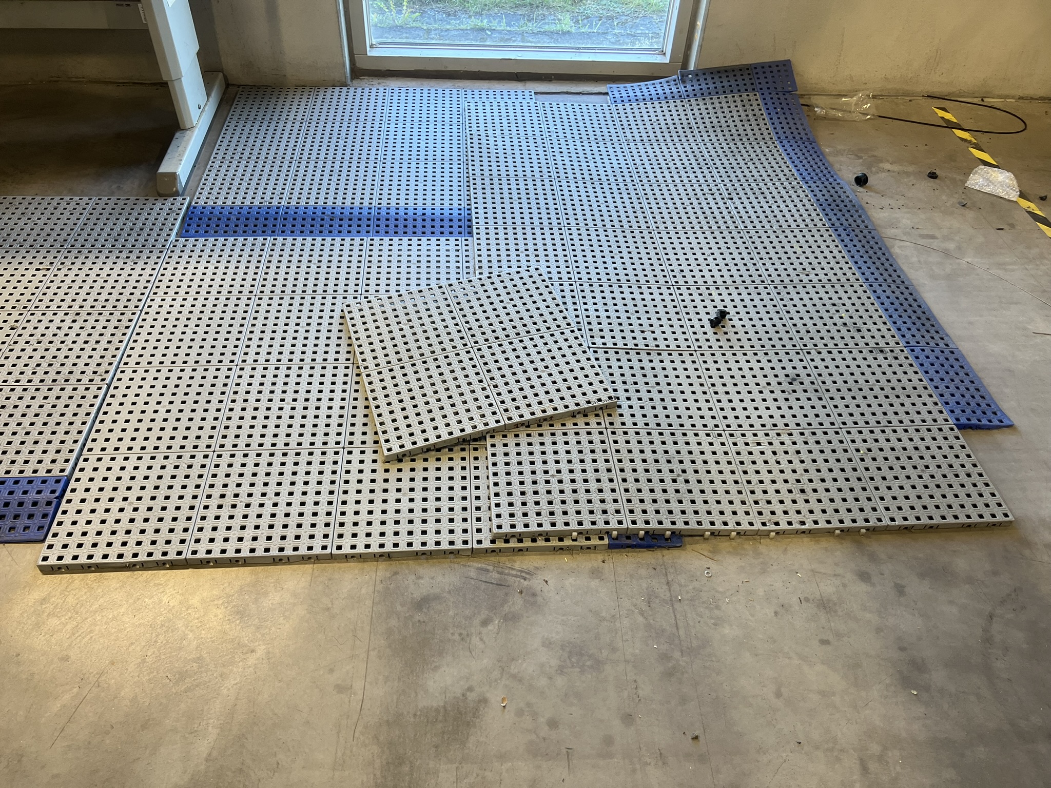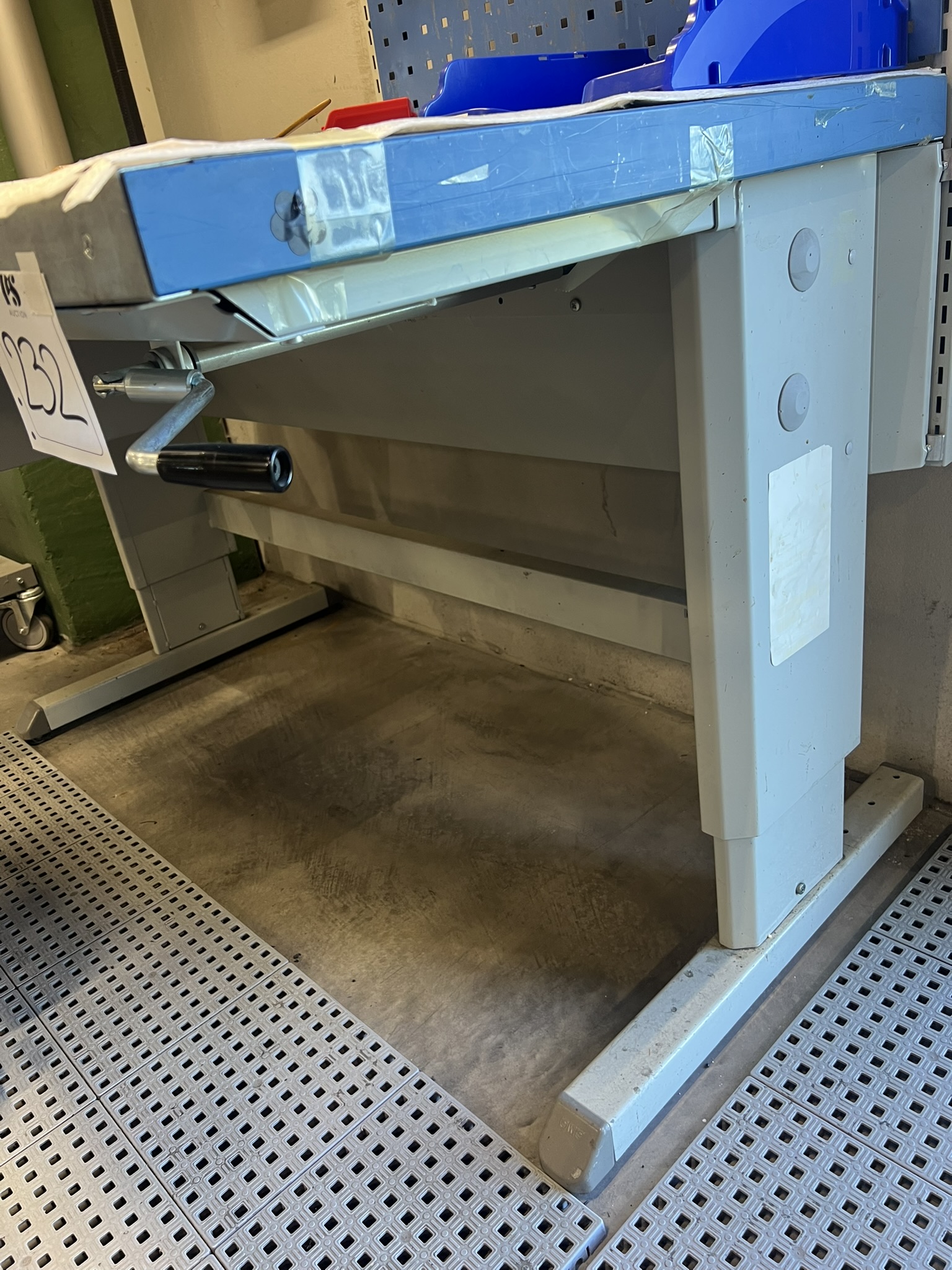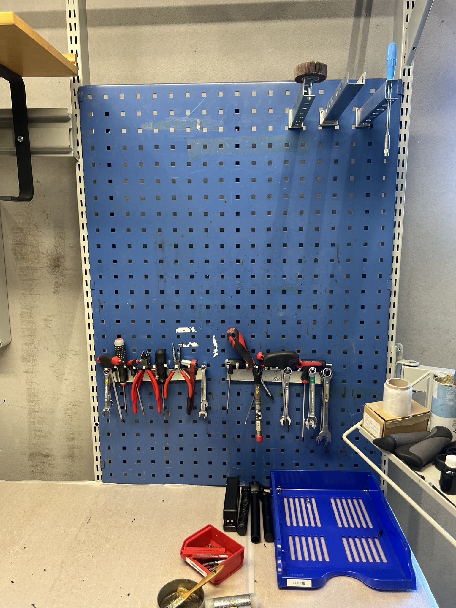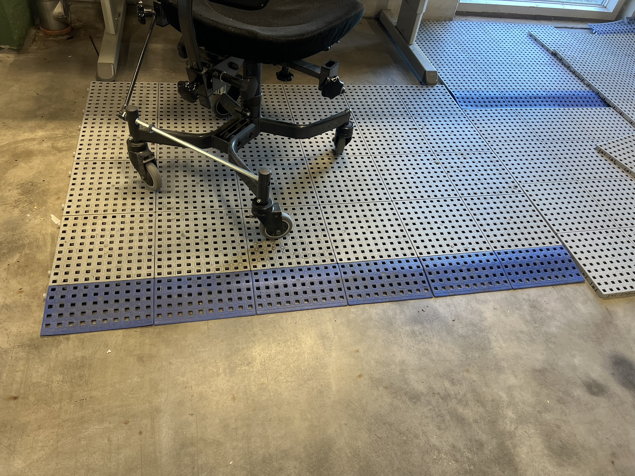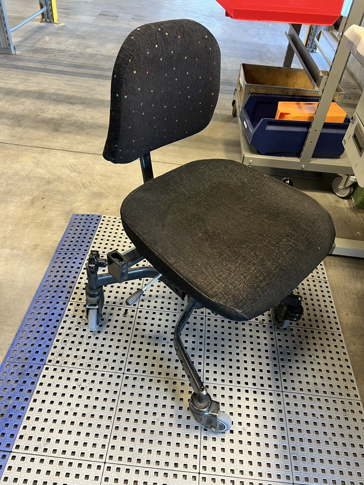 Lampa, verktygstavla, lagerlådsvagn, stol och arbetsmatta
