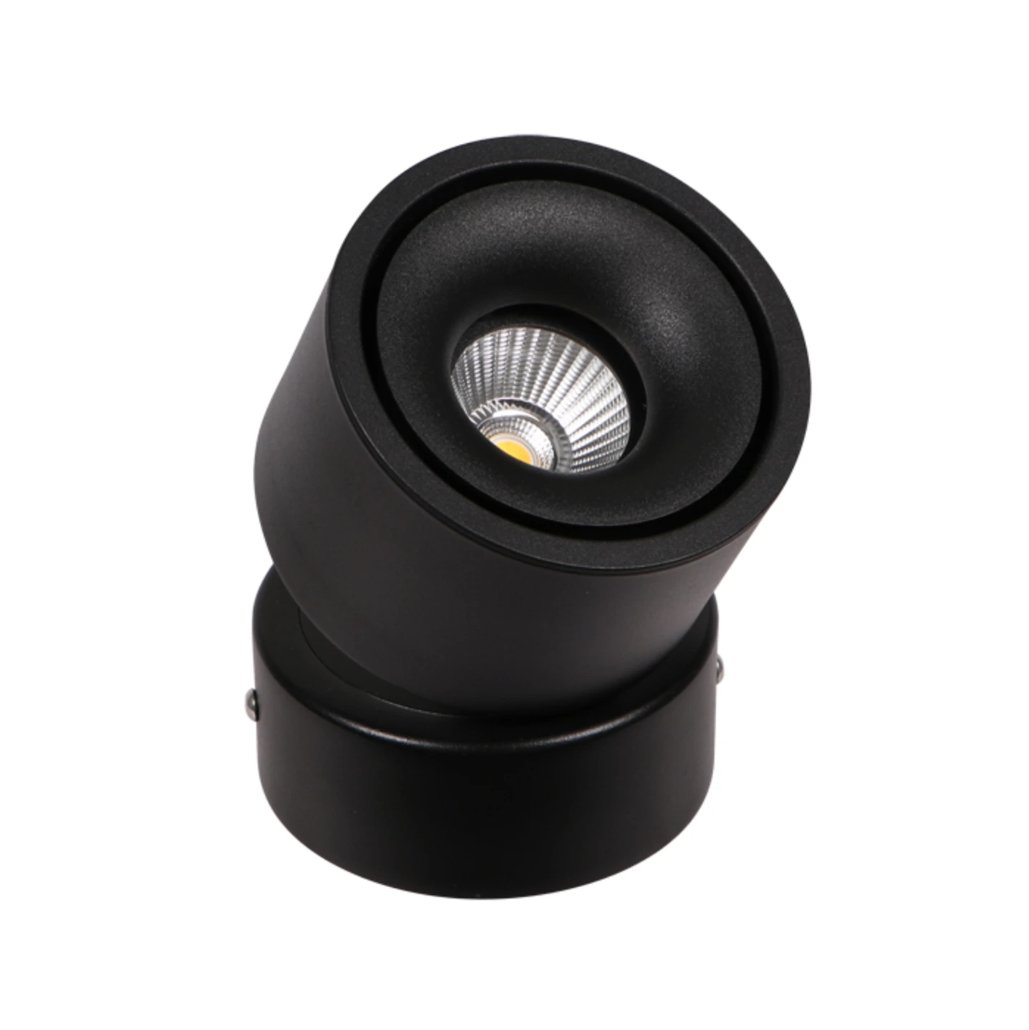 Modern och stilren LED-downlight för utanpåliggande montage i svartlackerad aluminium. Armaturen är både roterbar och tiltbar, vilket gör den idealisk för riktad belysning i hem, kontor eller butik.