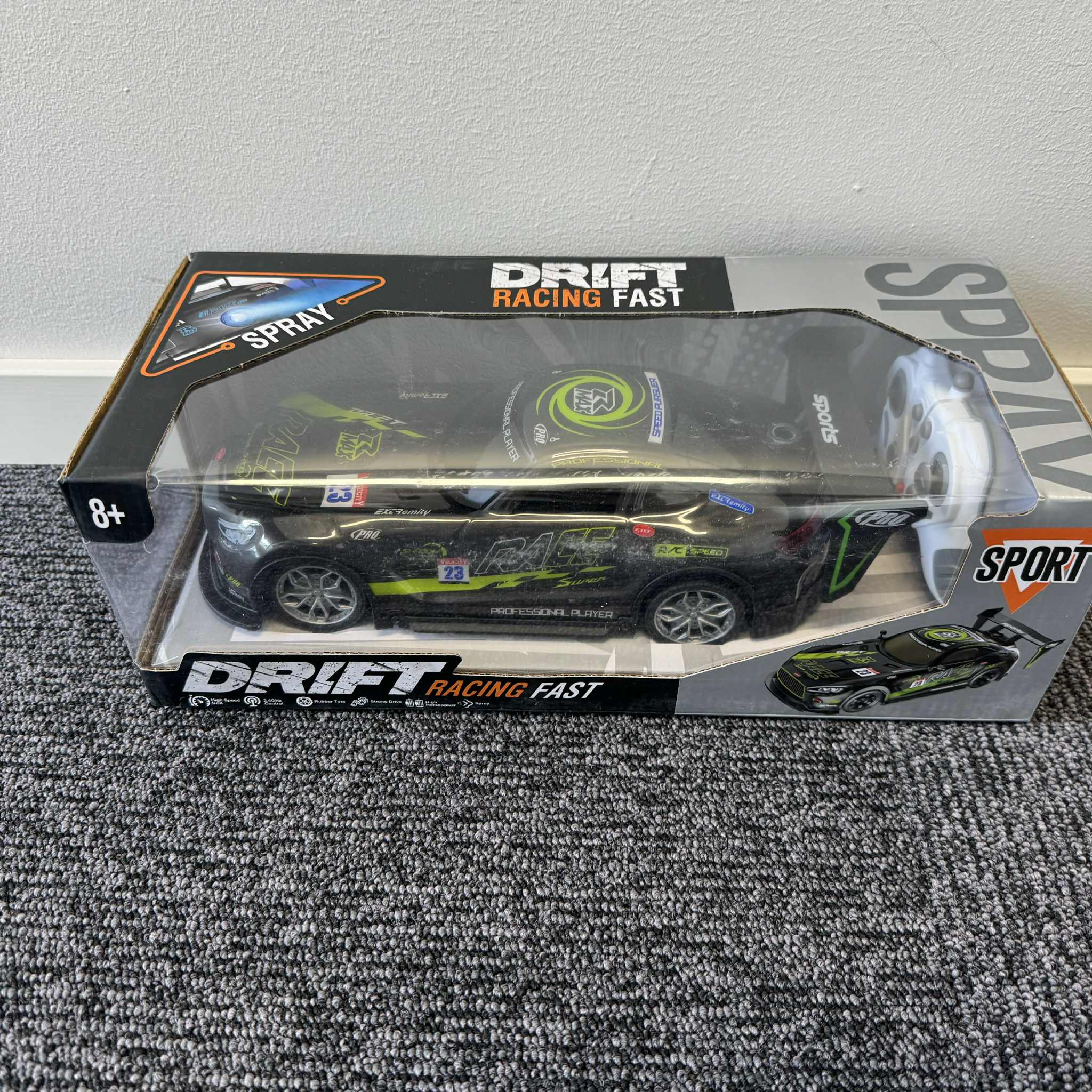 Sportig radiostyrd driftbil med fyrhjulsdrift och aerodynamisk design. Utrustad med bakvinge för stabilitet och anpassad för hög fart och kontrollerade svängar på plana underlag.
