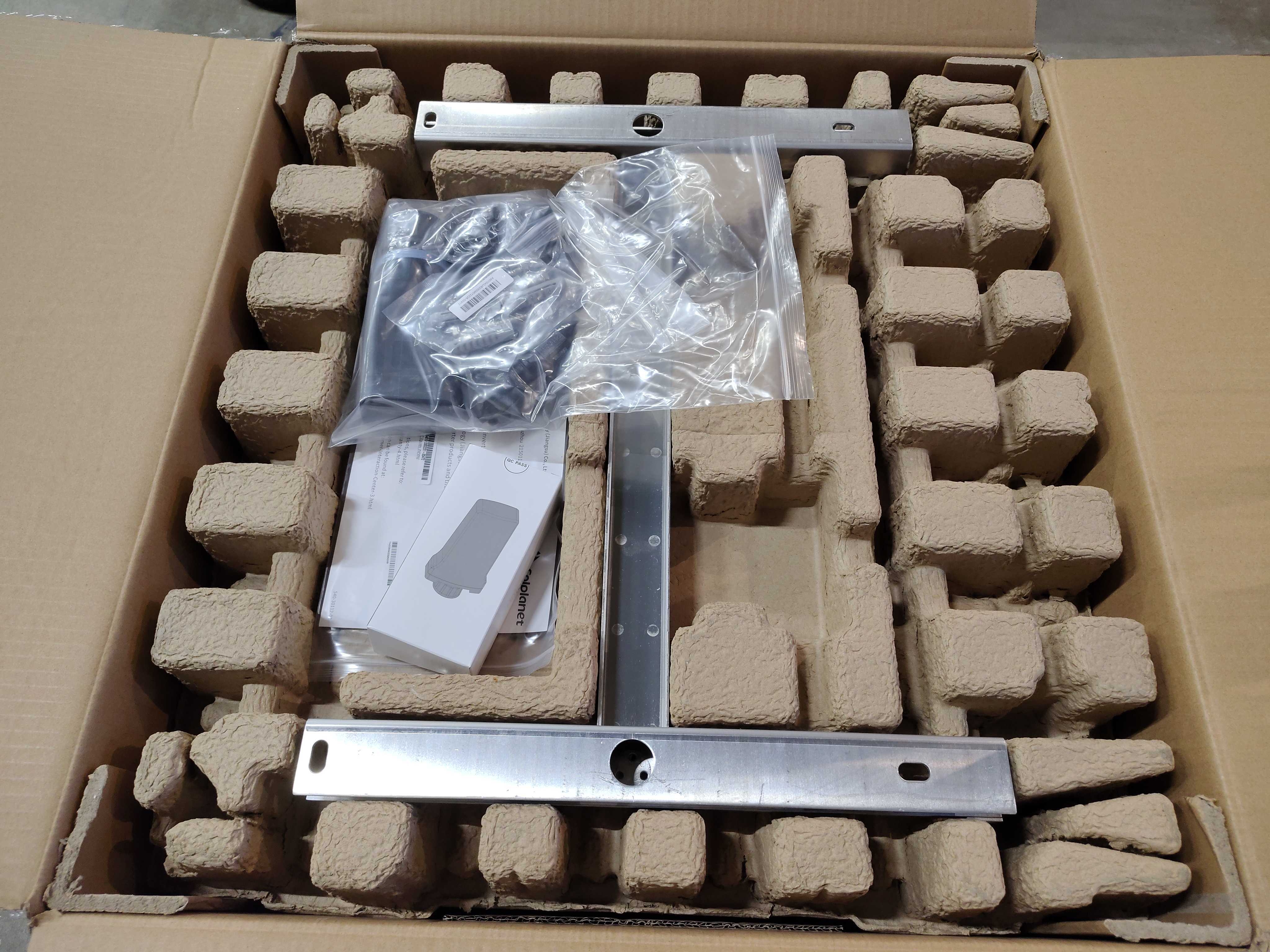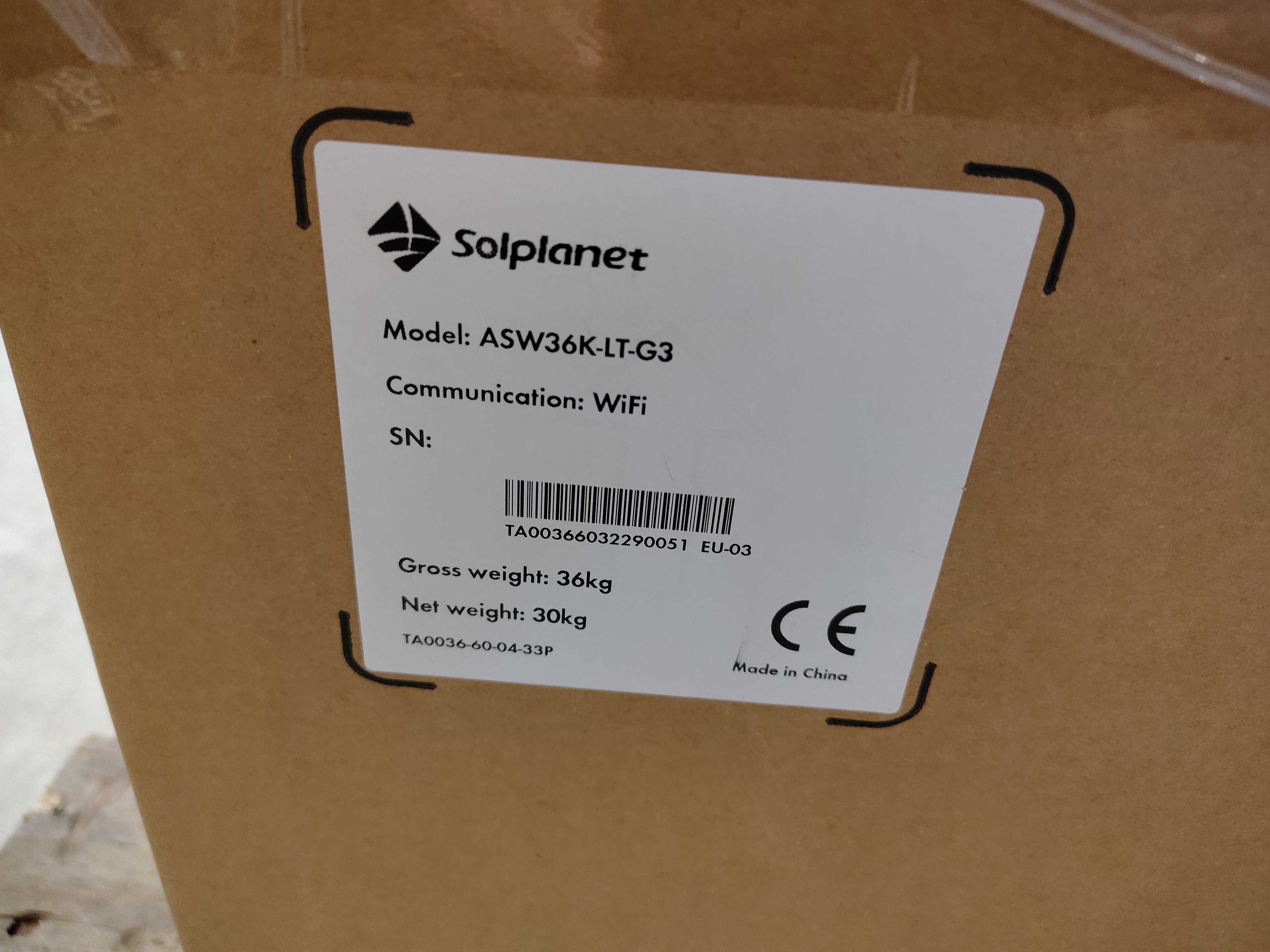 Solplanet ASW36K-LT-G3 växelriktare med monteringsfästen, tillbehör och dokumentation i originalkartong.