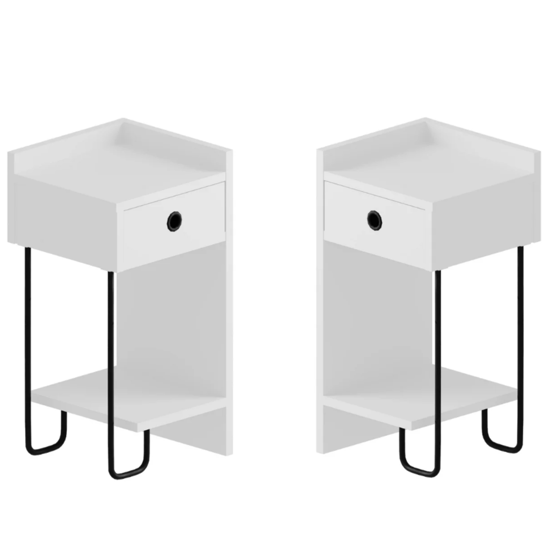 Stilrena sängbord med en låda och hylla. Passar moderna sovrum med enkel och funktionell design.
