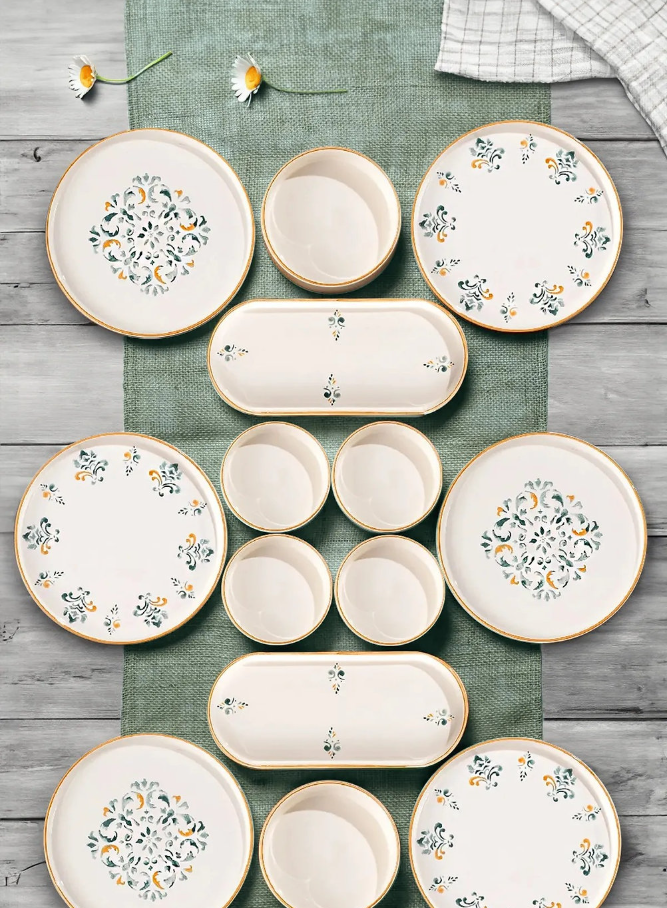 Servis i keramik med blommönster i gröna och gula toner samt guldfärgad kant. Setet innehåller tallrikar, fat och skålar i klassisk design som ger dukningen en varm och hemtrevlig känsla.