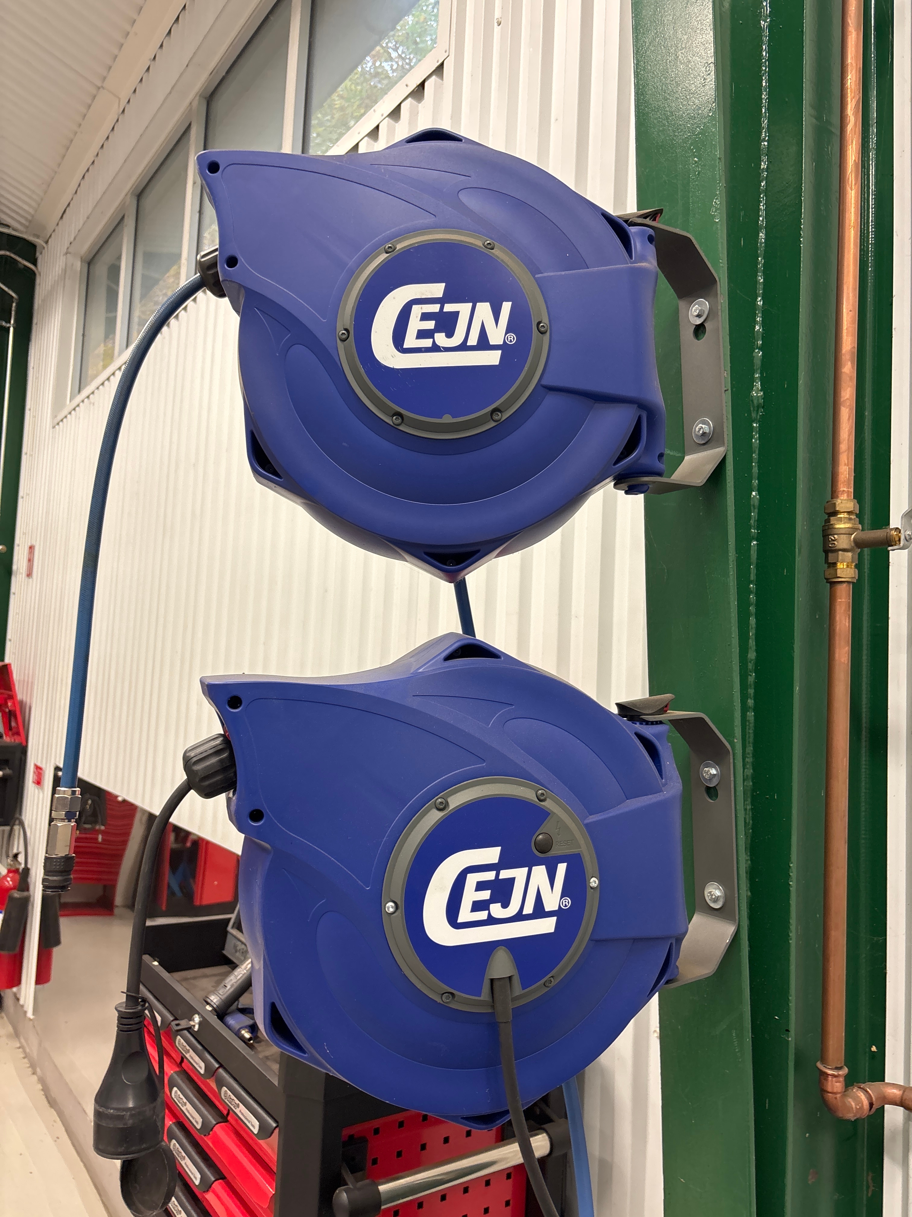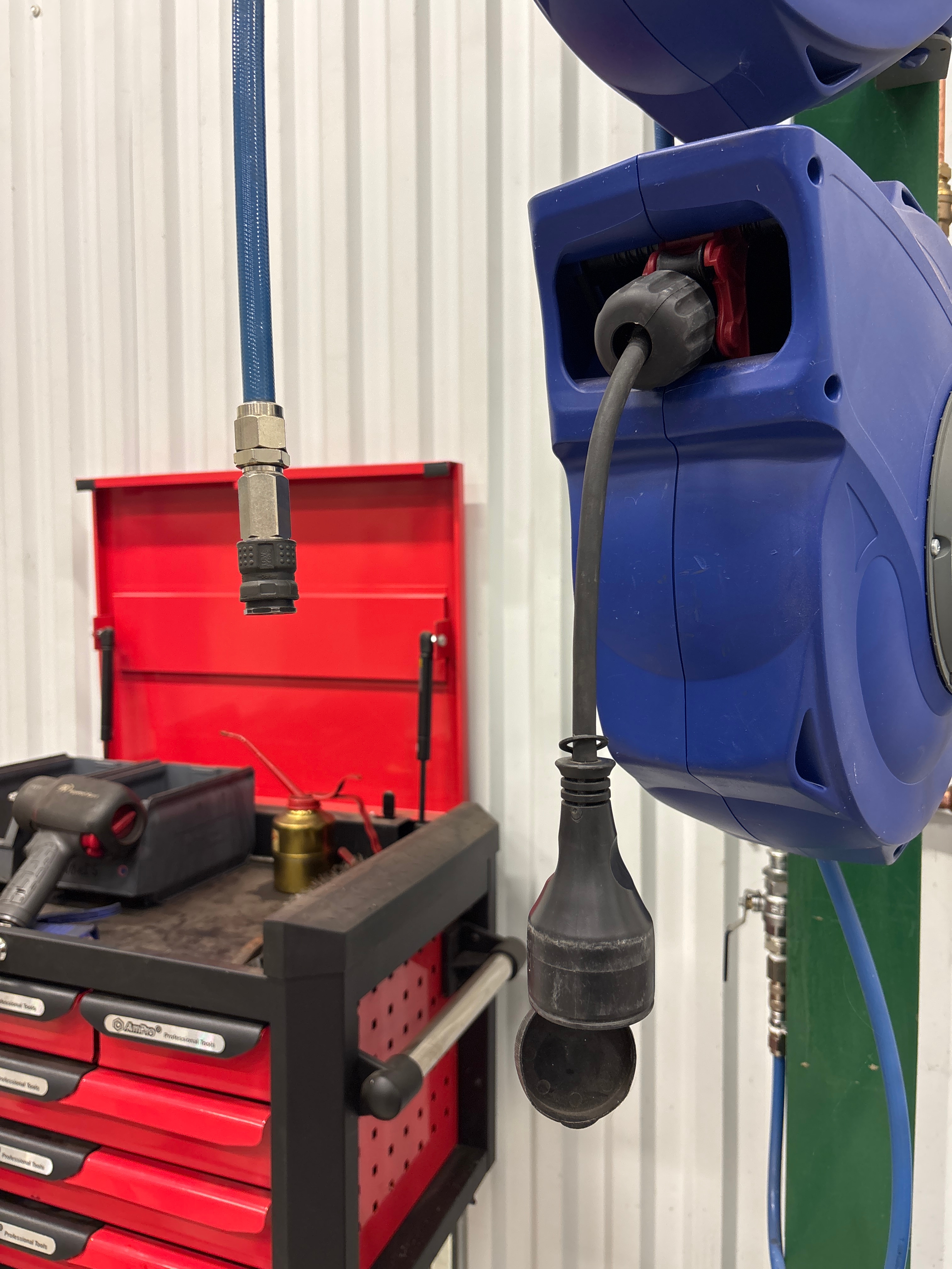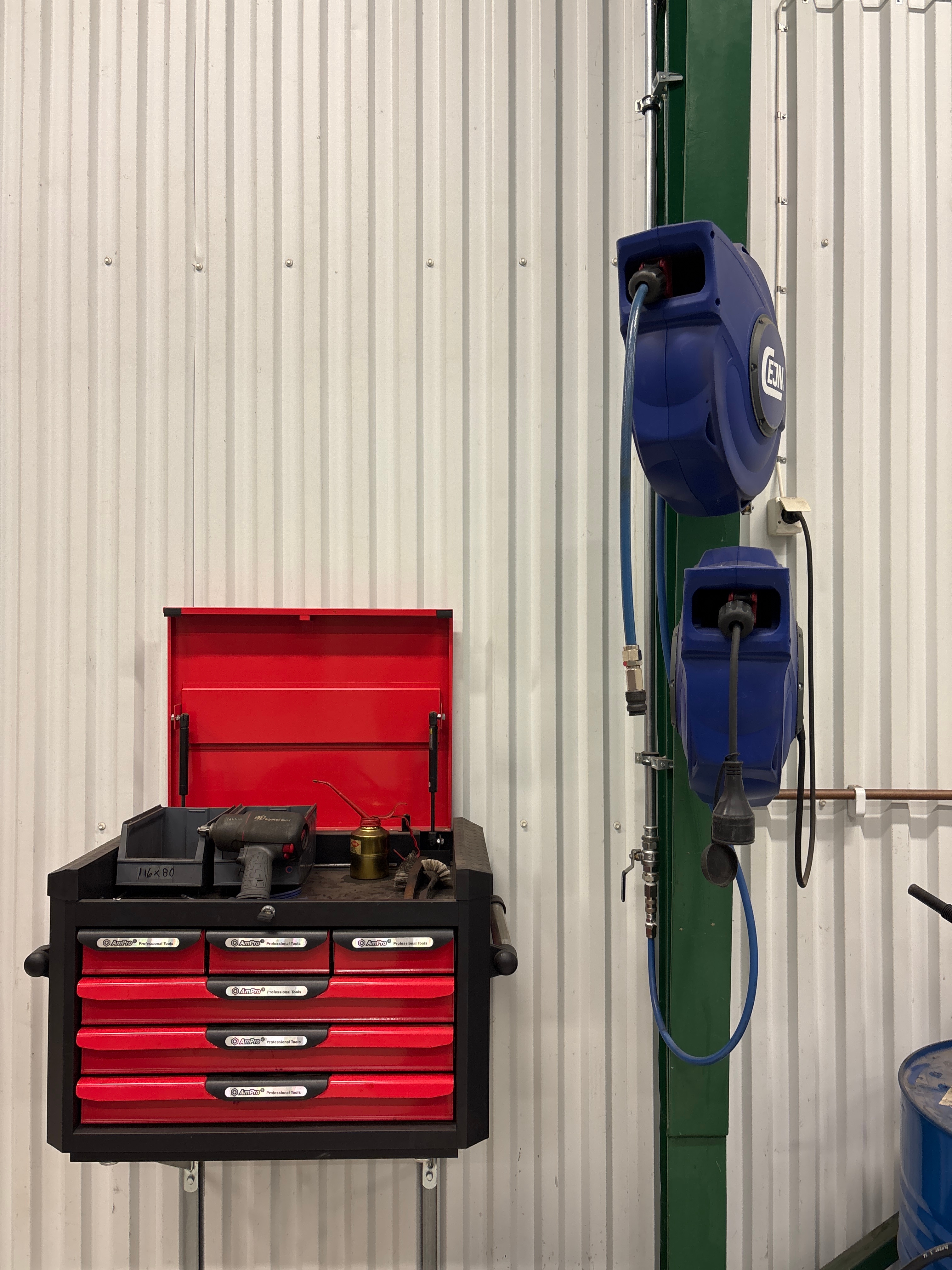 Slangvindor och verktygsskåp med innehåll