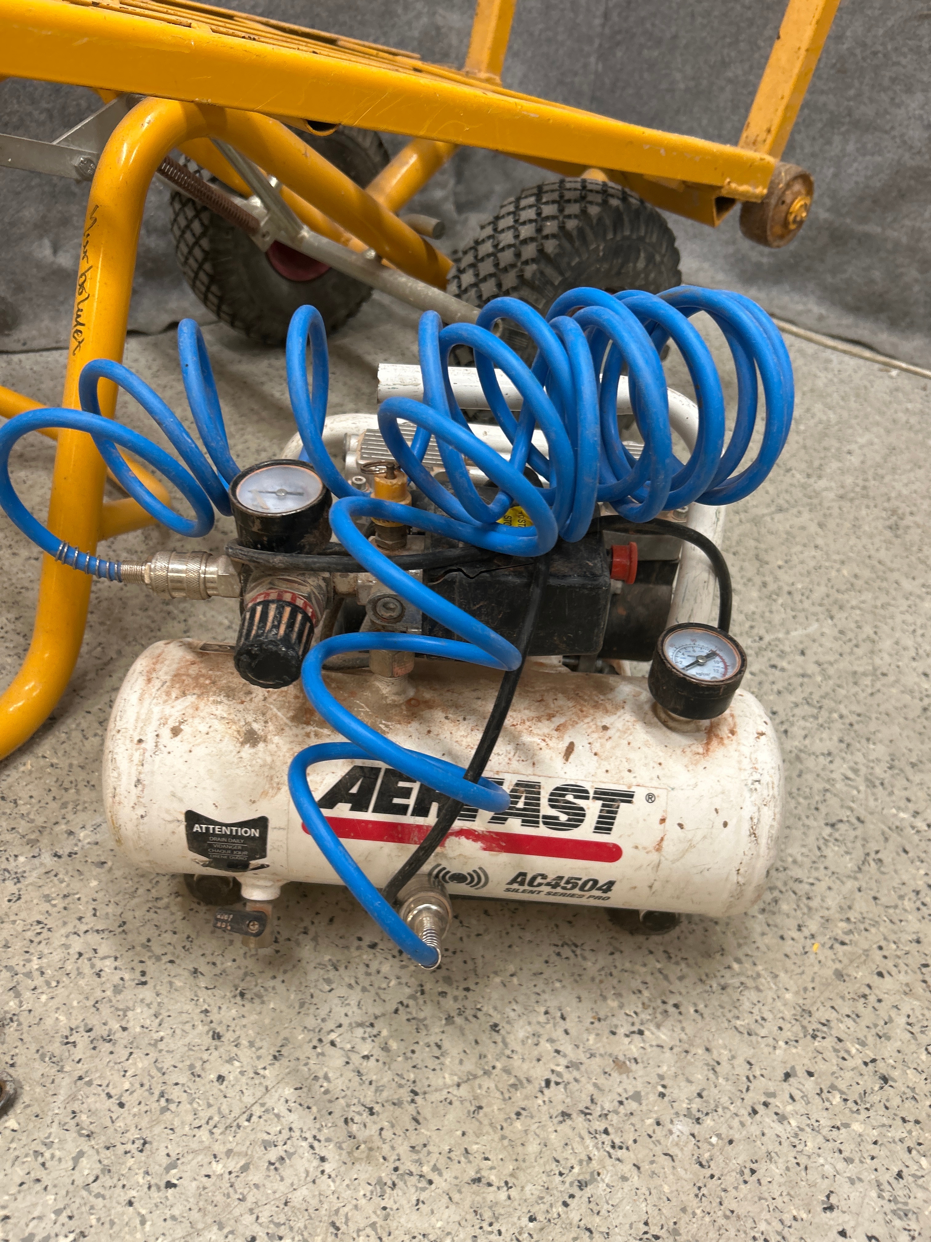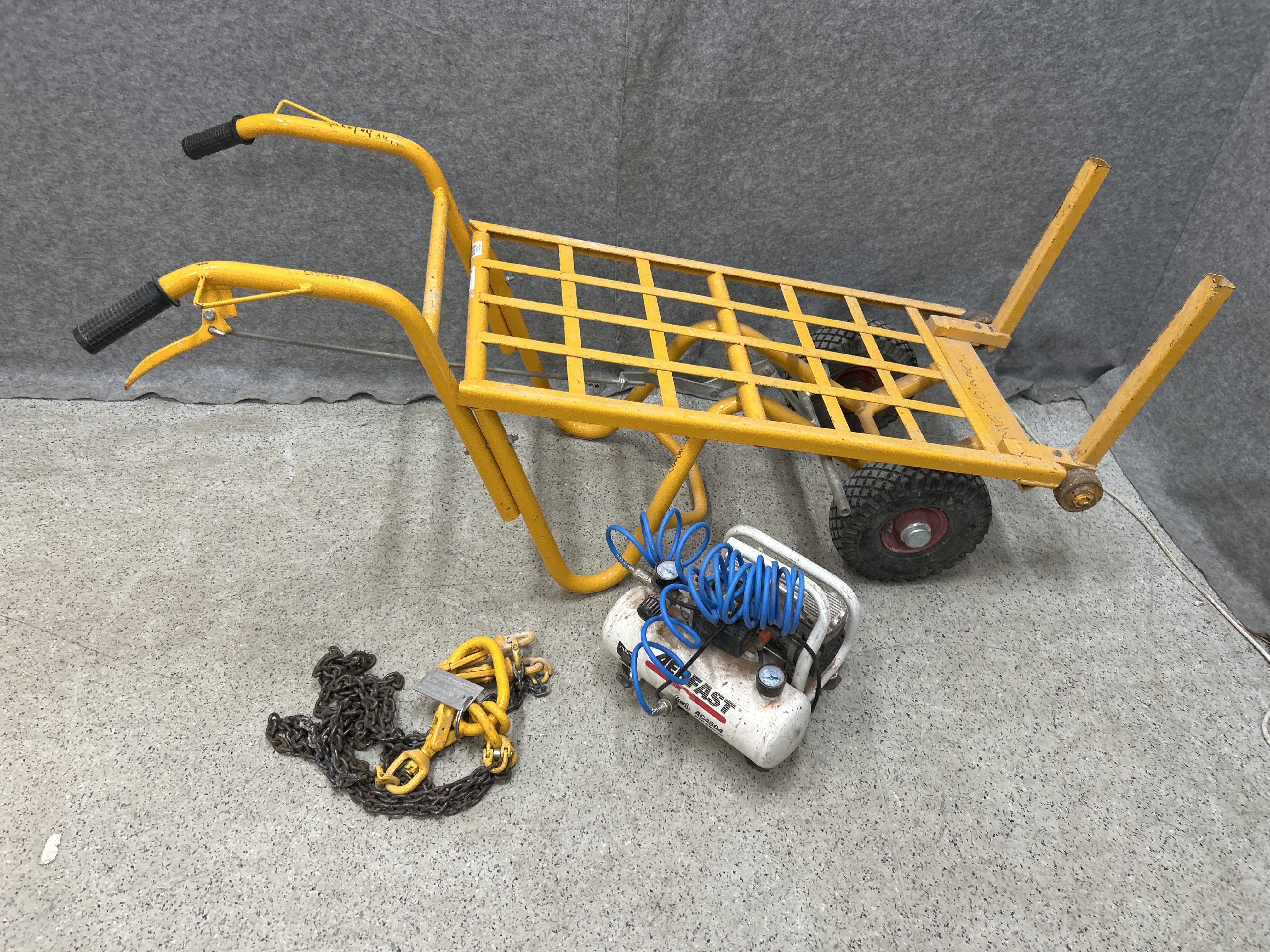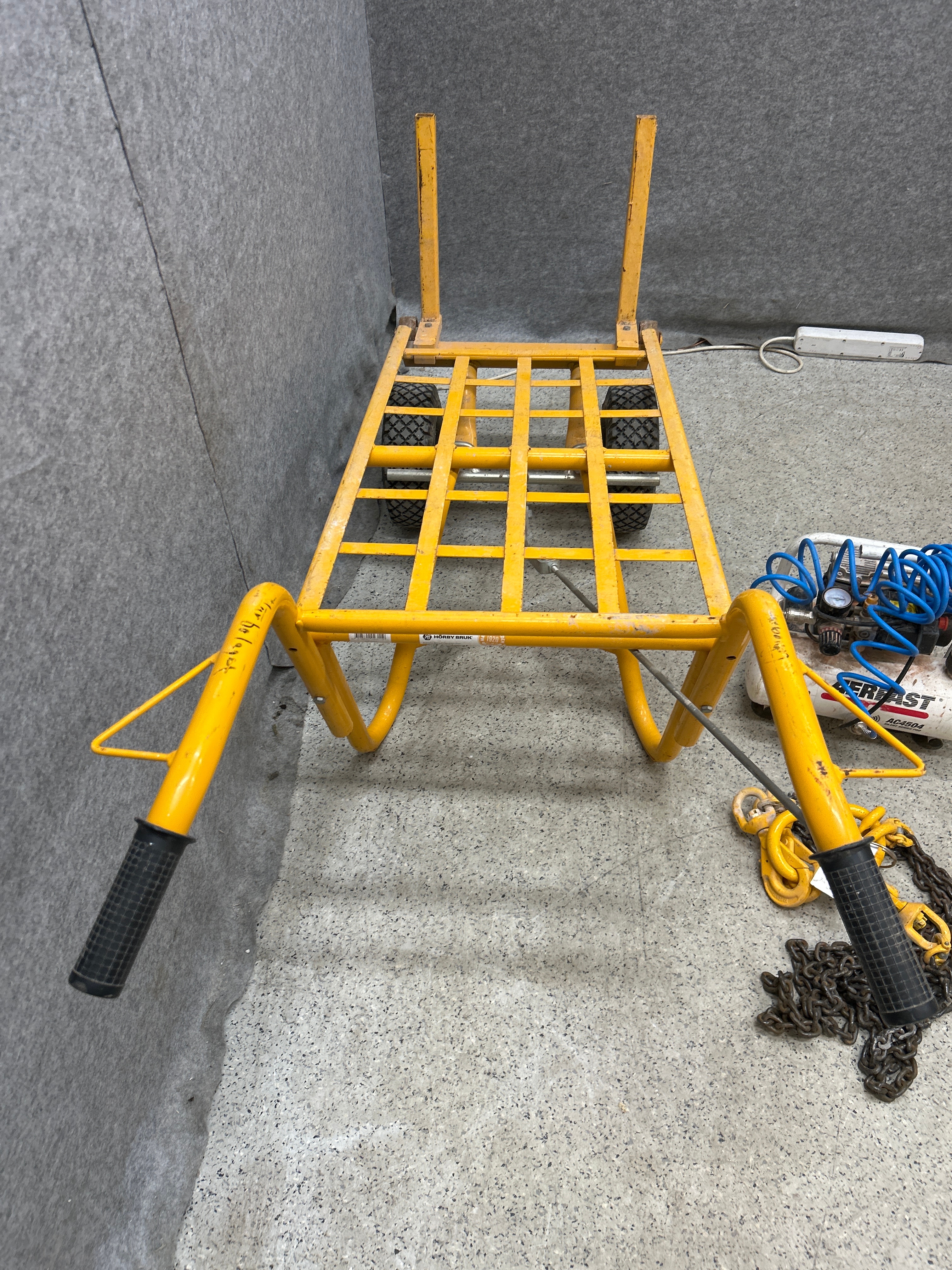 Tegelkärra, kompressor och surrningskätting - Hörby Bruk, Aerfast m.fl.