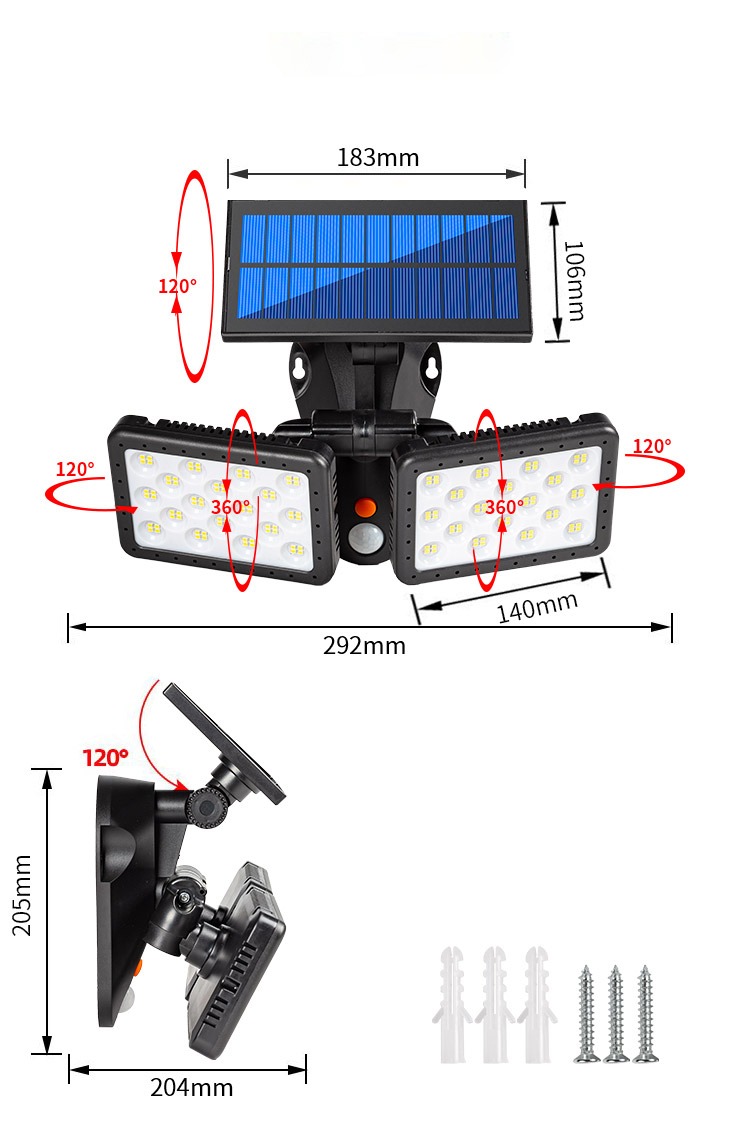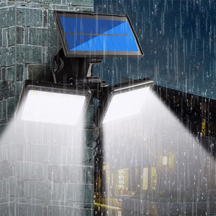 Belysning, solcell med dubbla strålkastare, solcellsladdning och rörelsesenor