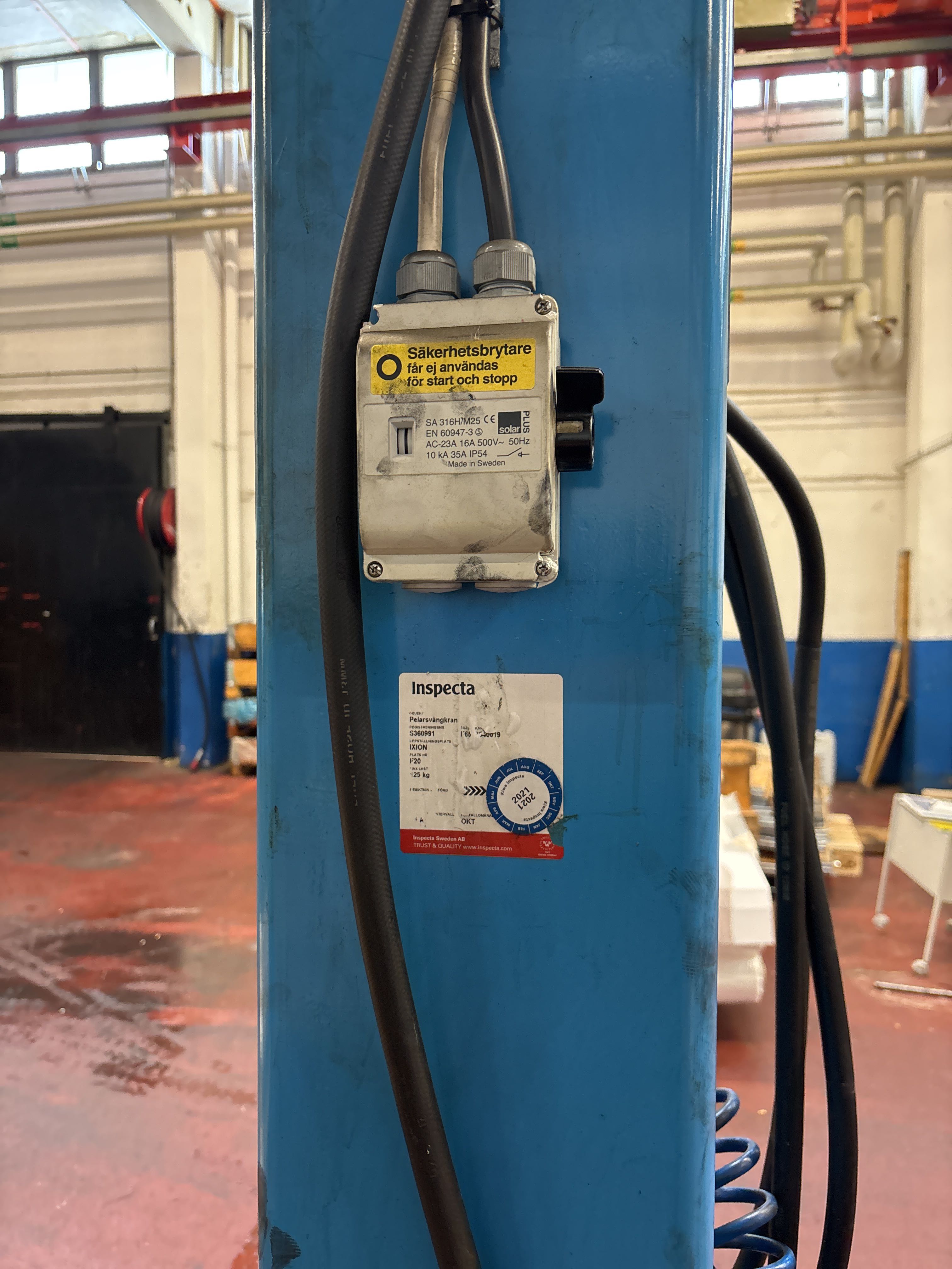 Pelarsvängkran i stål med monterad el-telfer. Kranen är avsedd för lättare lyft och hantering av gods inom industri- och verkstadsmiljö. Monterad i golv med svängbar arm.