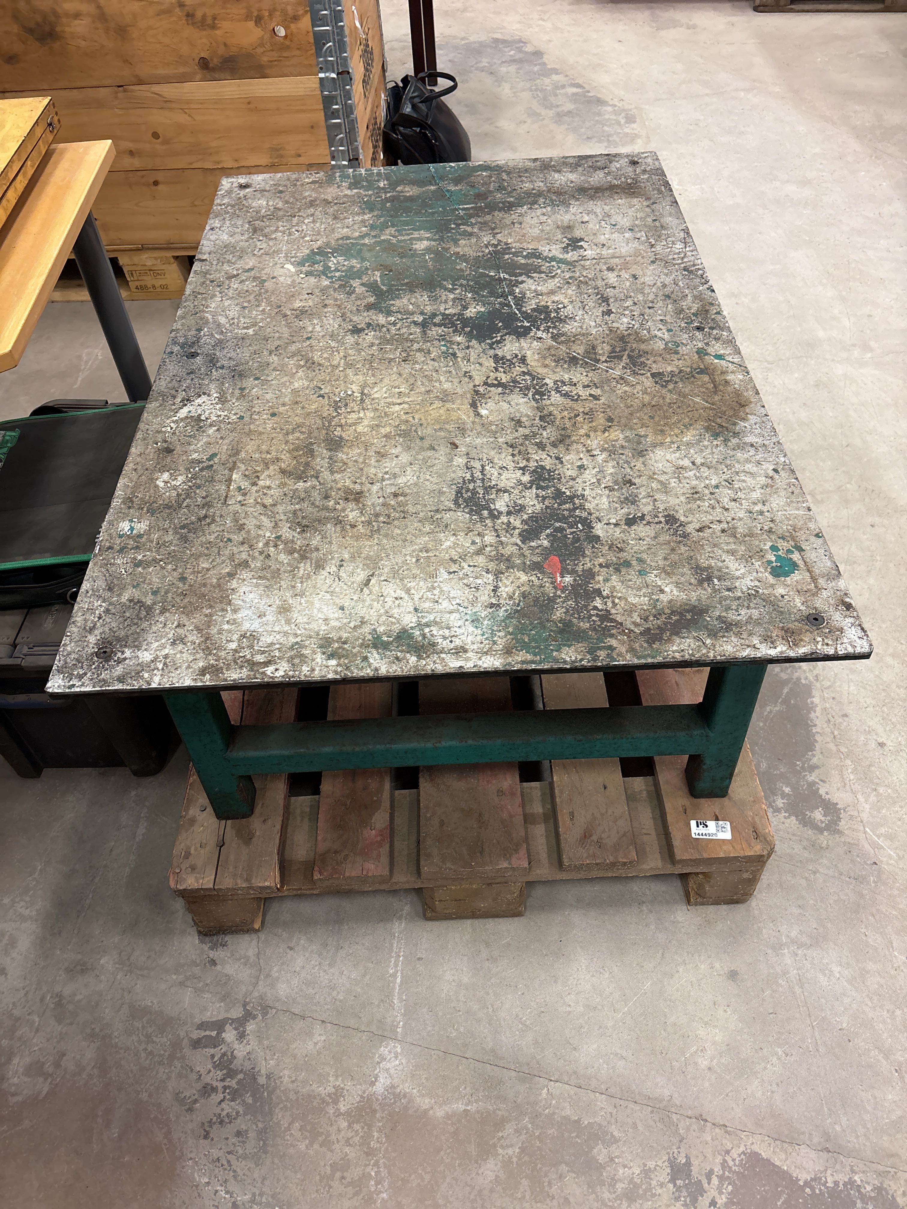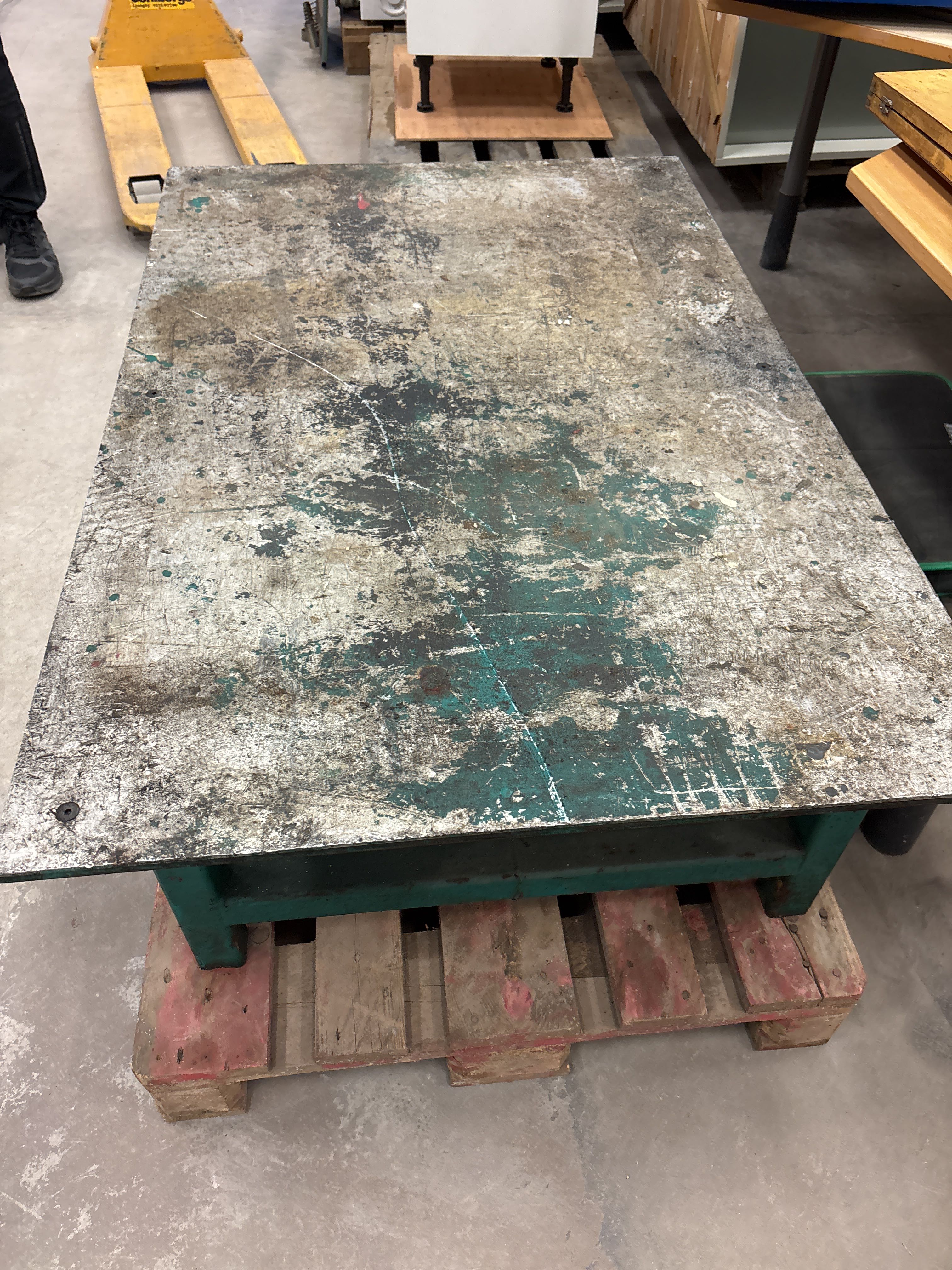 Bordet är relativt tungt och står stadigt. Tydliga bruksspår förekommer i form av slitage, repor och färgfläckar på bordsskivan, vilket är normalt för typen av arbetsbord.