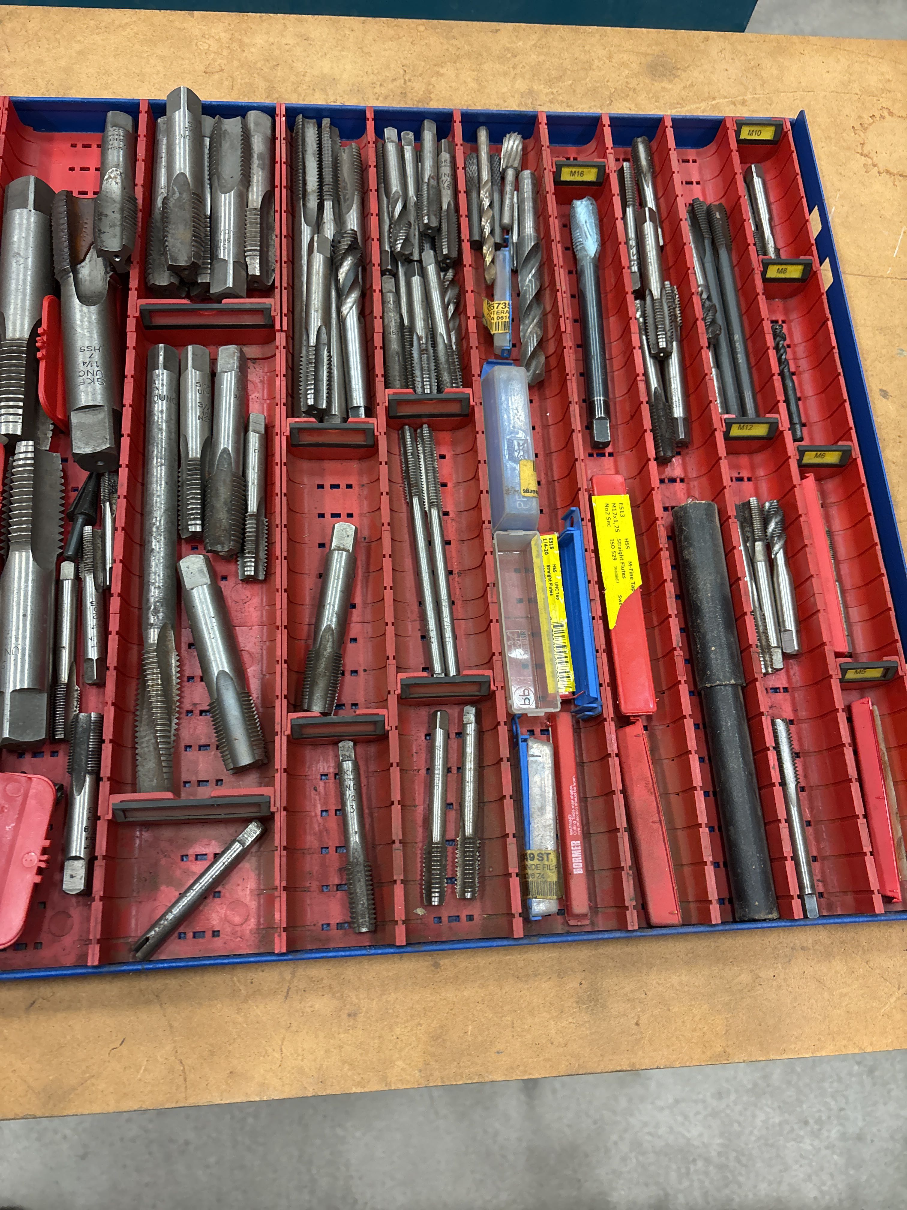 Stort sortiment av gängtappar i olika dimensioner och utföranden, förvarade i praktiska plastbackar.