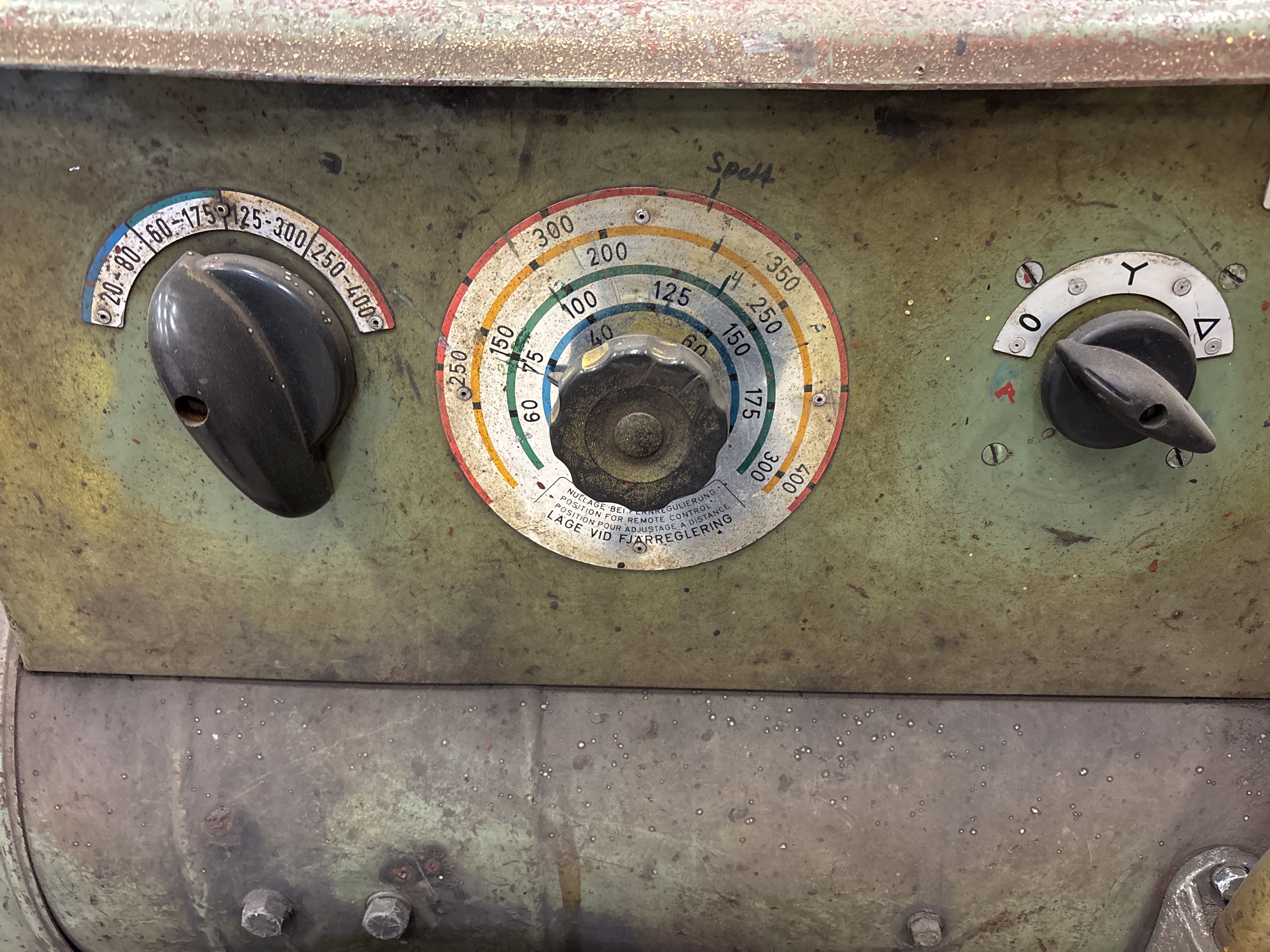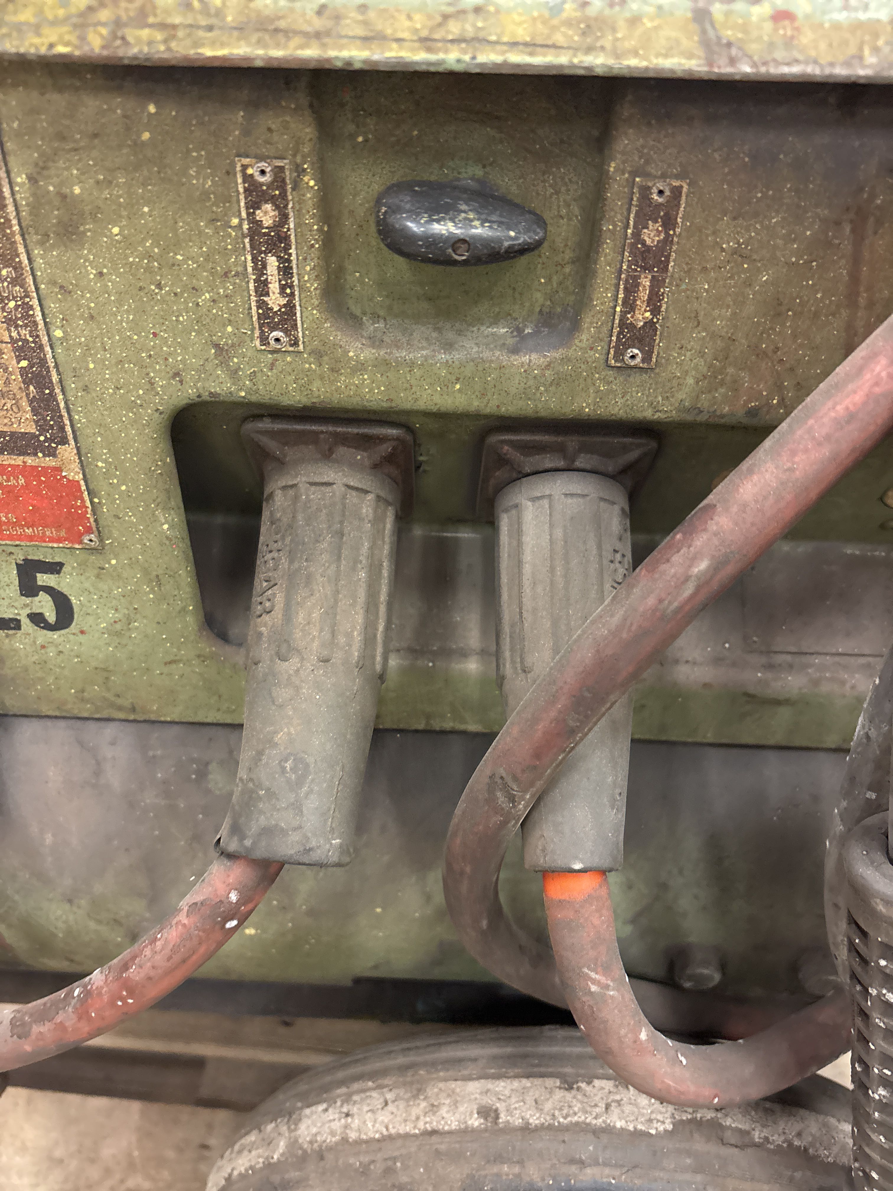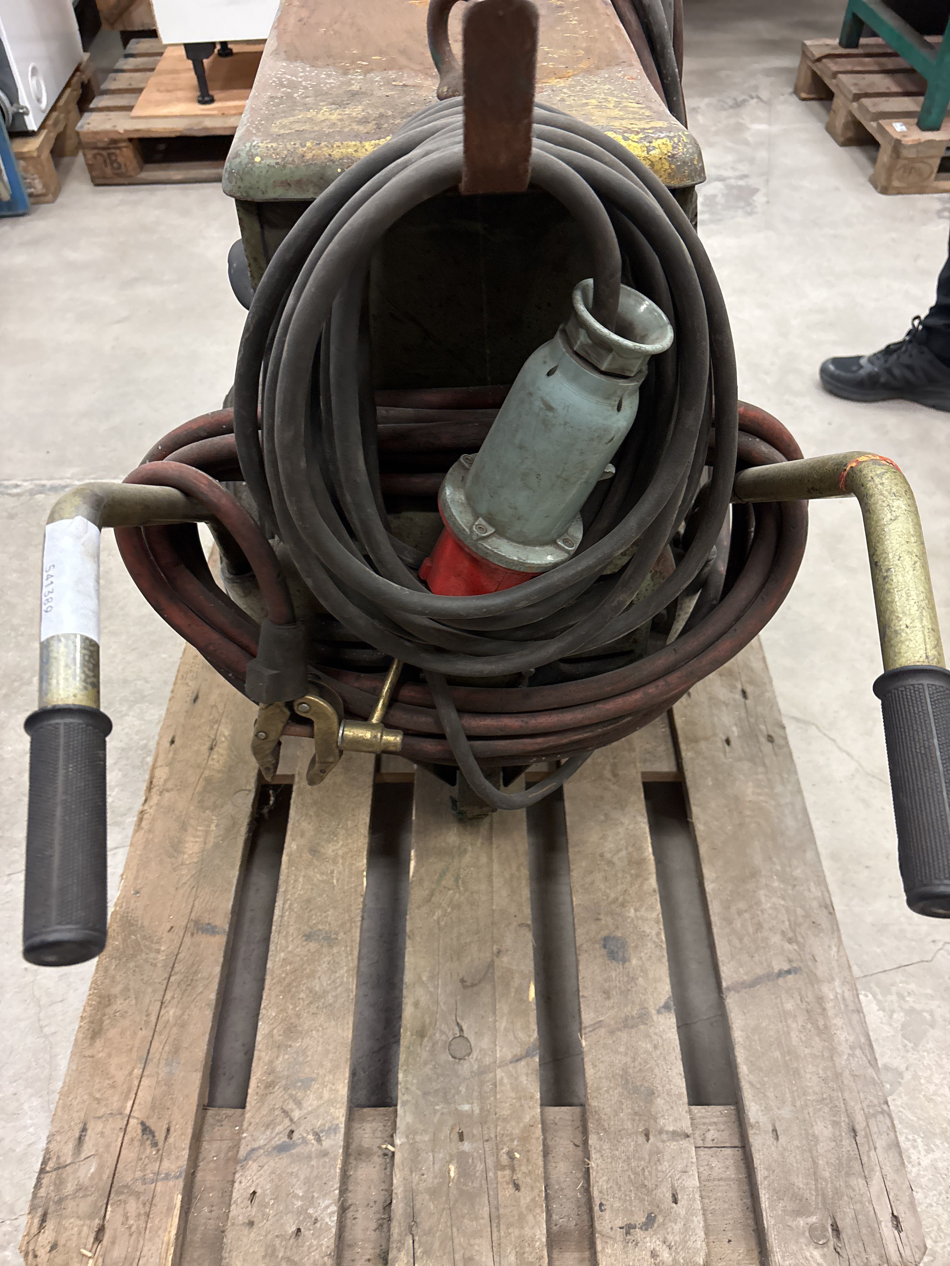 Utrustad med grova svetskablar samt justeringsreglage på fronten. Typskylt enligt bilder. Skick enligt foton – tydligt bruksslitage, rost och färgsläpp förekommer. Funktion ej testad i samband med dokumentation.