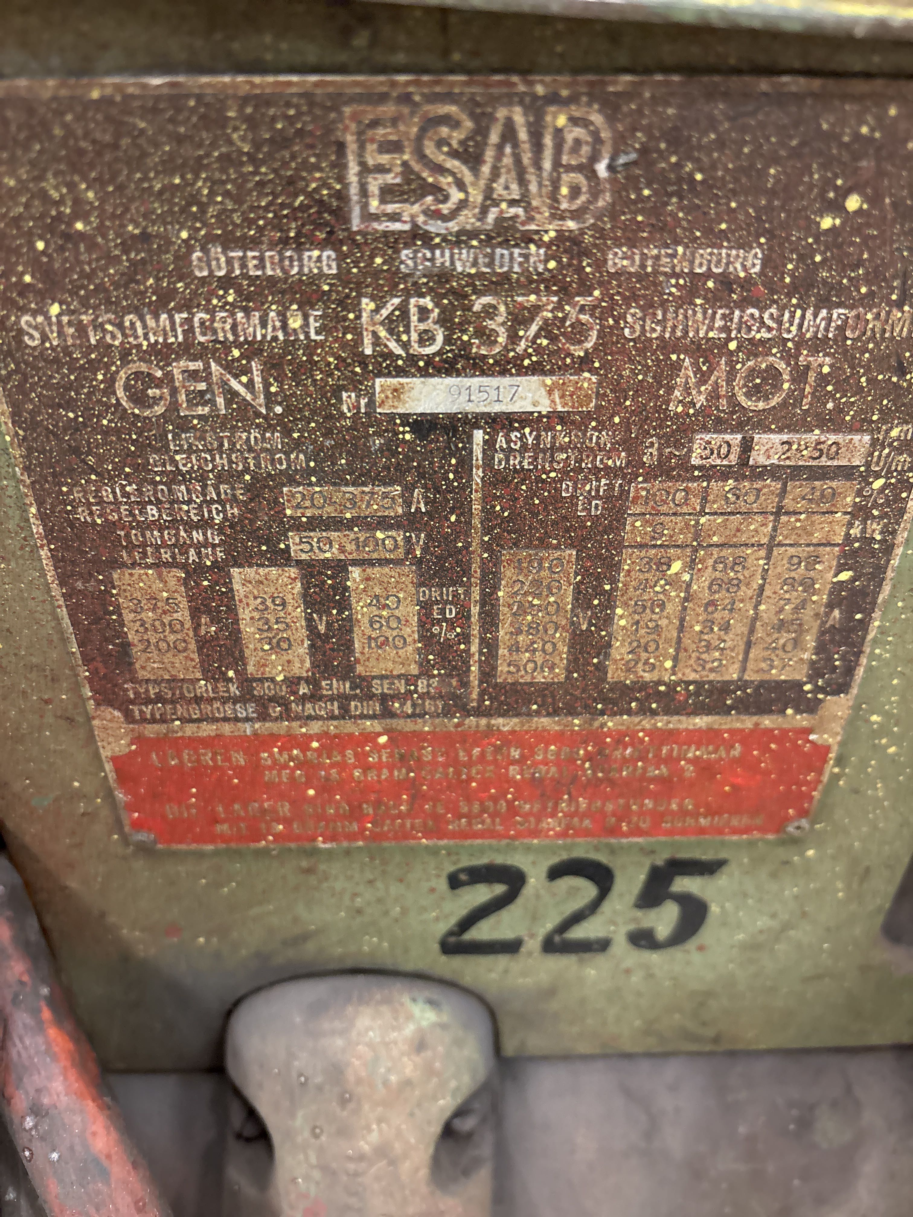 Äldre, kraftig svetsomformare från ESAB, modell KB 375, monterad på hjulvagn för enkel förflyttning. Maskinen är av äldre industrityp och lämpar sig för verkstad, reparation eller som reserv-/projektmaskin.