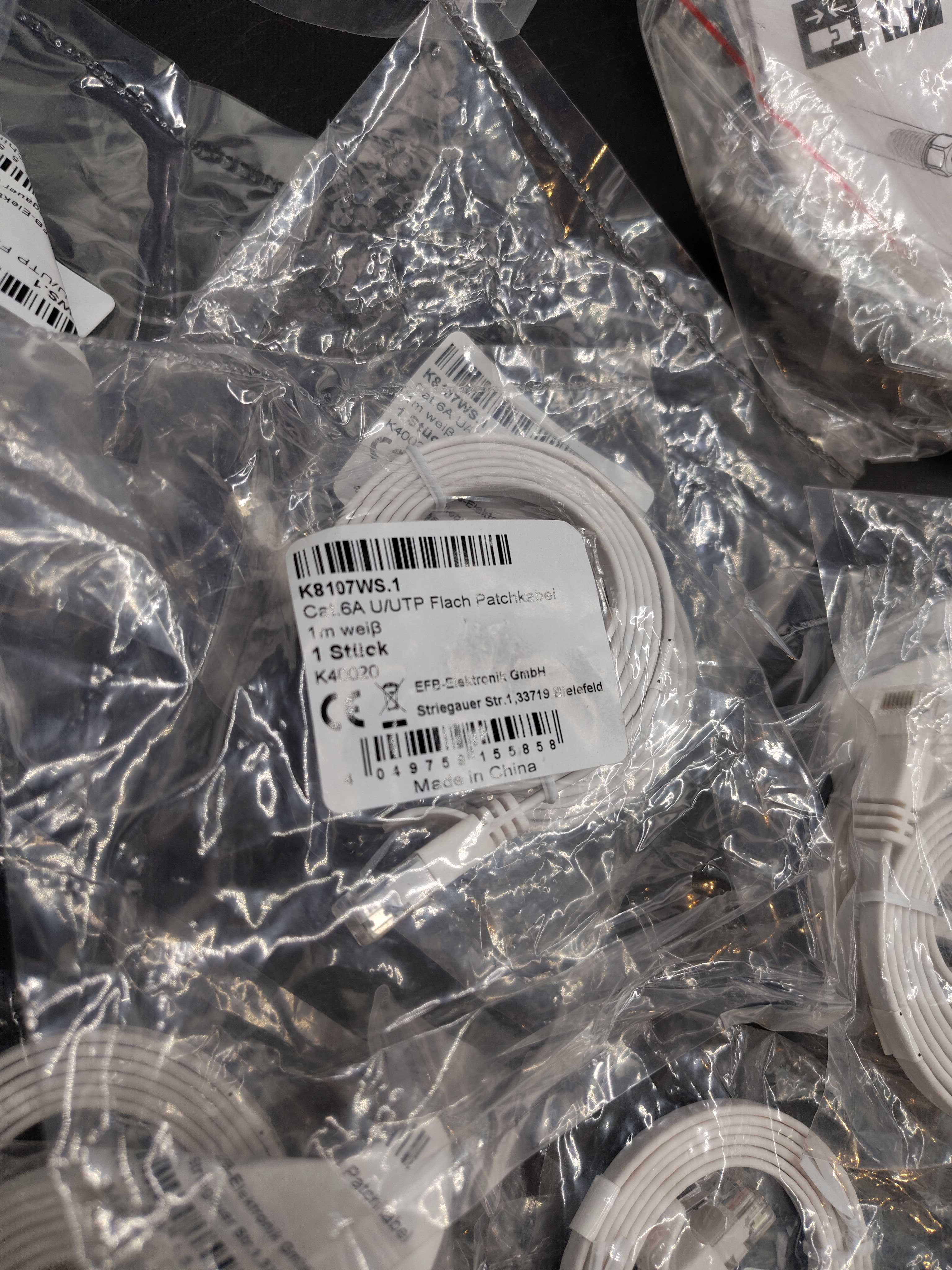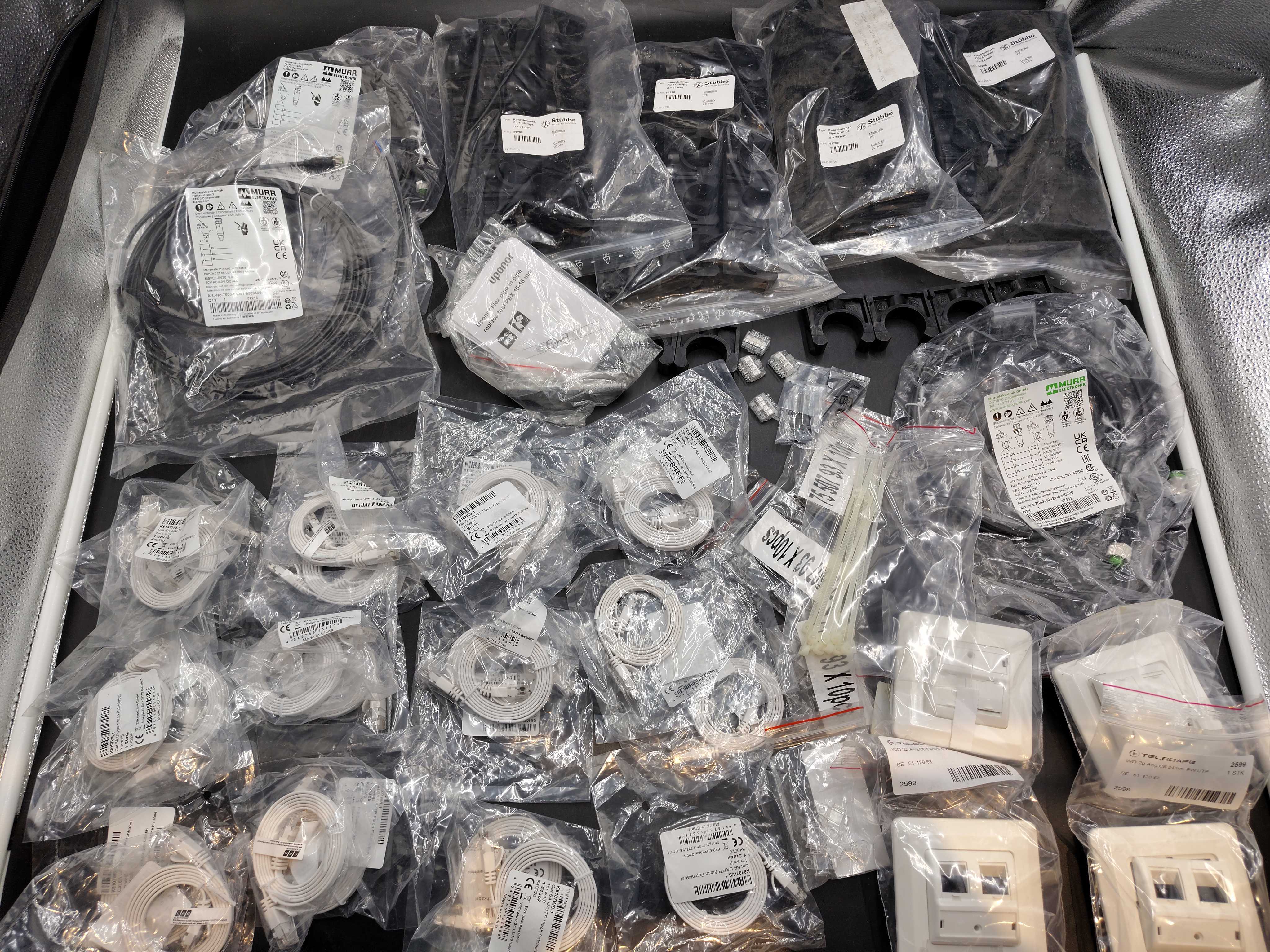 Materialet omfattar ett brett spann av installationsprodukter, från tunna UTP-patchkablar för nätverk till robusta M8/M12-kablar avsedda för automationsutrustning. Dessutom ingår RJ45-uttag för väggmontage samt rörklammer för rörinstallation. Delarna är individuellt förpackade.