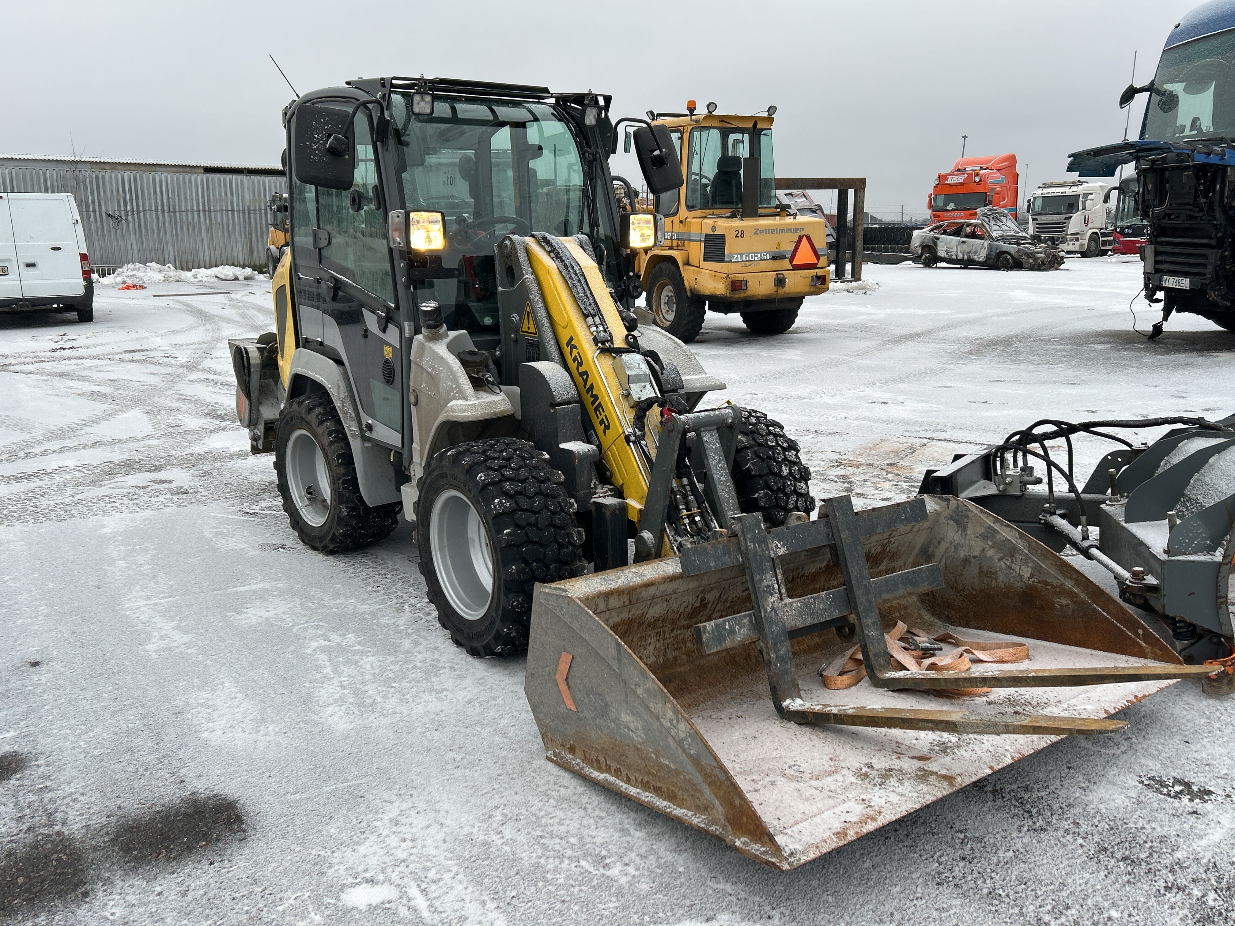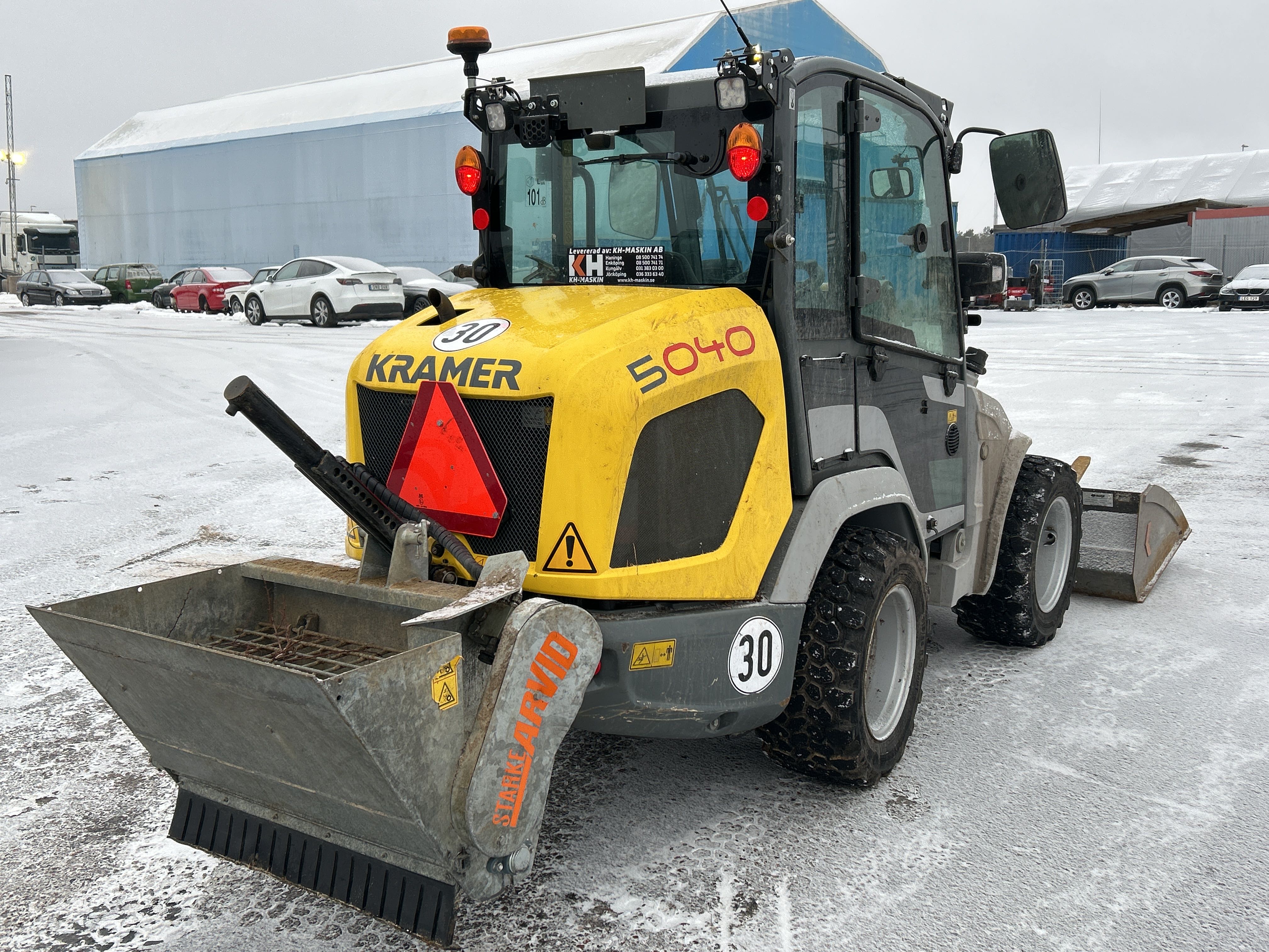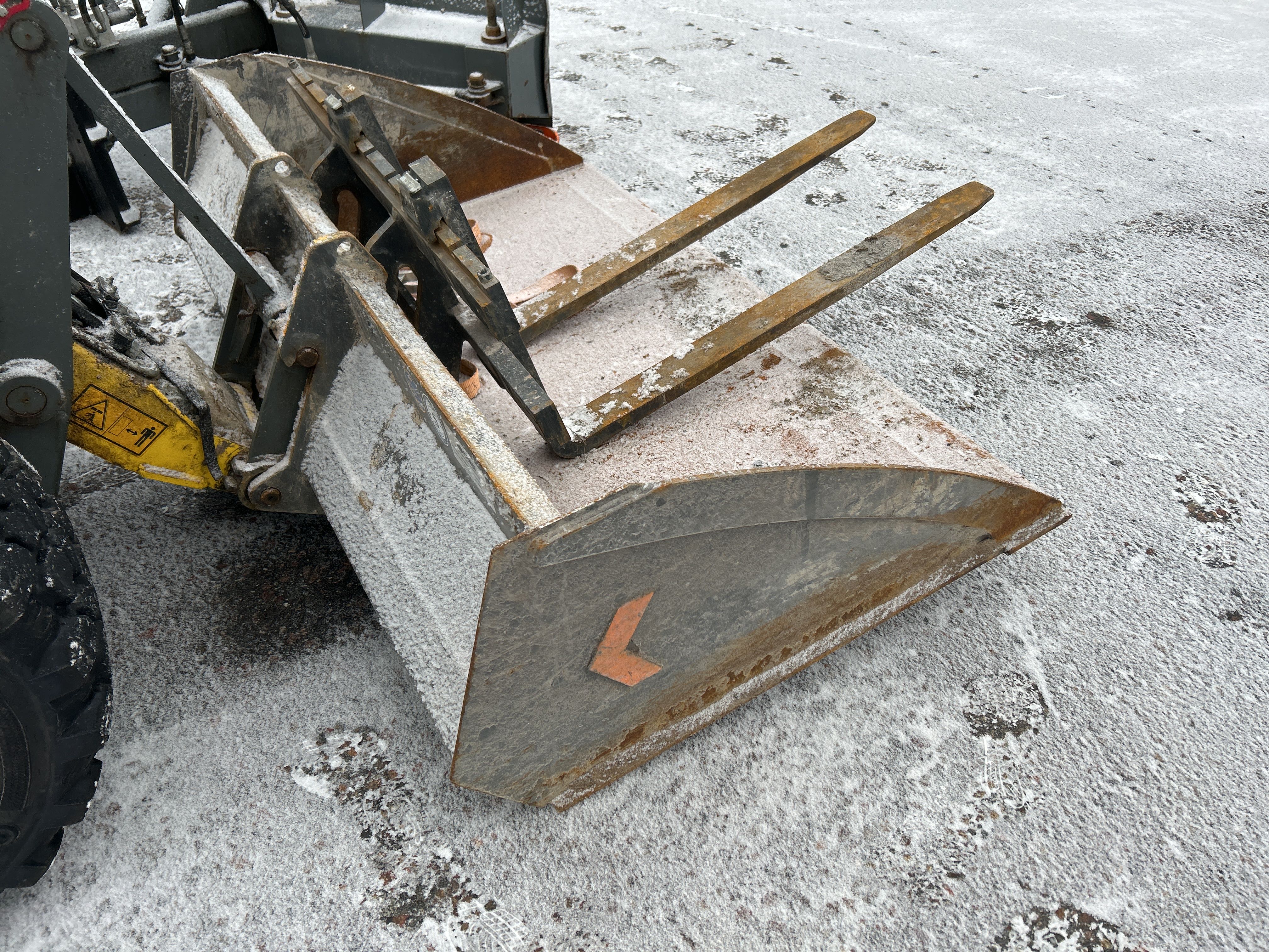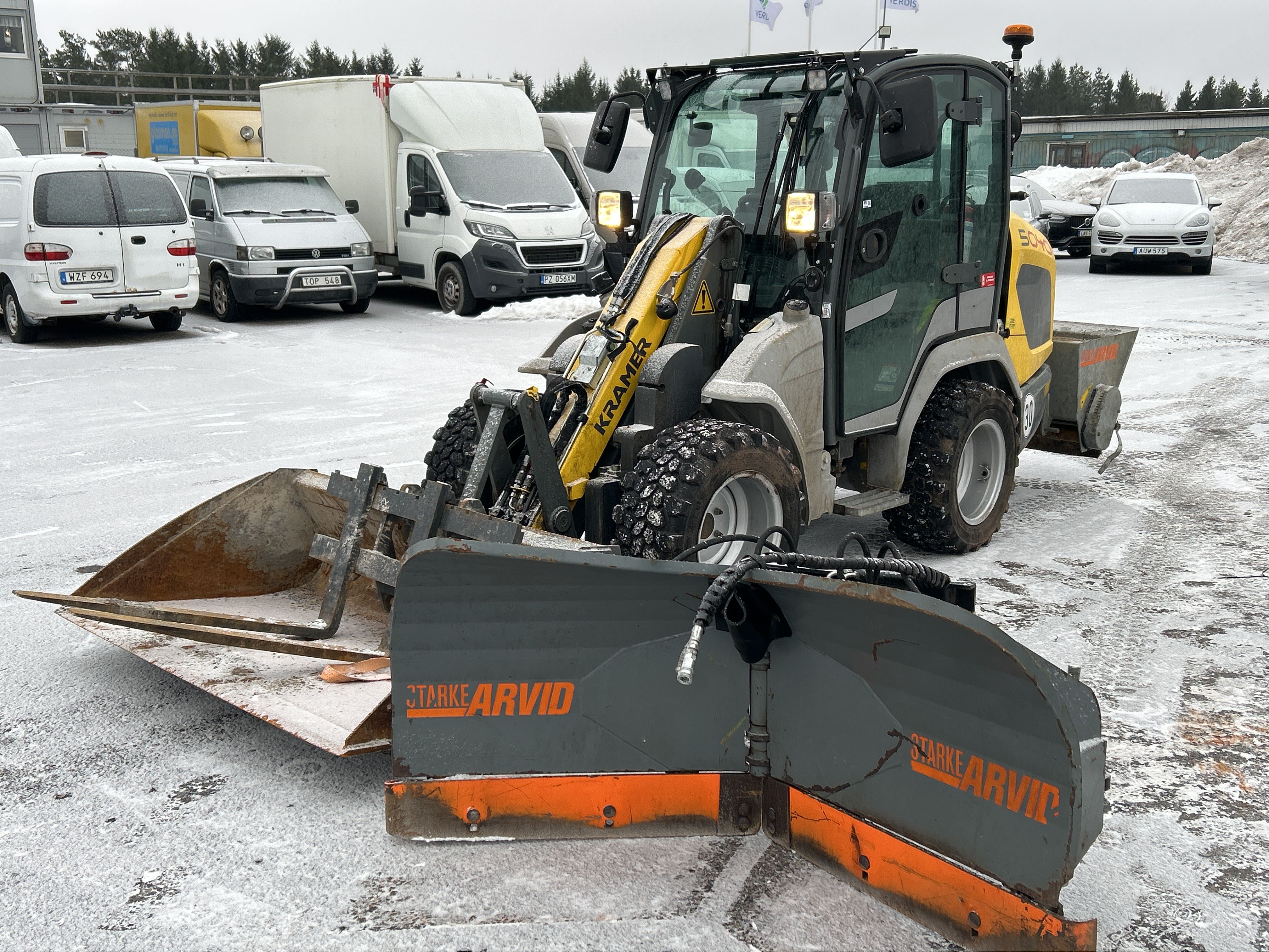 Kompaktlastare Kramer 5040 med skopa, gafflar, vikplog & sandspridare