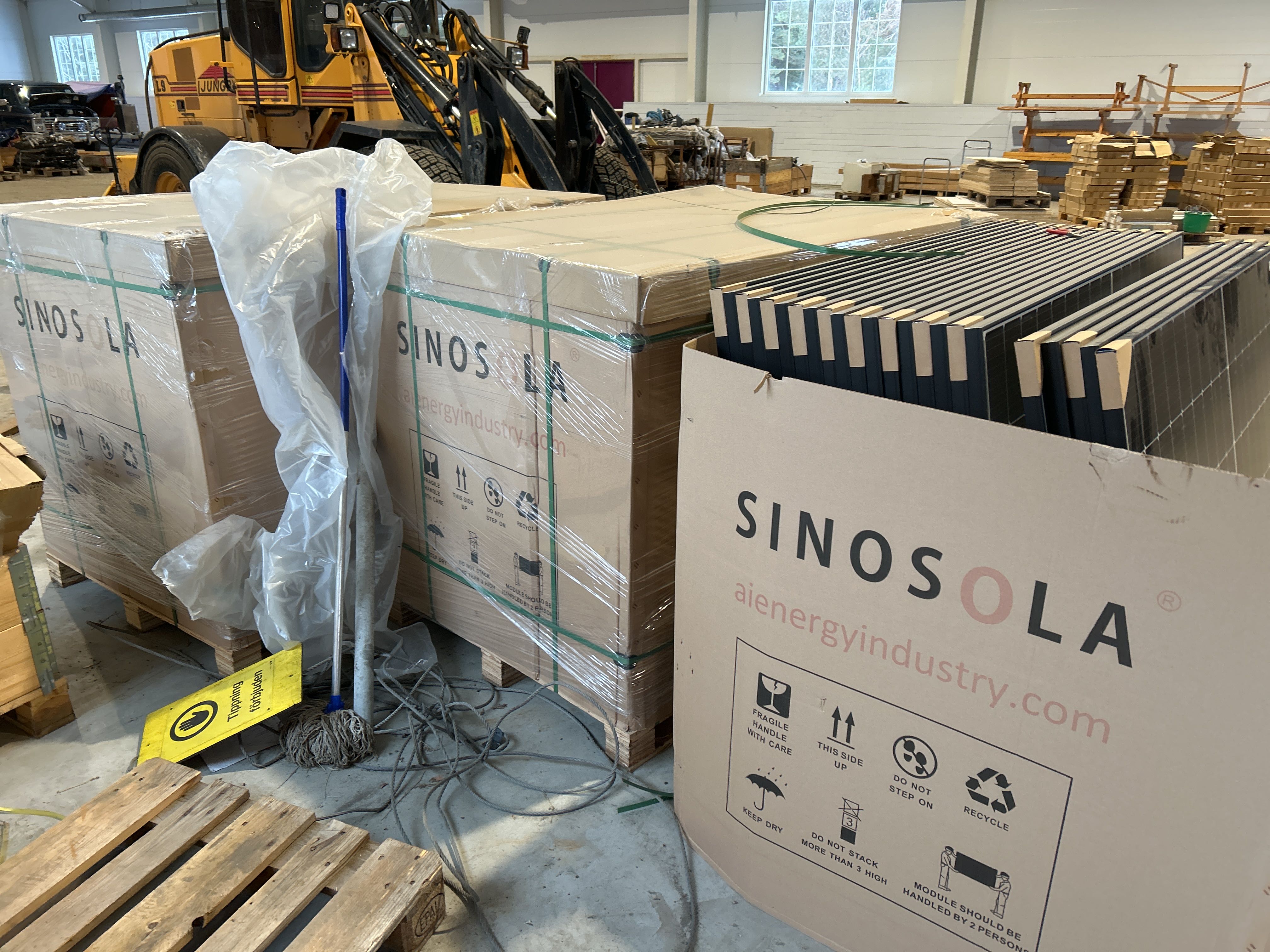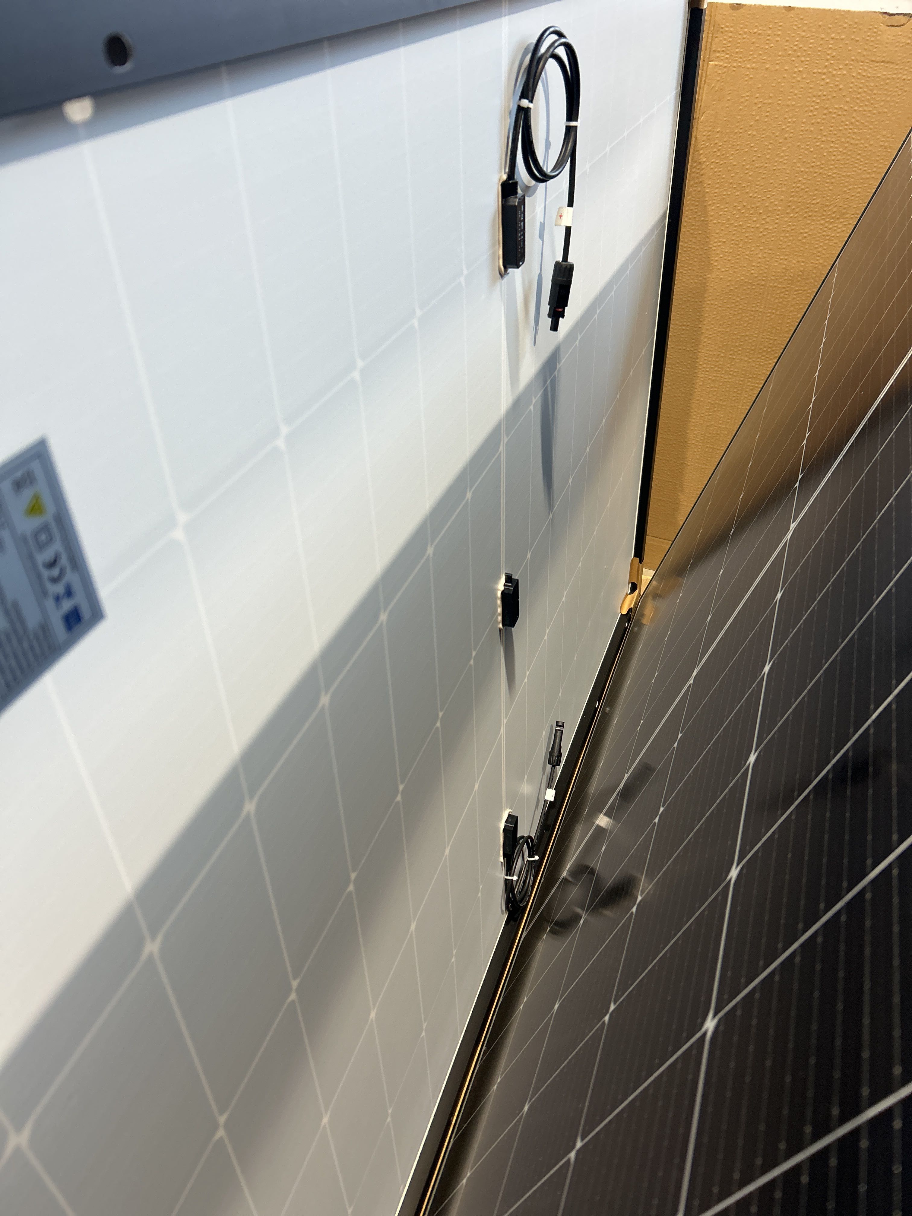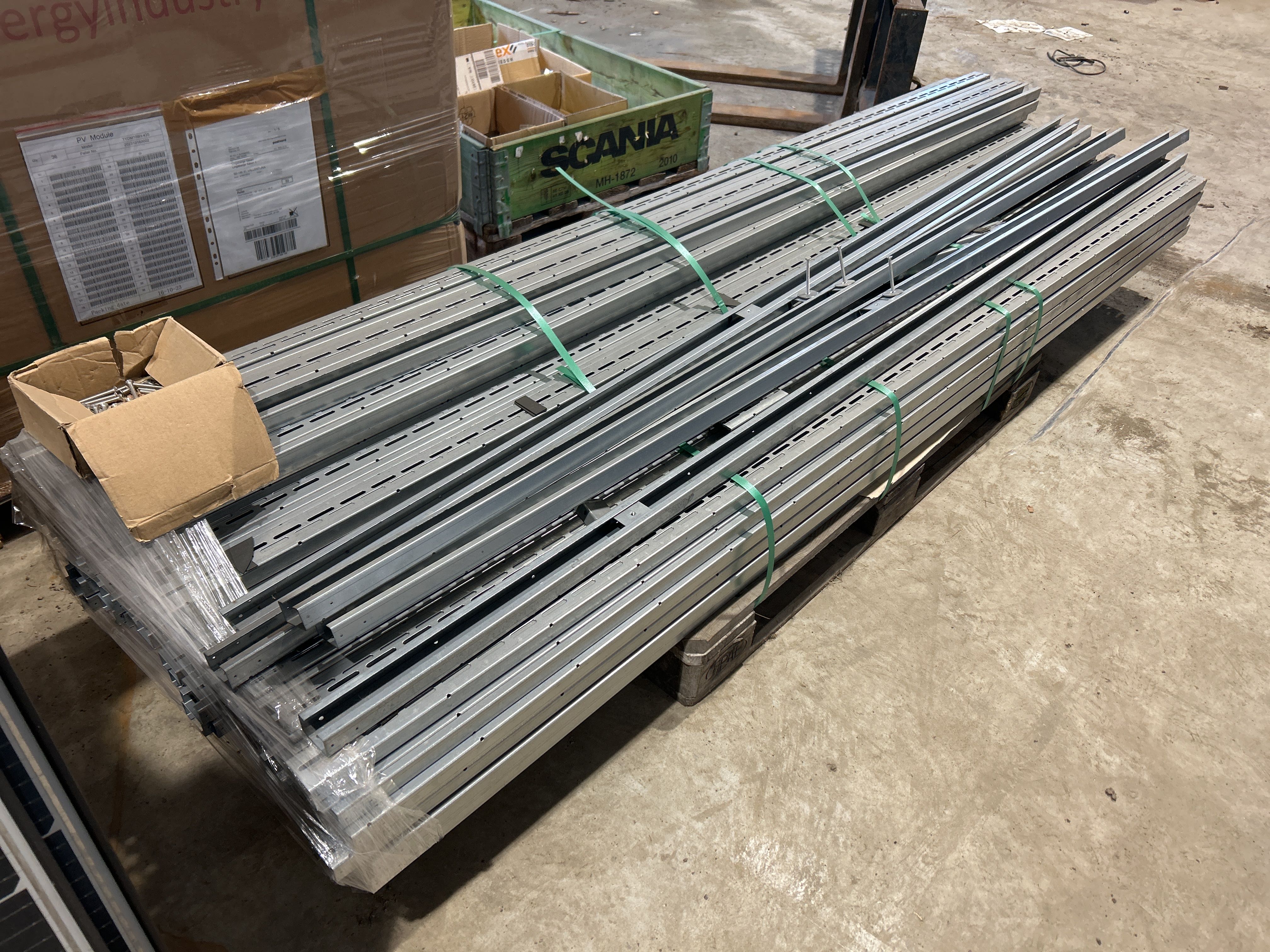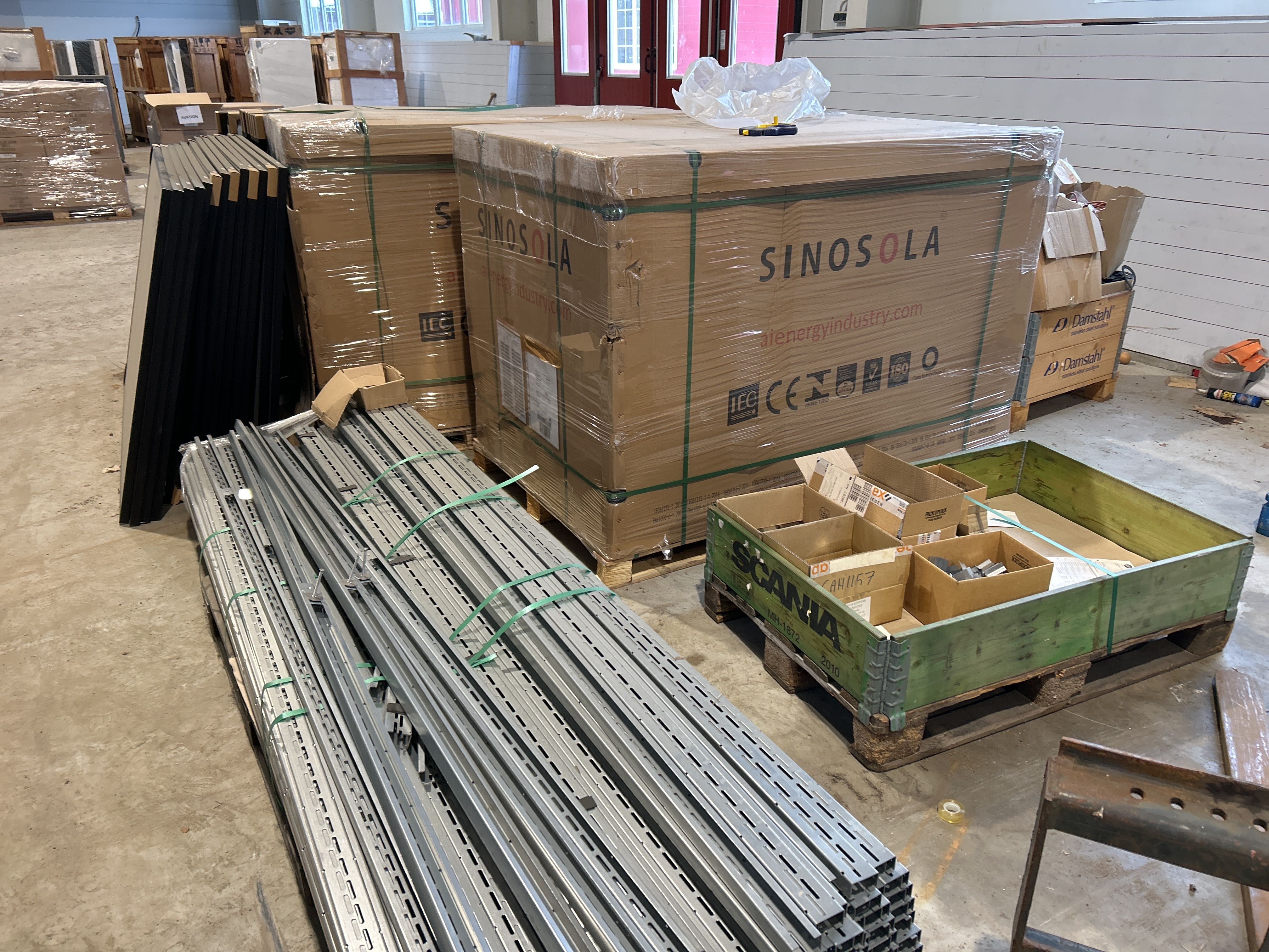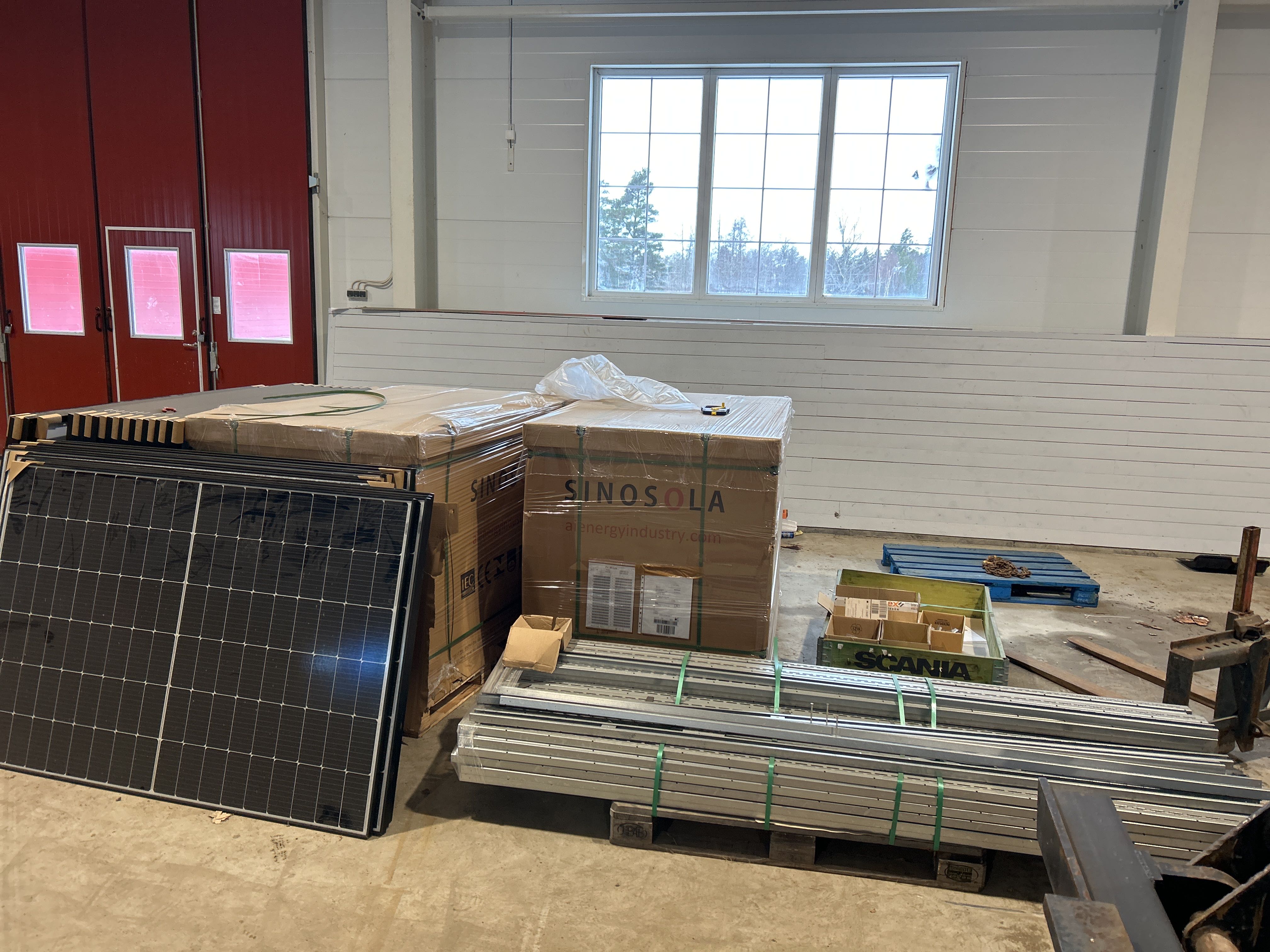 • Solcellspaneler med tillhörande monteringssystem. Panelerna är av modellen TYDM108H-435 från Sinosola med en nominell effekt på 435 W.