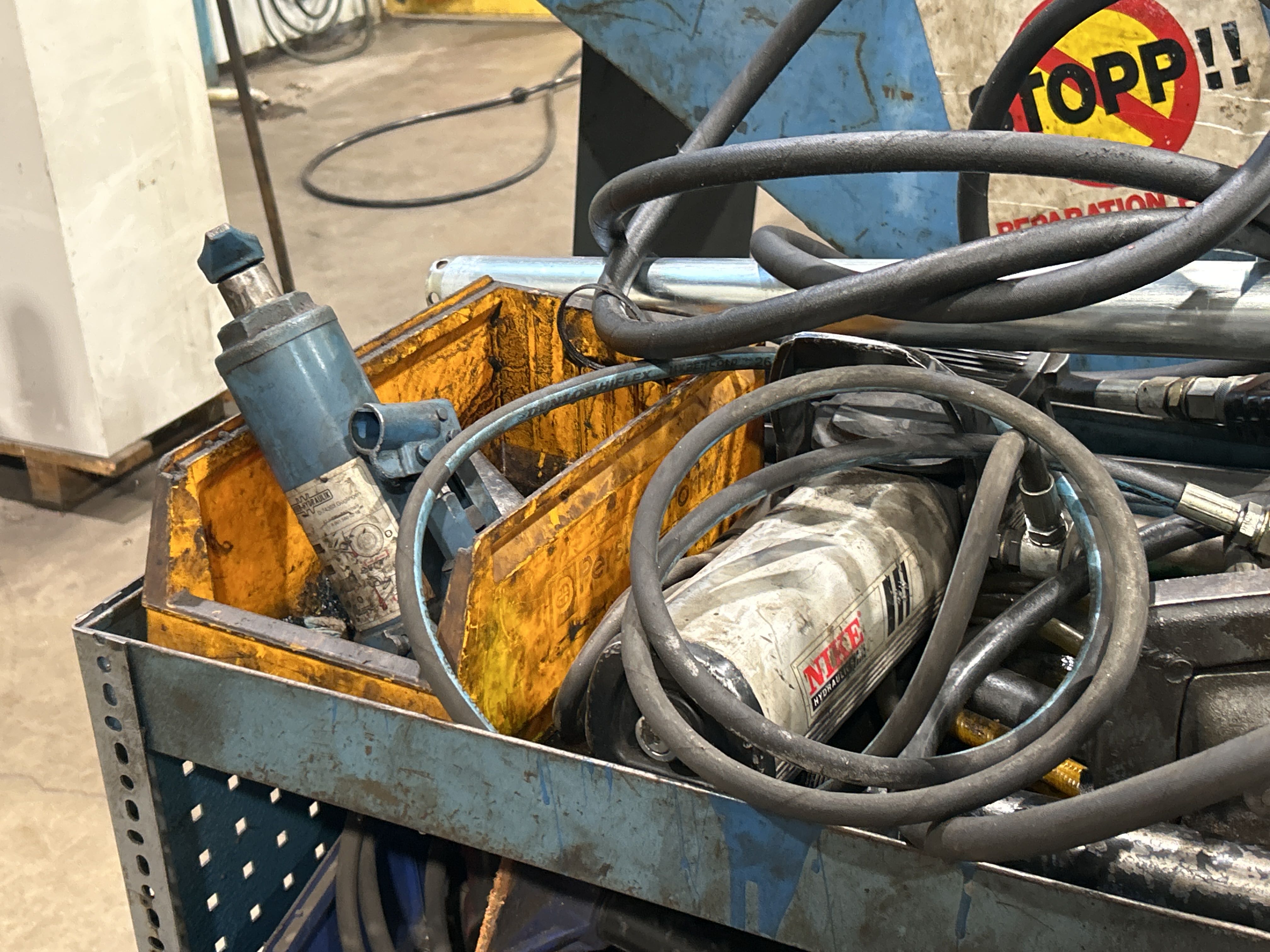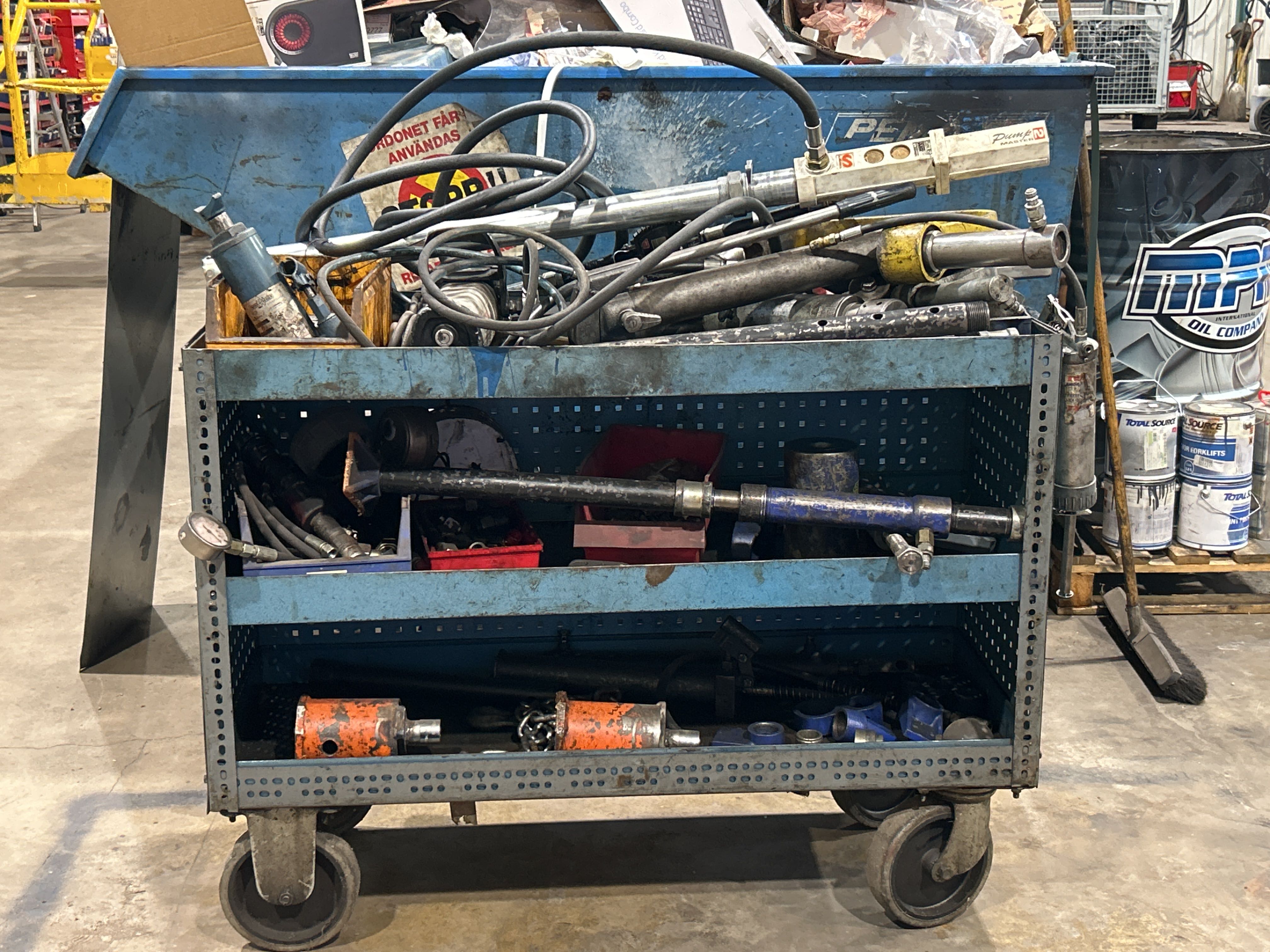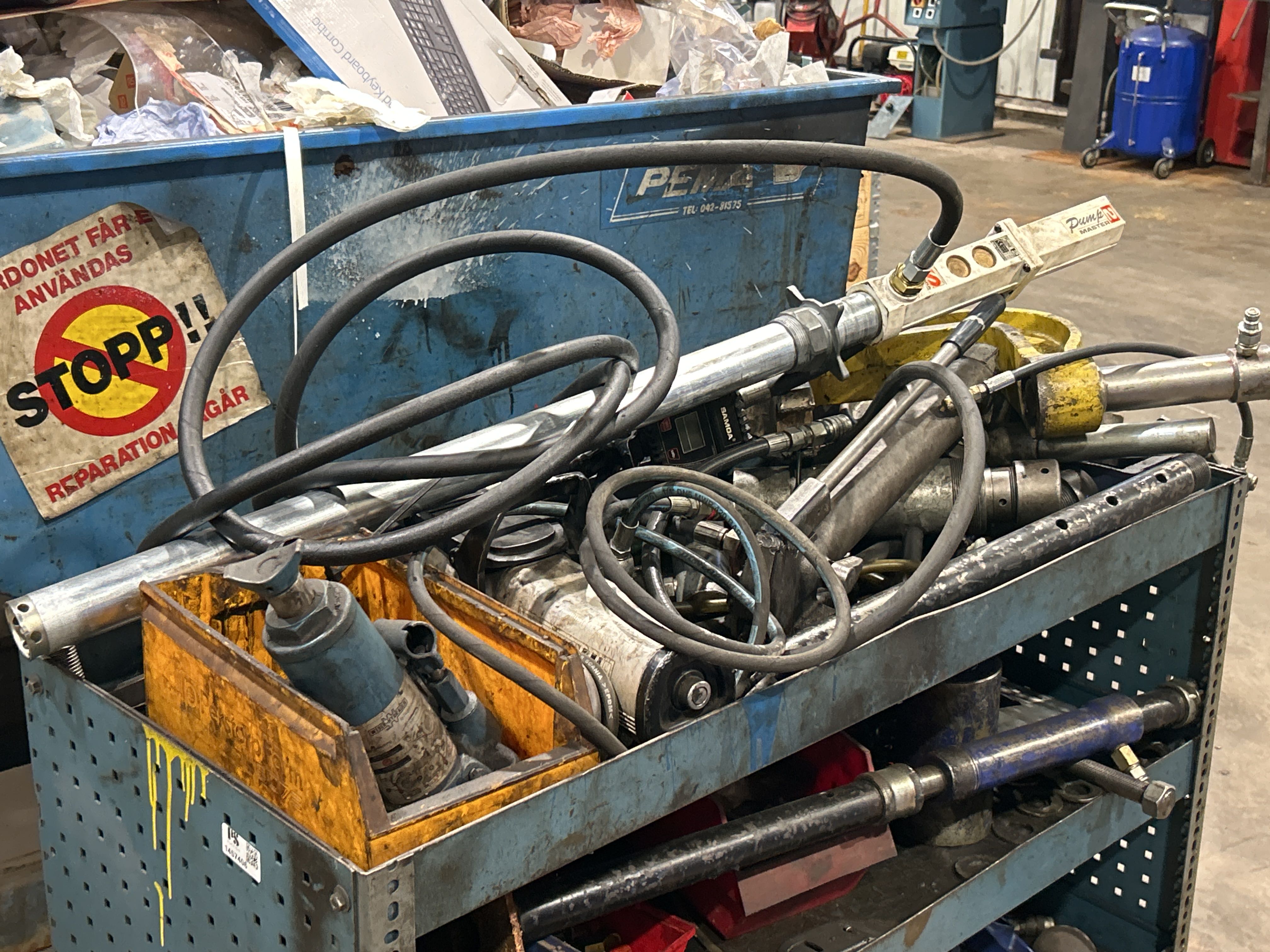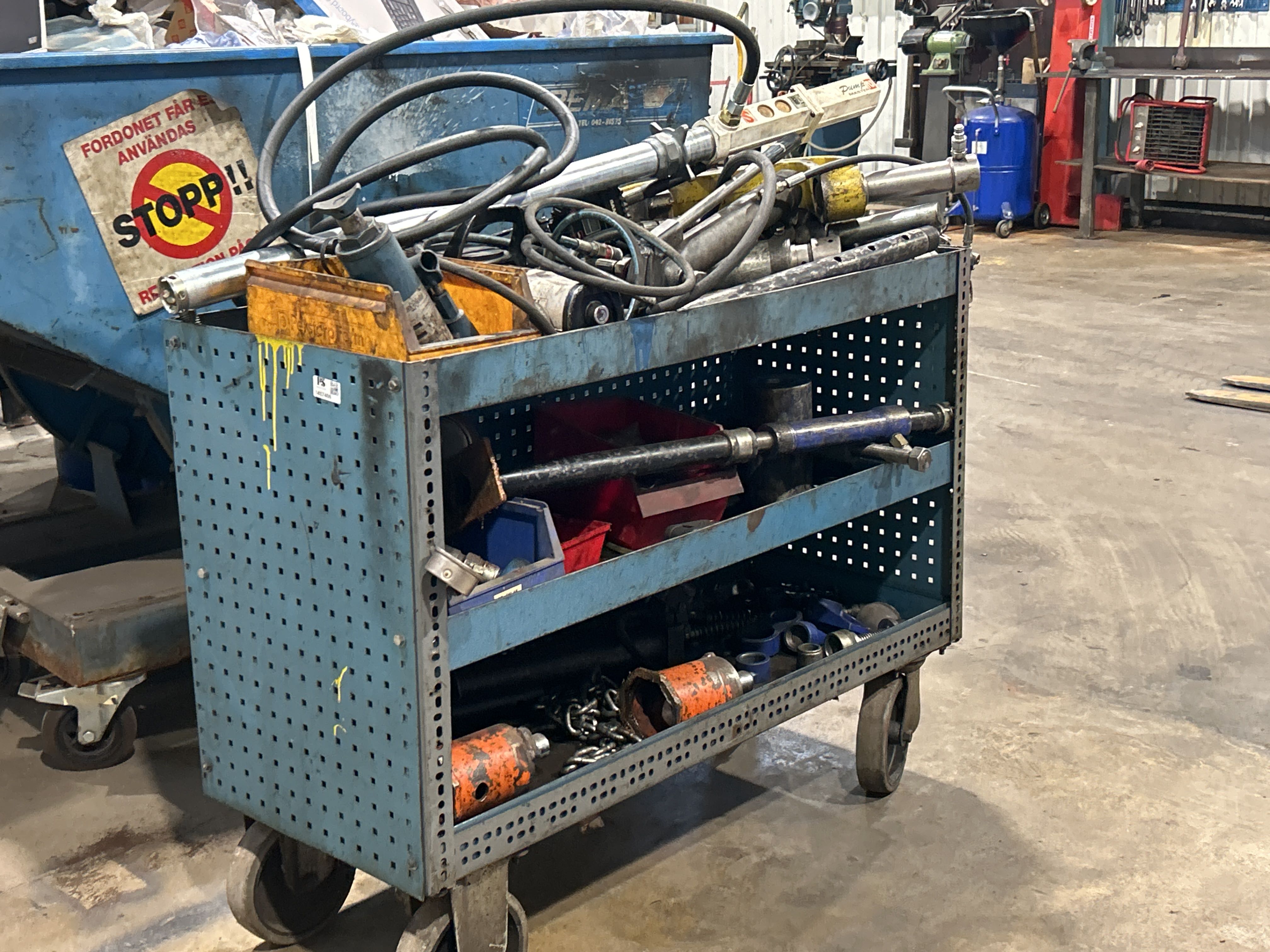 Bland objekten finns sopmaskin, kombiskurmaskin, fordonslyft, truckar, migsvets, pelarborrmaskin, bandslipmaskin på stativ, oljepumpsamlare, pallställage samt sortimenthyllor med innehåll med mera.