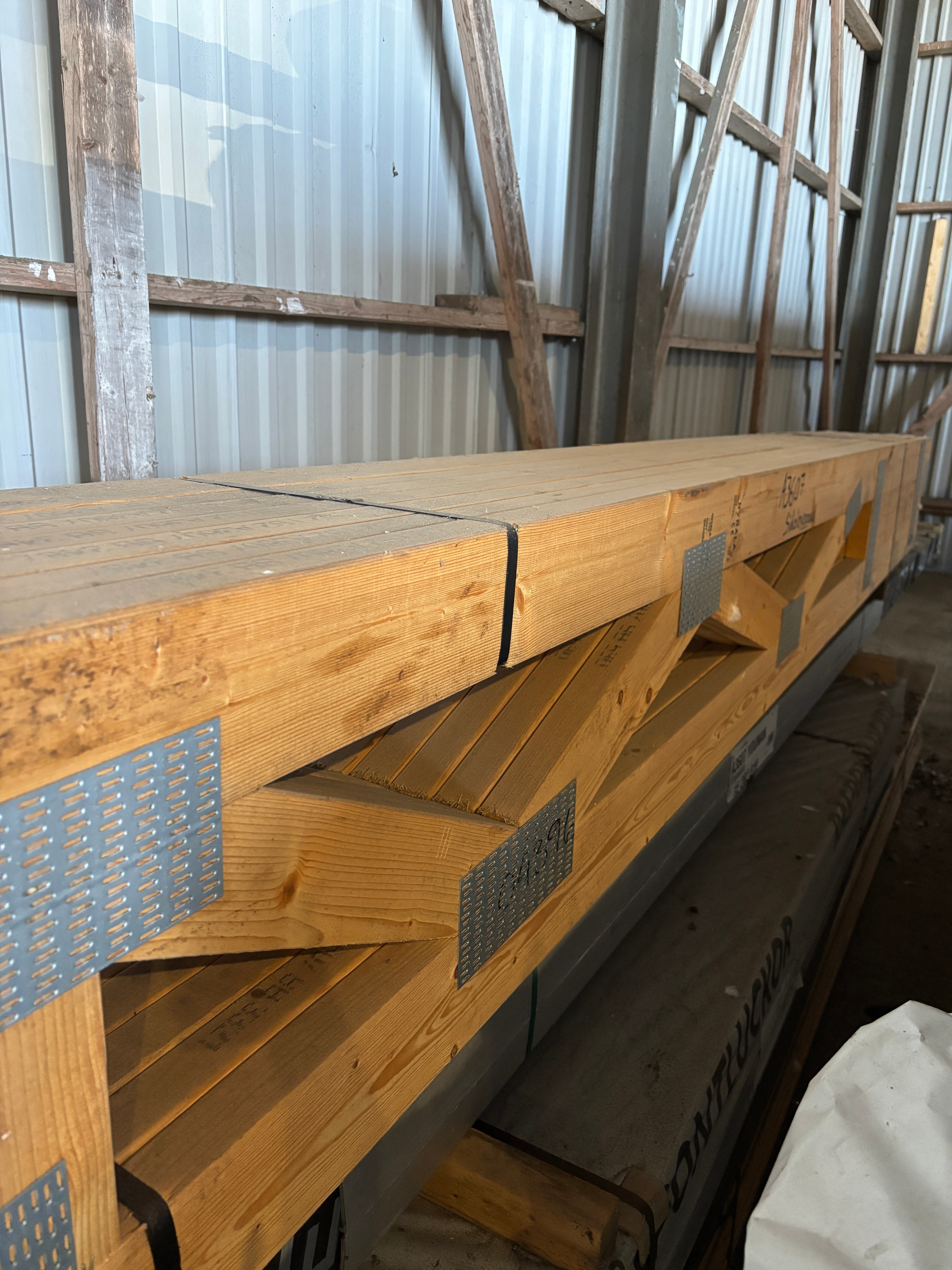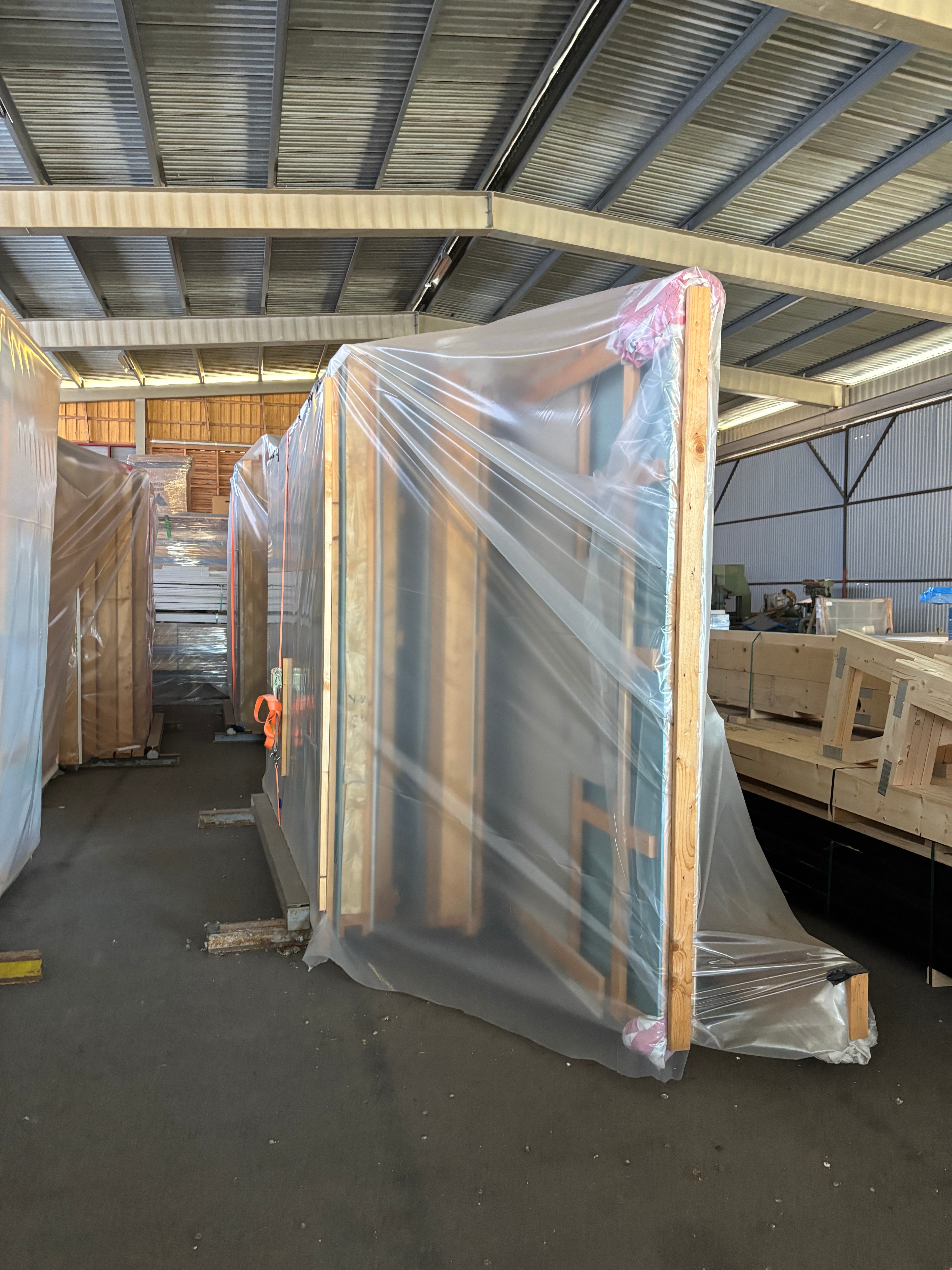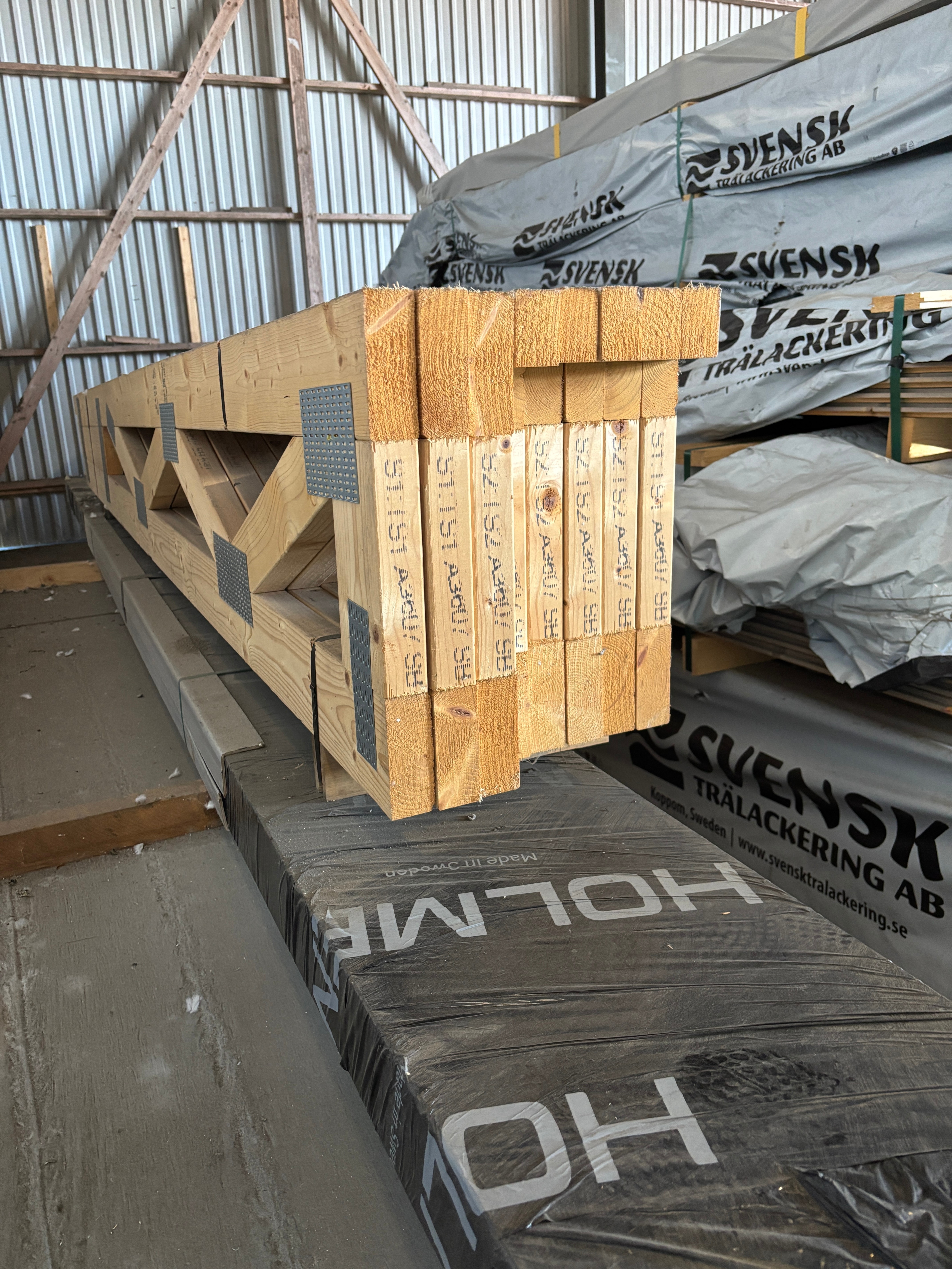 Samtliga väggblock är förtillverkade och redo för montering – med isolerad förrådsdel, takstolar, limträbalk och konstruktionsritningar.