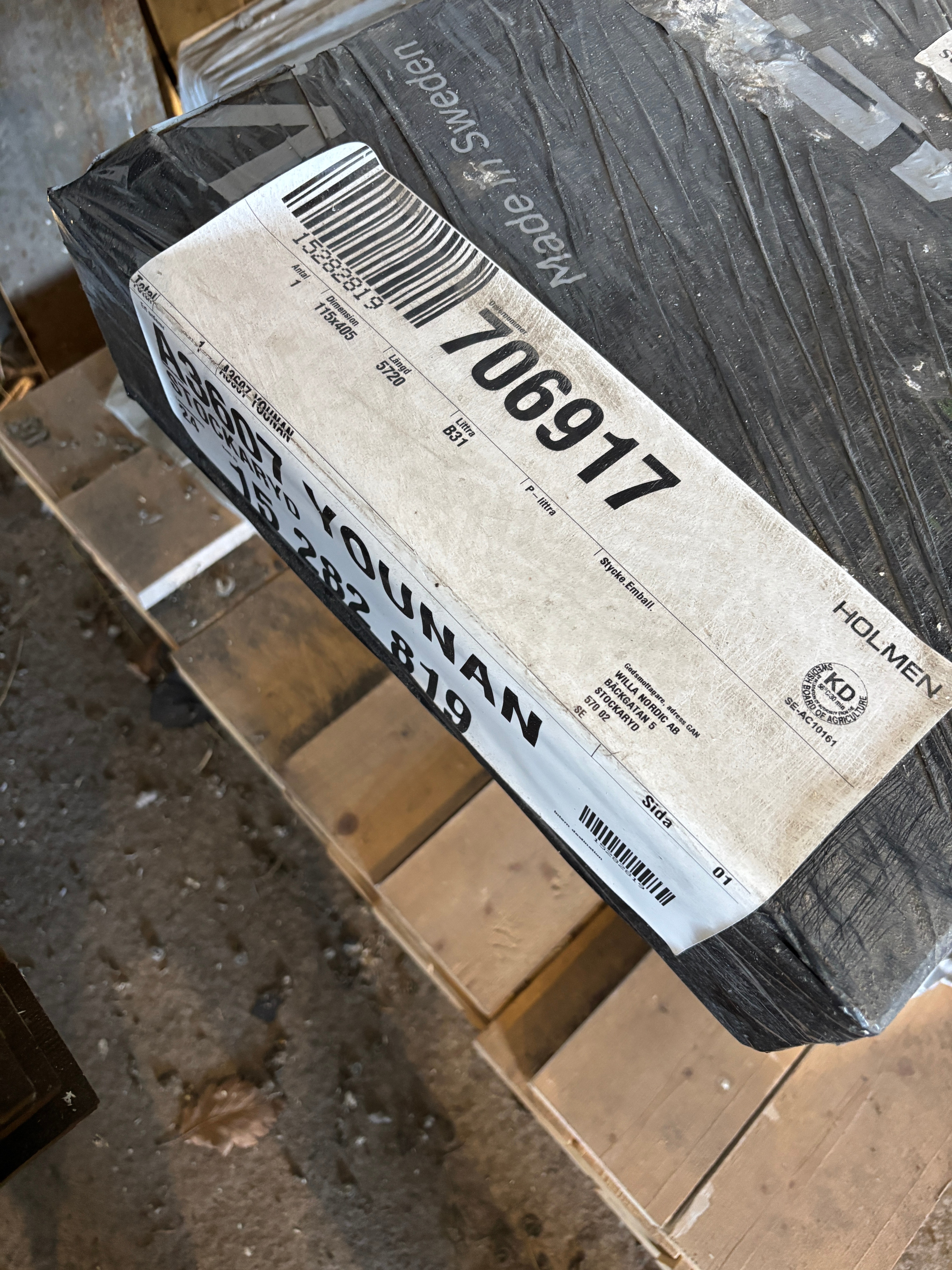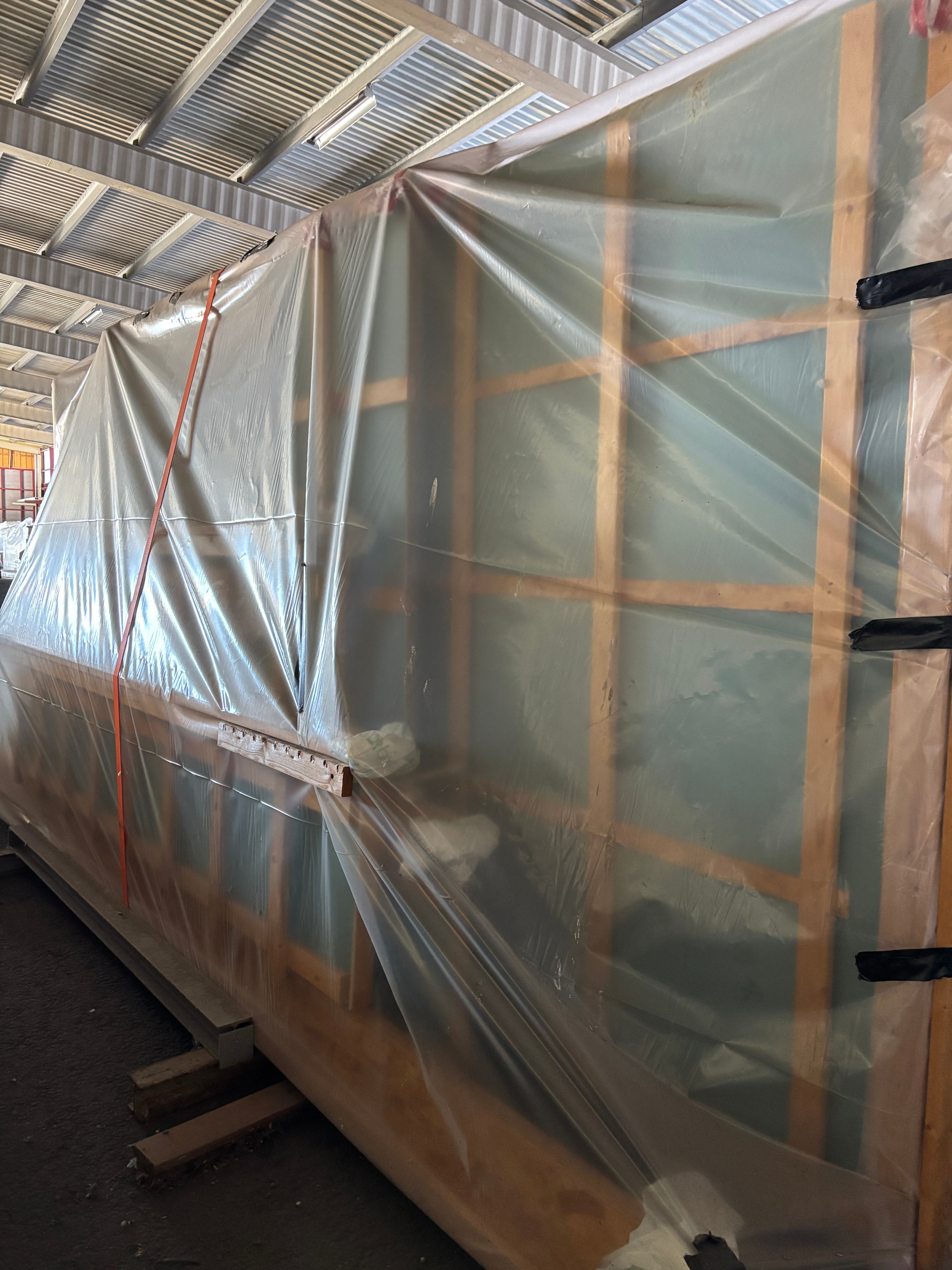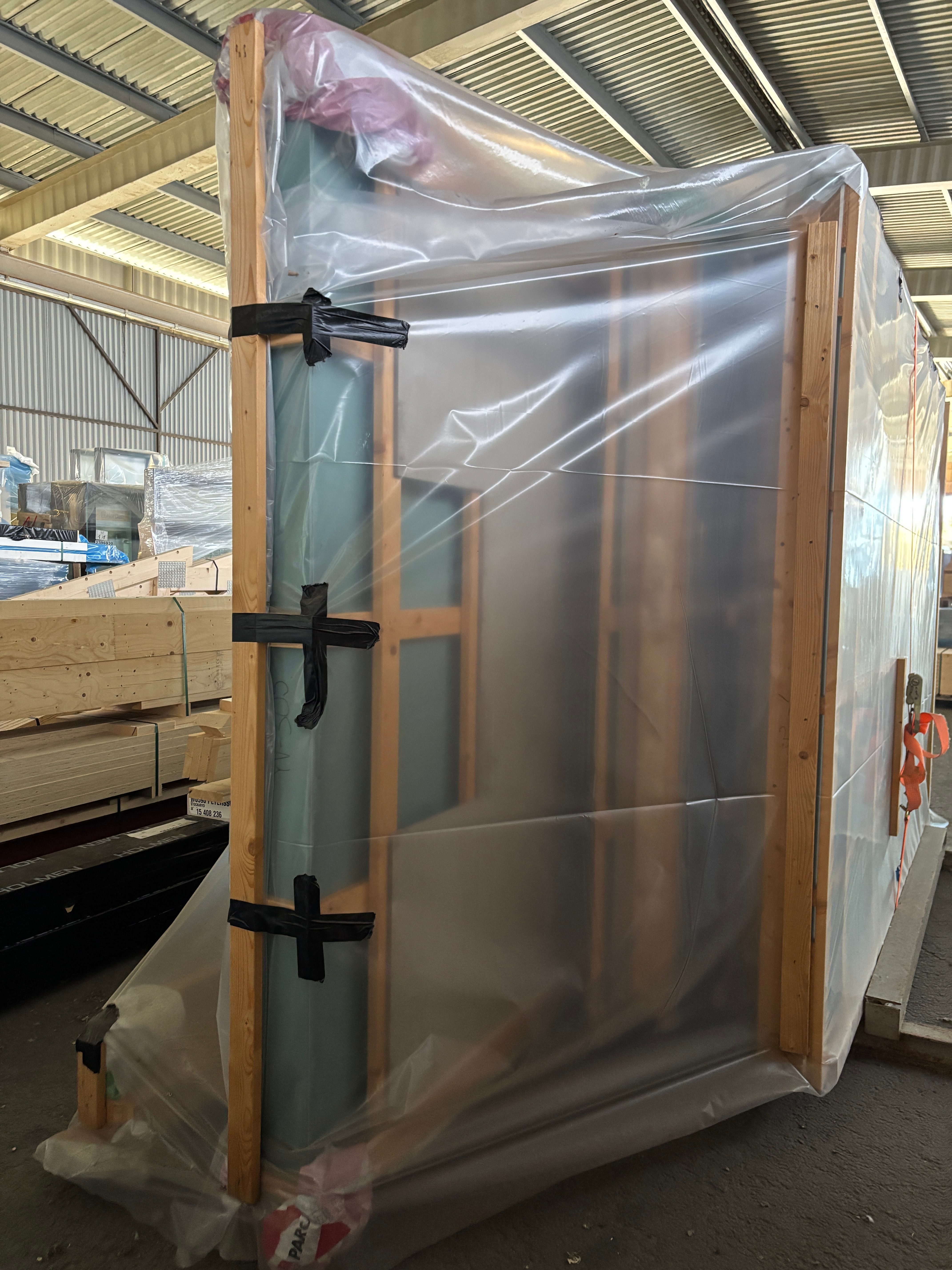 Samtliga väggblock är förtillverkade och redo för montering – med isolerad förrådsdel, takstolar, limträbalk och konstruktionsritningar.