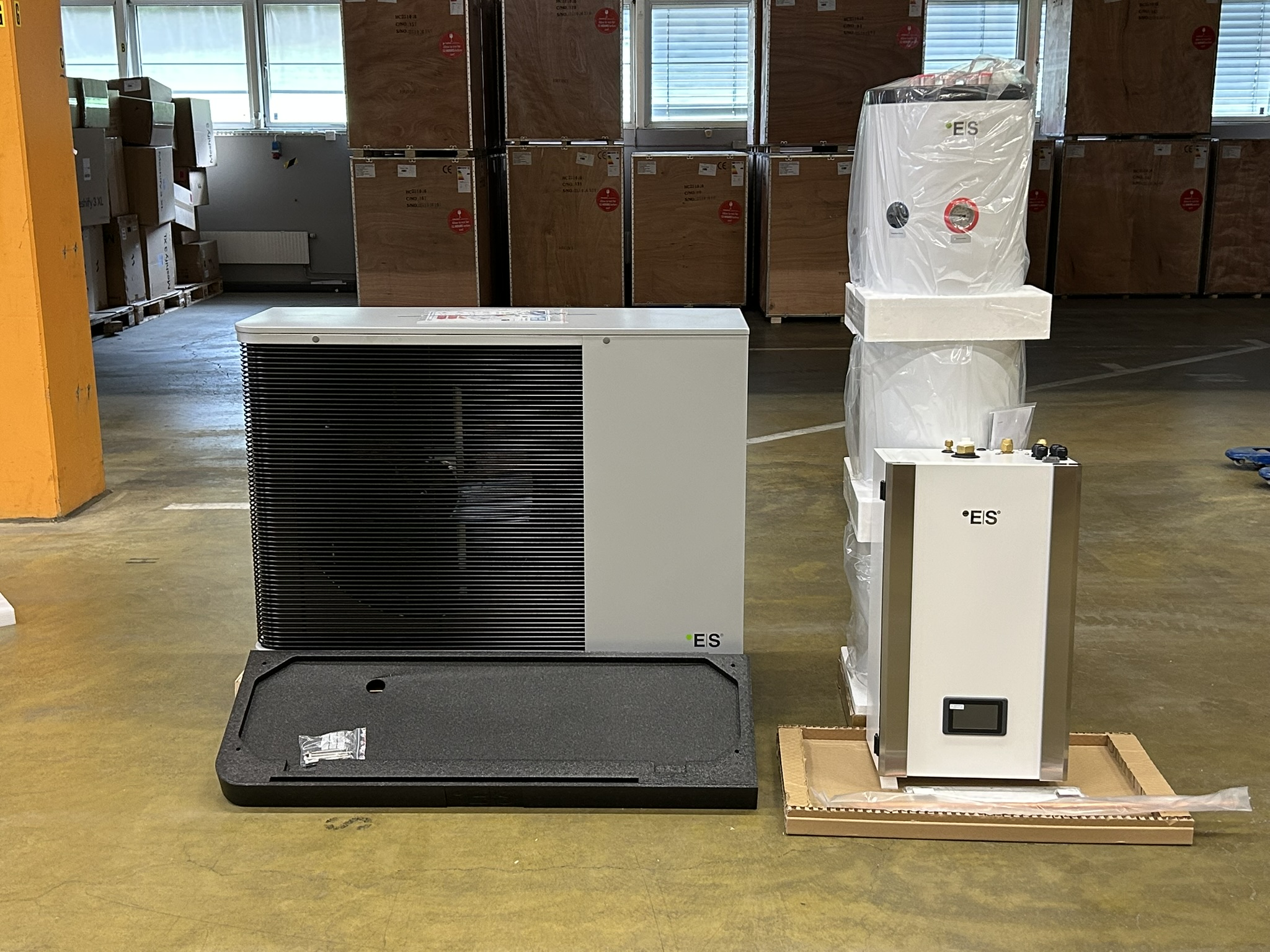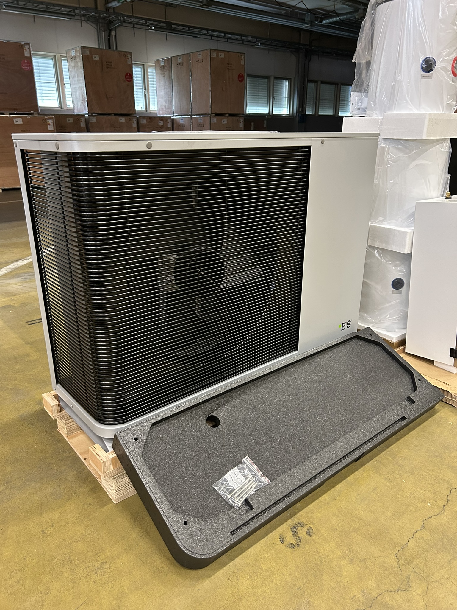 Värmepumpen säljs tillsammans med rostfri bufferttank och kondensvattentråg