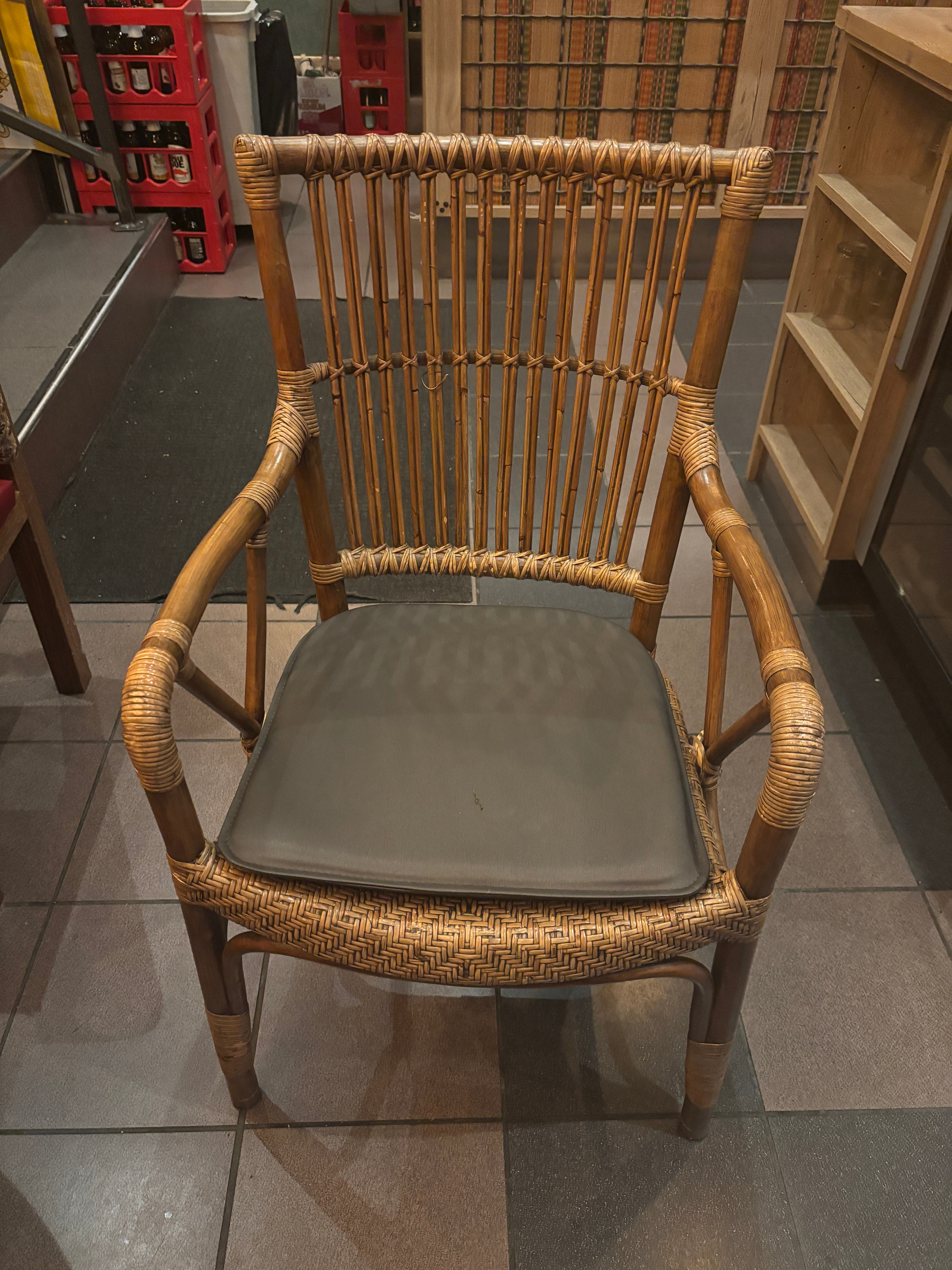 6 st caféstolar/bistrostolar i klassisk rottingdesign. Stolarna är av kommersiell kvalitet och har använts i restaurangmiljö. Samtliga stolar levereras med löstagbar grå sittdyna.