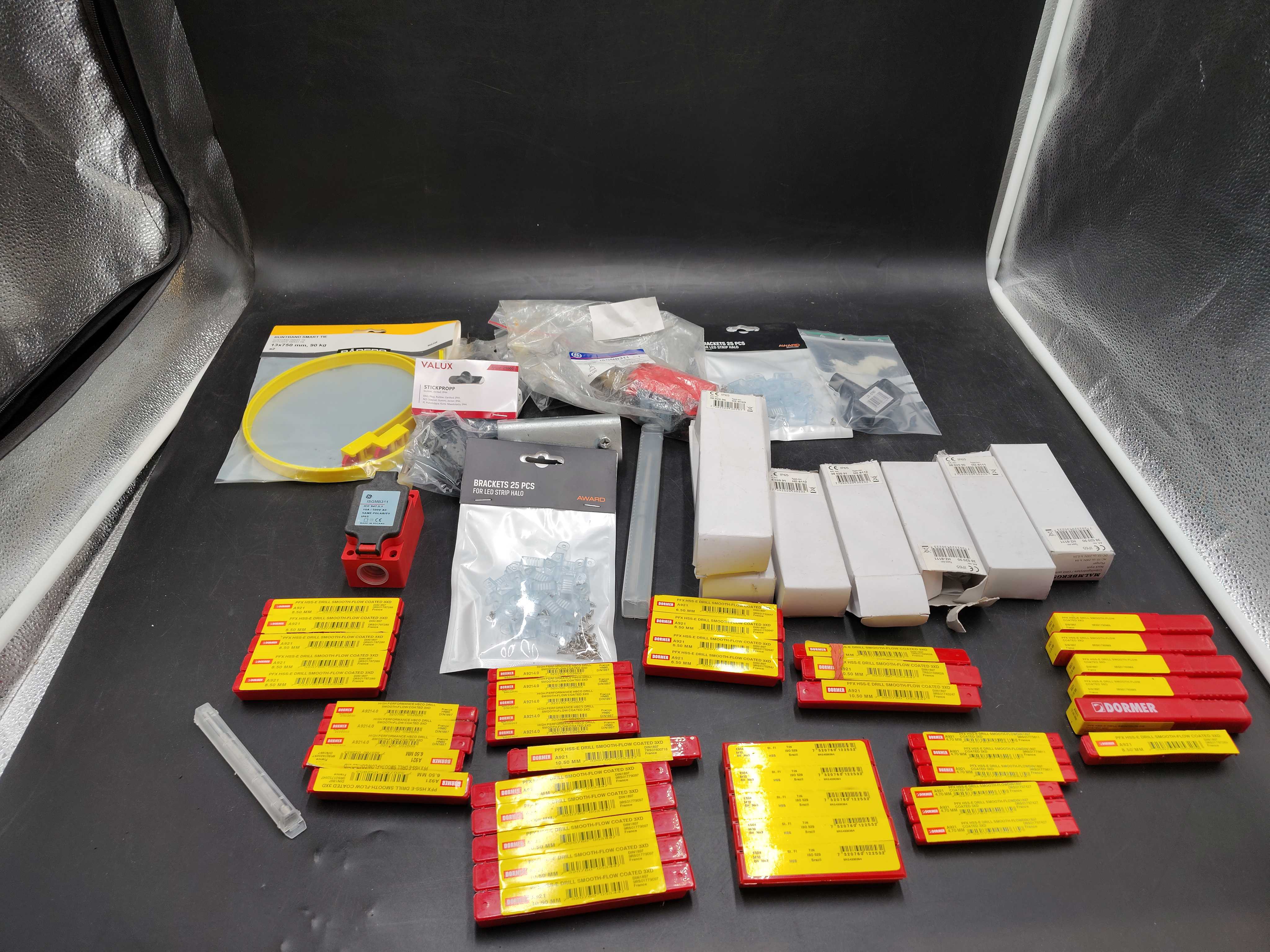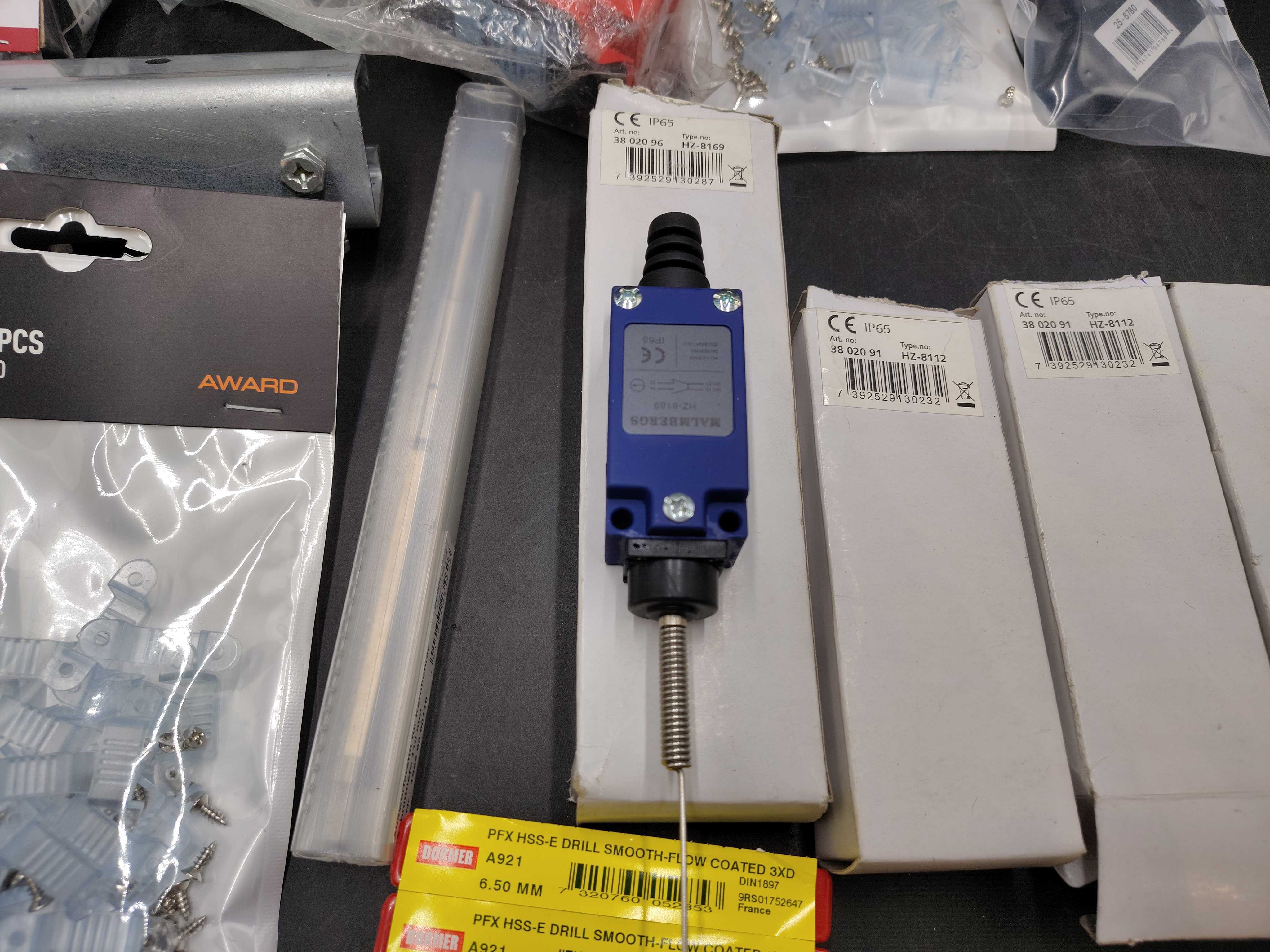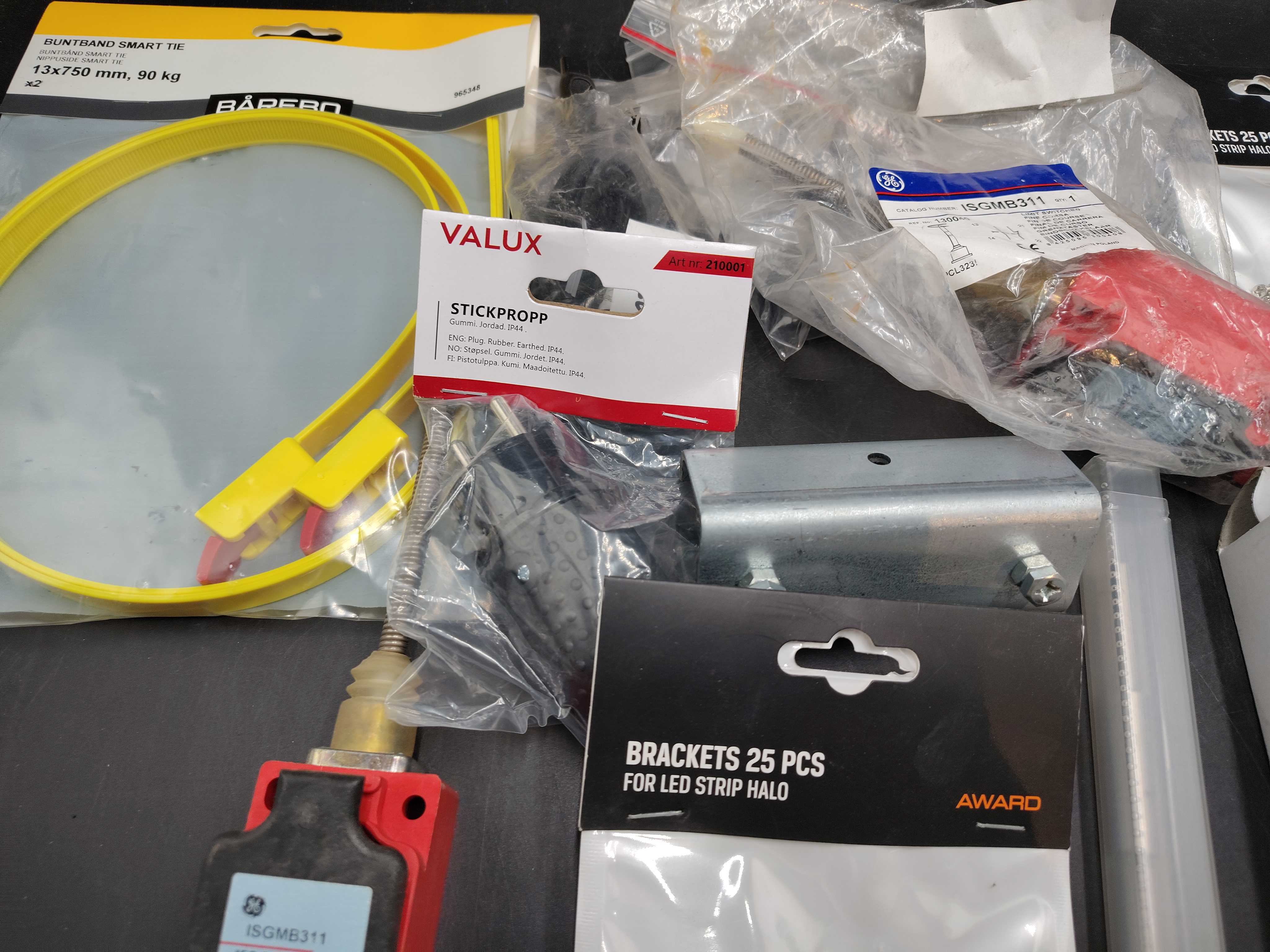 Blandat elmaterial, parti – kopplingsdetaljer, brytare, buntband, borr
