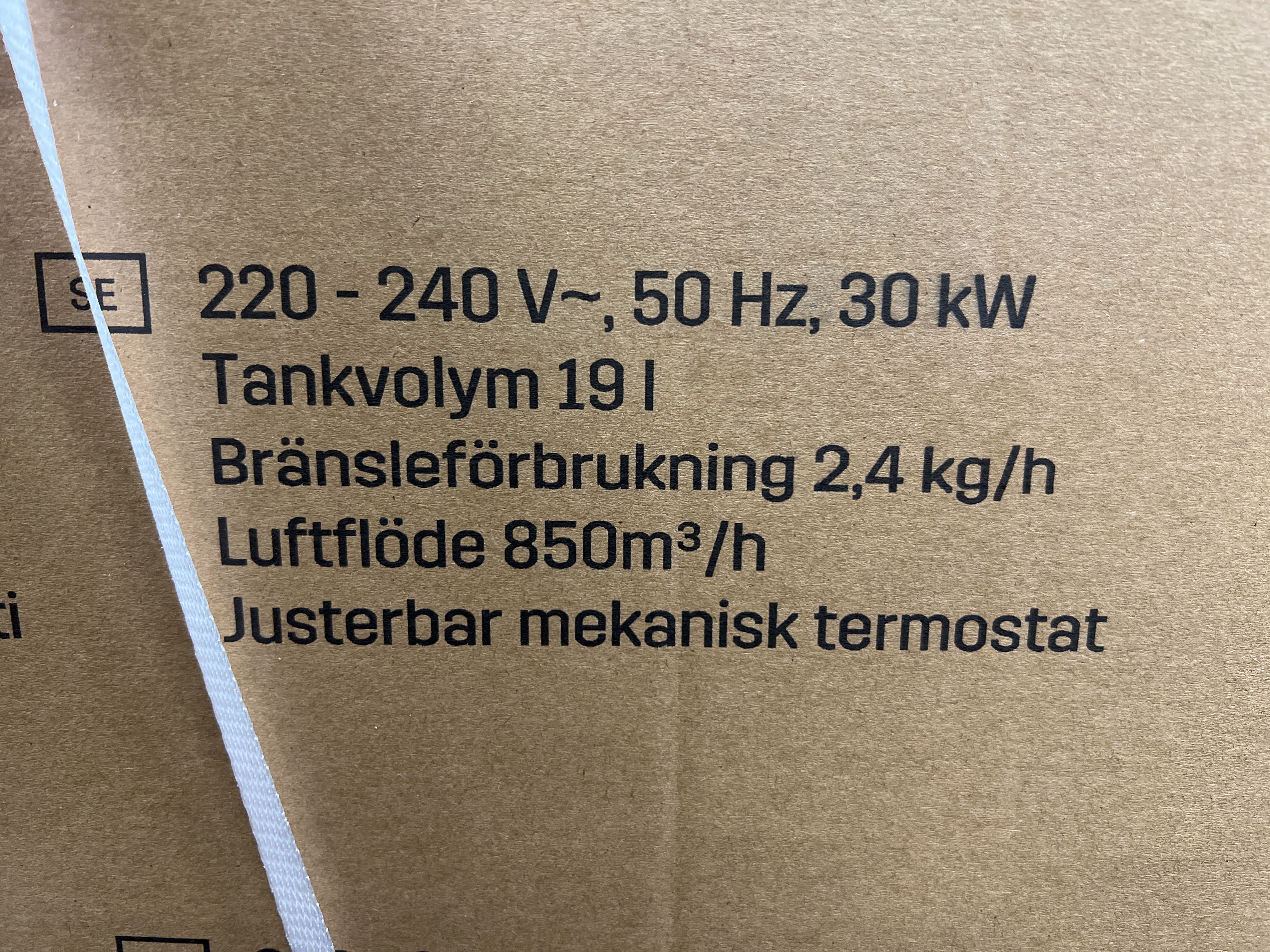 Garagevärmare på hjul. Bränsleolja, tank 19 liter, bränsleförbrukning 2,4 kg per timme. Luftkapacitet 650 m3/timme. Mekaniskt justerbar termostat. Effekt 30 kW.