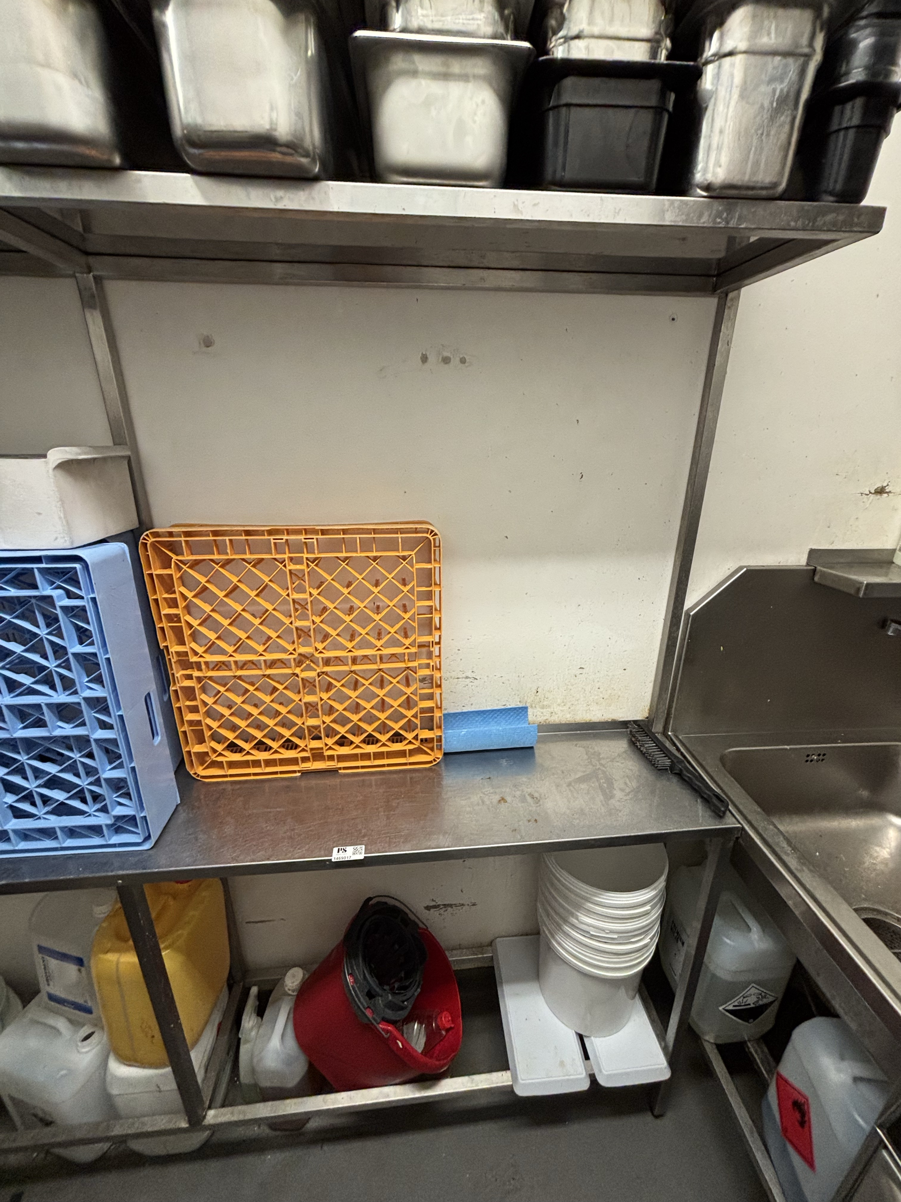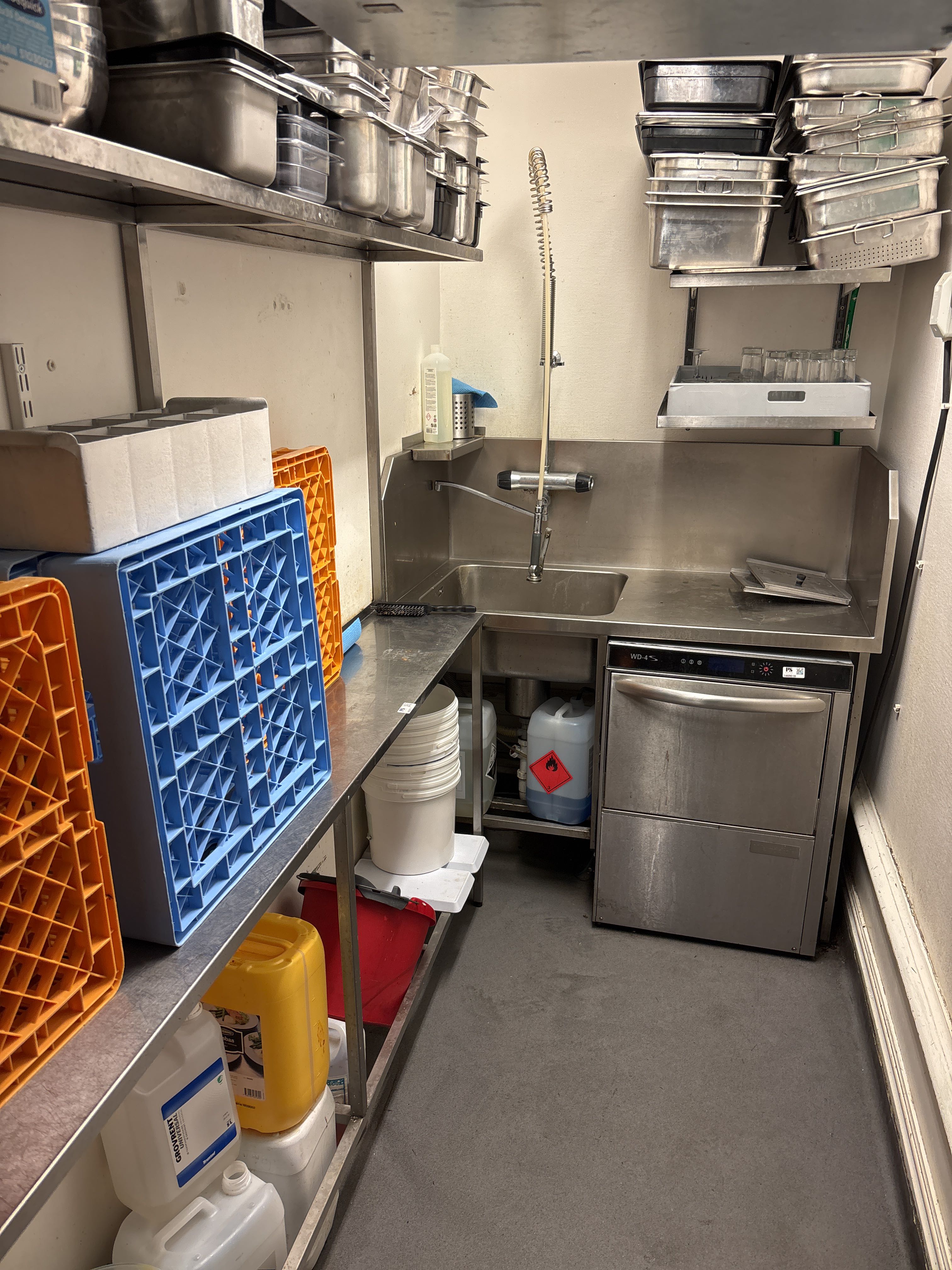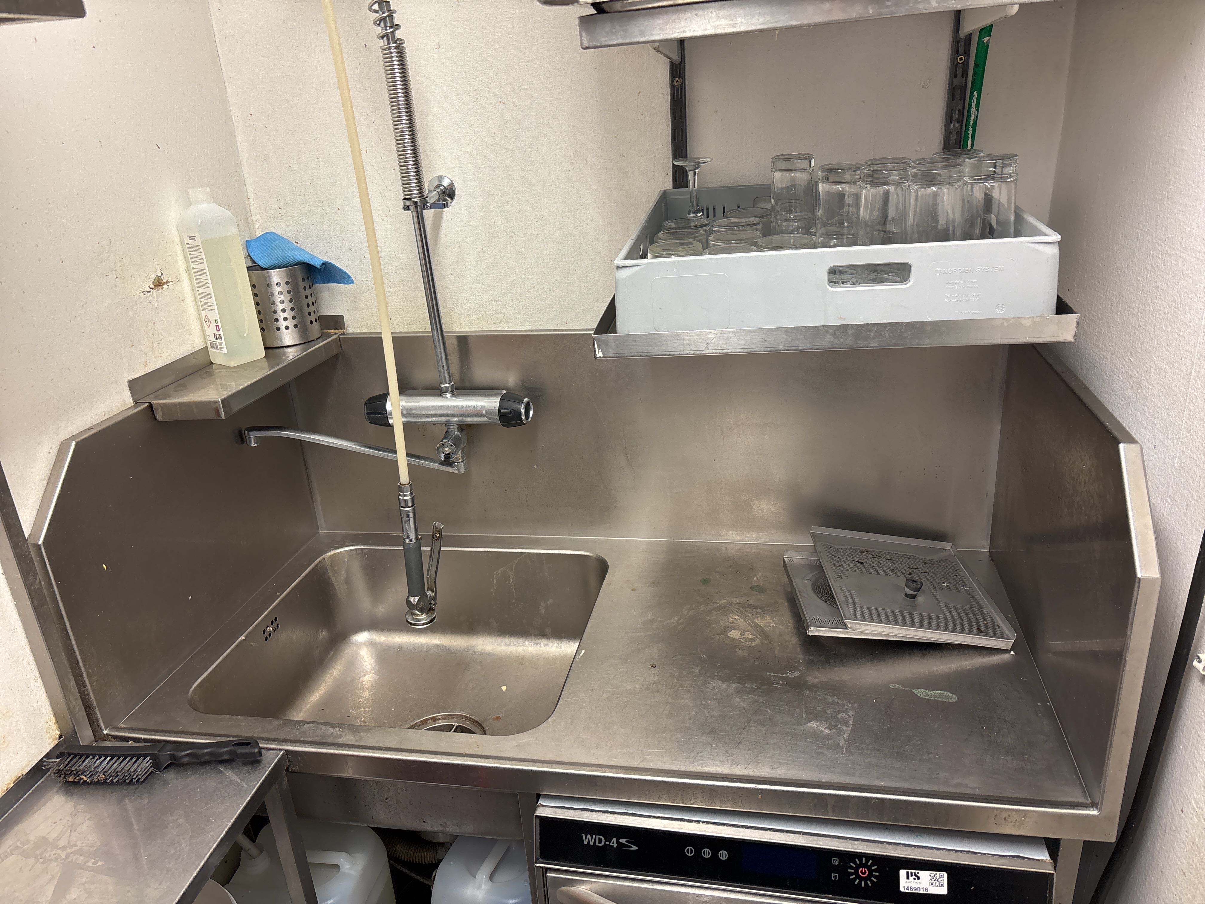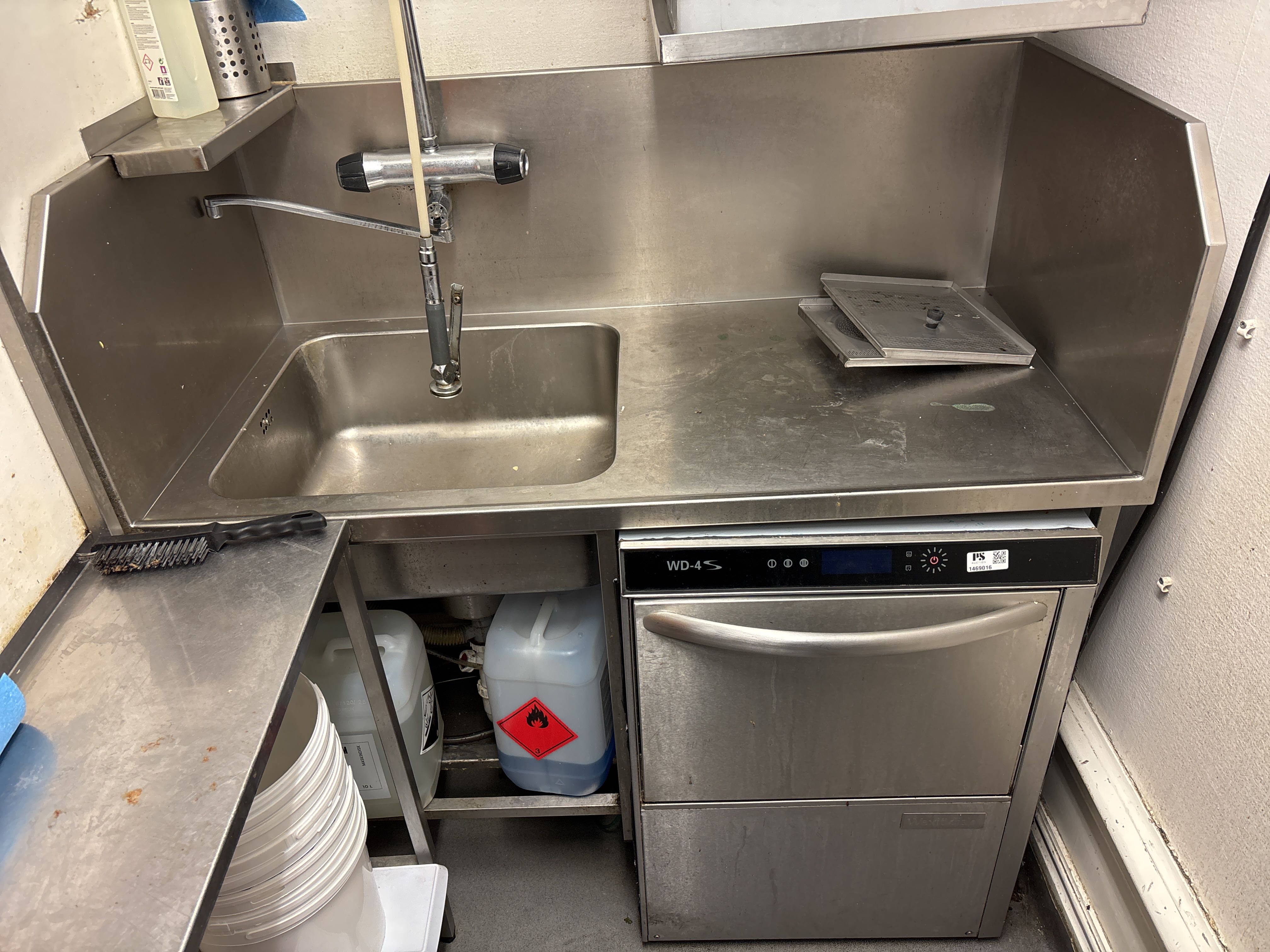 Rostfri diskbänk och intilliggande bänk och hyllor