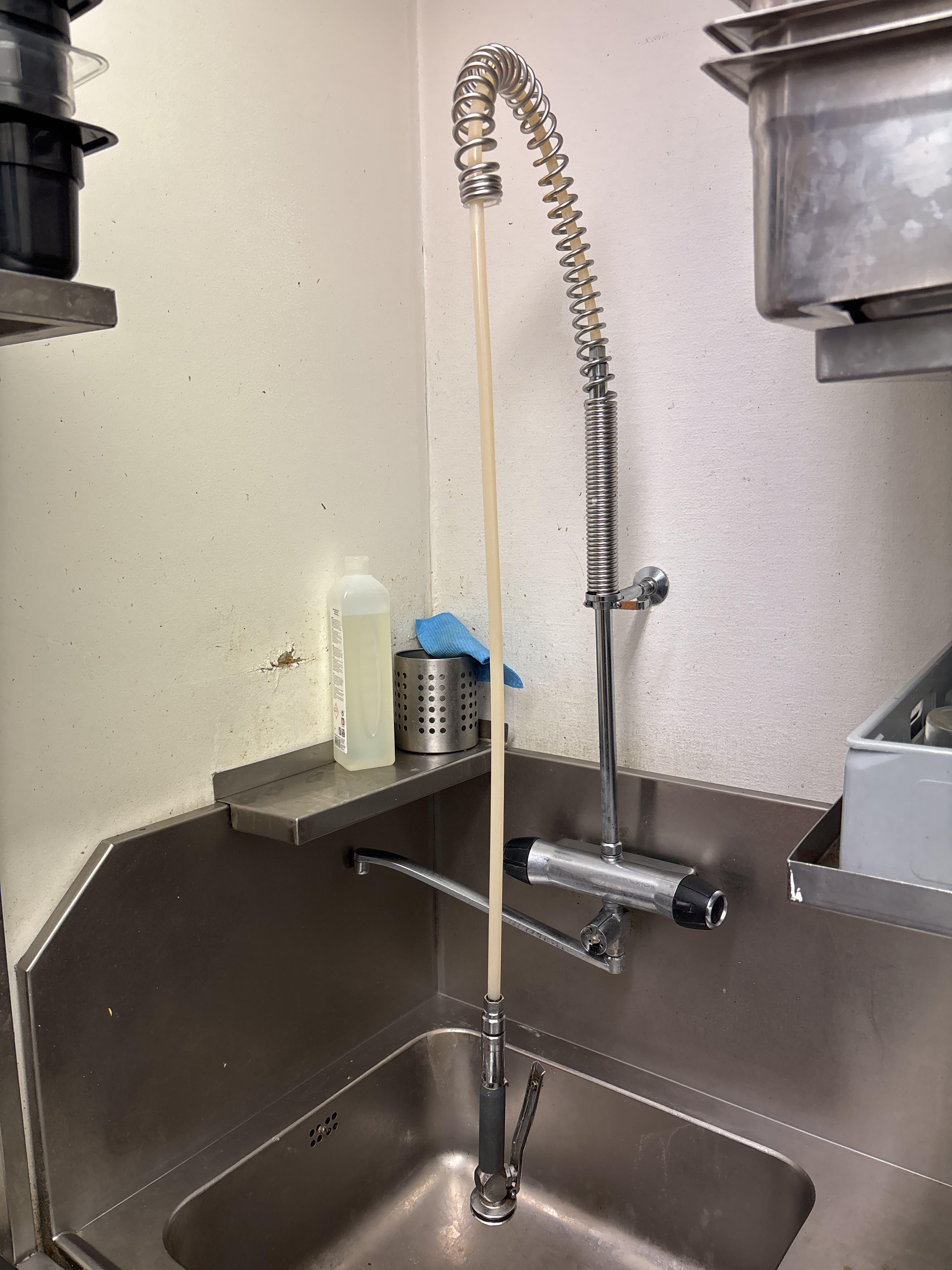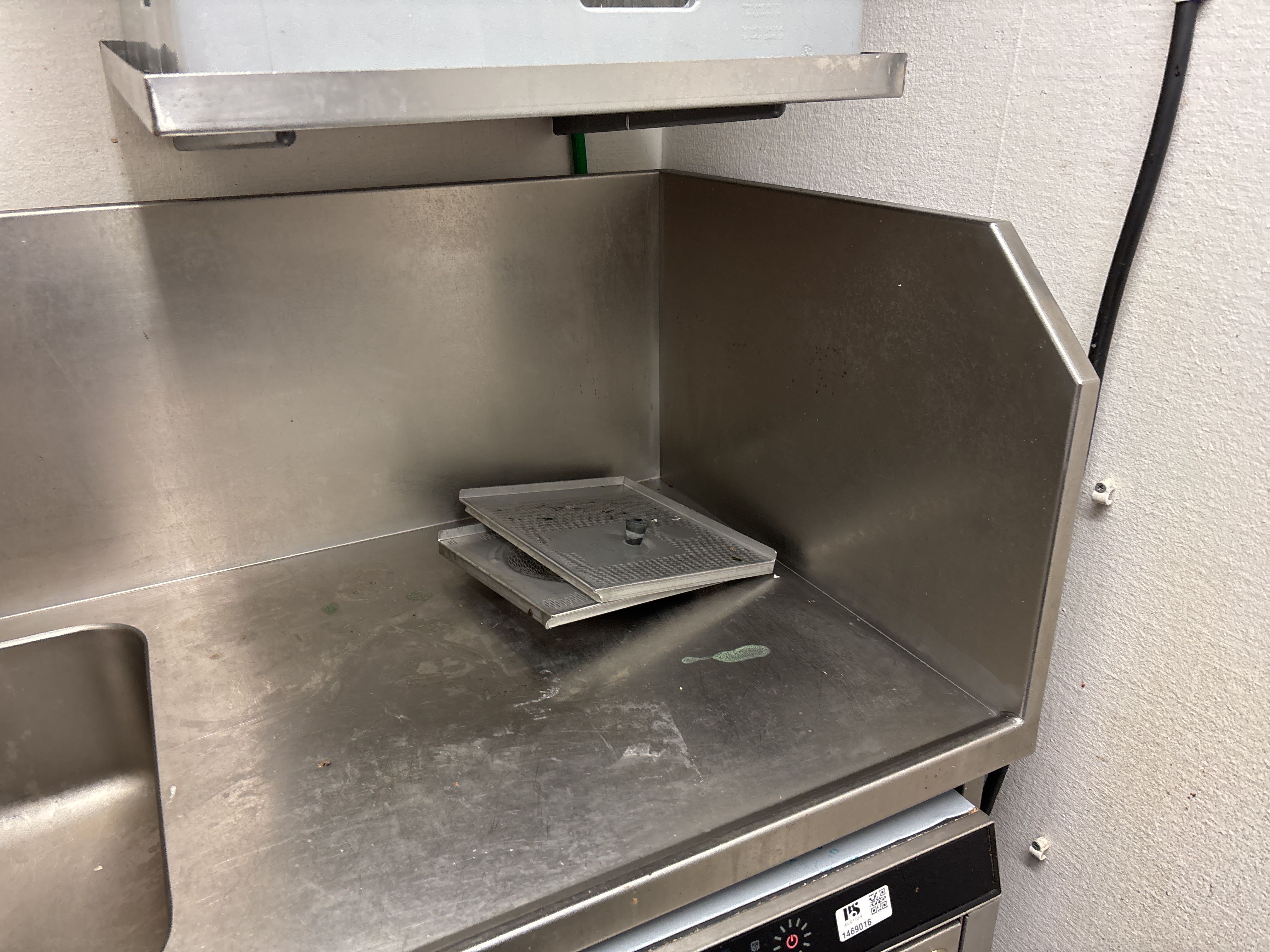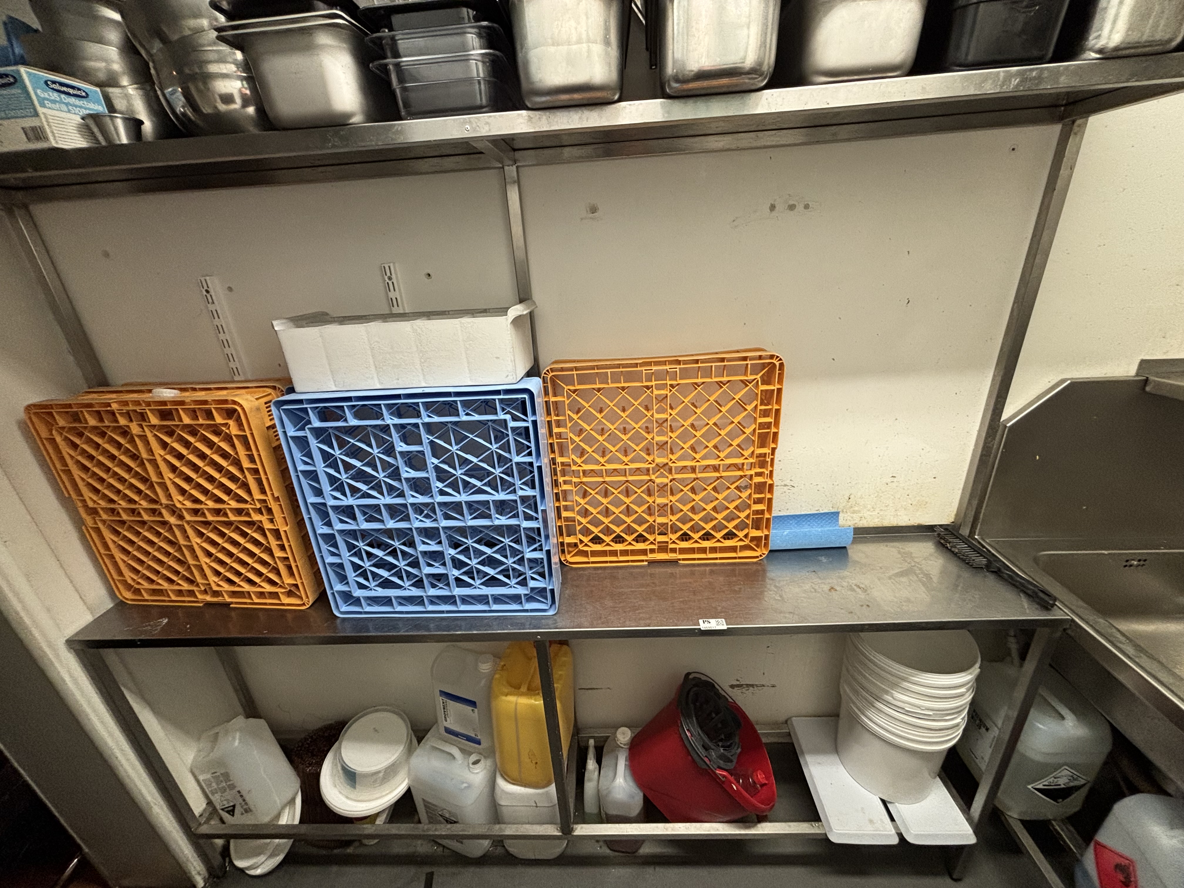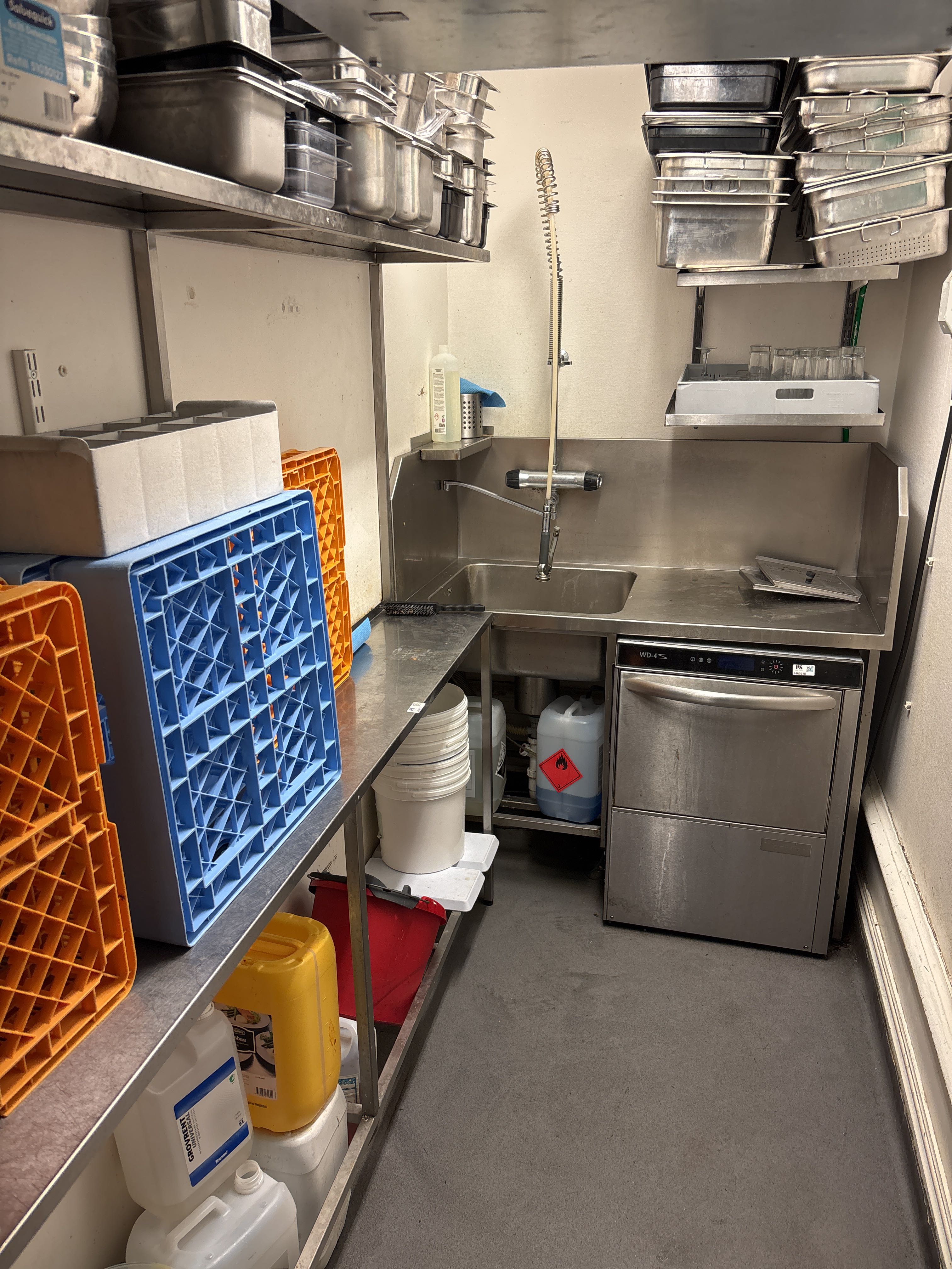 Rostfri diskbänk och intilliggande bänk och hyllor