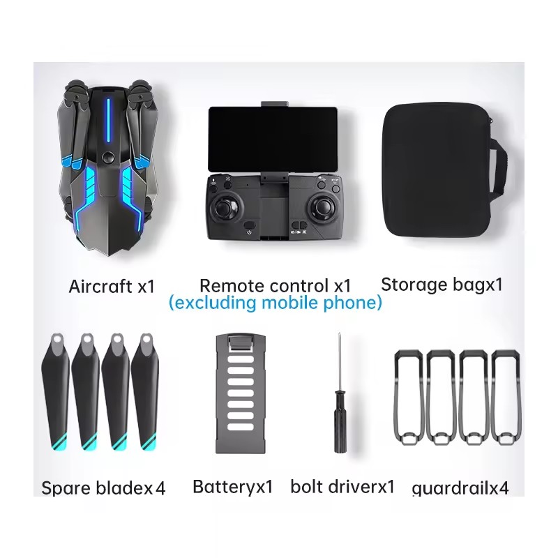 I paketet ingår: Drönare, fjärrkontroll, 2× batteri, USB-kabel, reservpropellrar, propellerskydd, skruvmejsel, manual, förvaringsväska