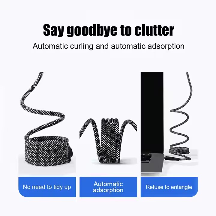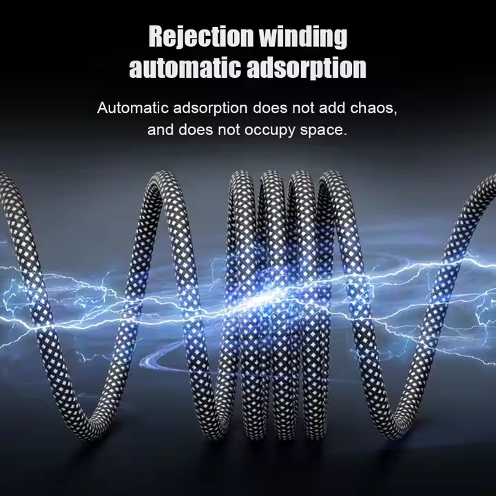Praktisk och slitstark laddningskabel med magnetisk struktur som drar ihop sig med hjälp av magneter utan att trassla. Perfekt för laddning av mobiler, surfplattor, laptops och andra Type-C-enheter. Den flätade designen ger extra hållbarhet och ett mer organiserat användande.