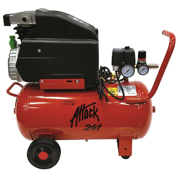 KGK Attack 241 är en smidig och lättanvänd kompressor anpassad för hobby och enklare hantverksarbeten. Konstruktionen är kompakt med hjul och handtag för enkel förflyttning. Utrustad med manometer, säkerhetsventil, reduceringsventil och snabbkoppling för praktisk användning vid exempelvis renblåsning och däckpumpning.