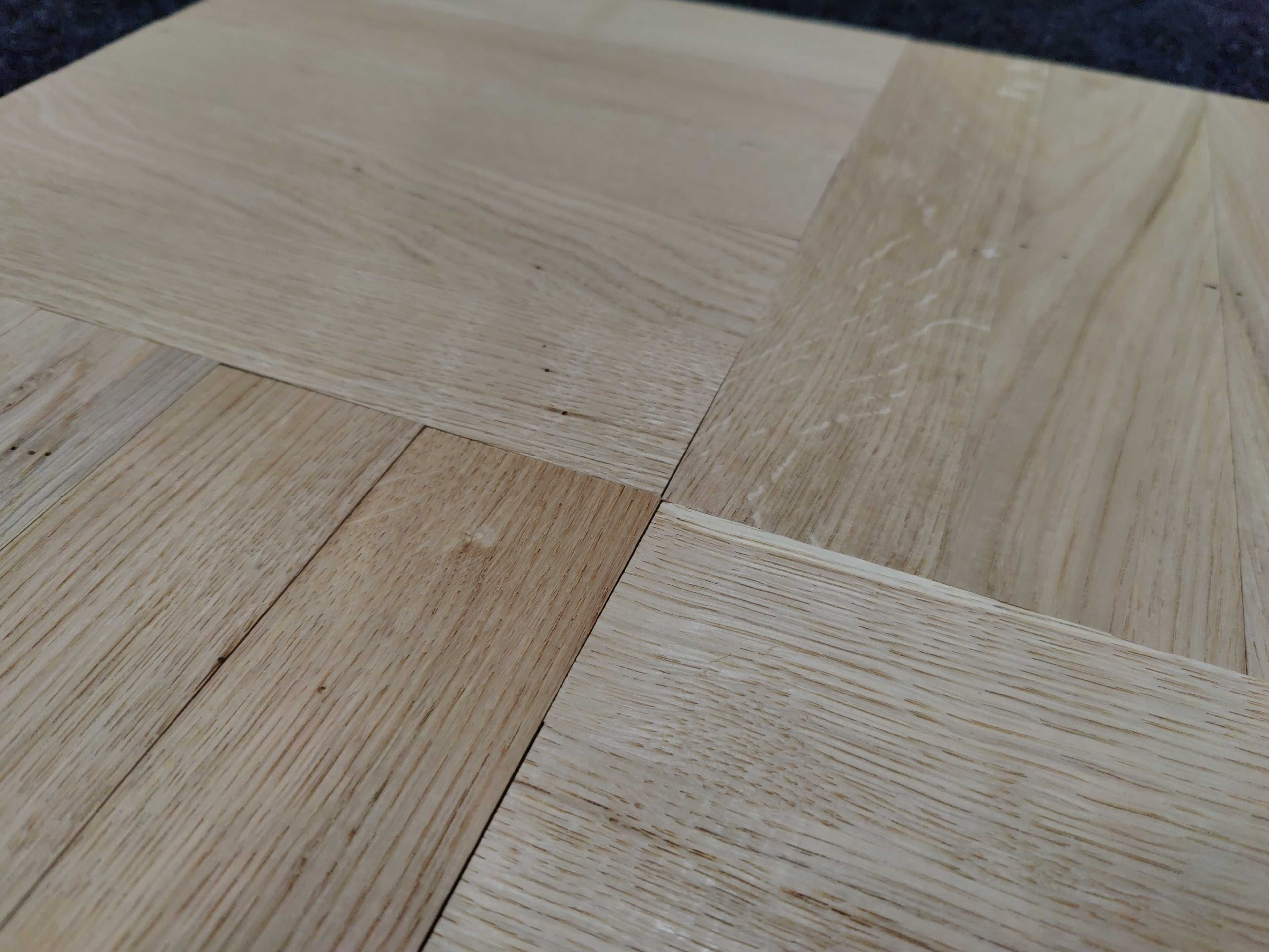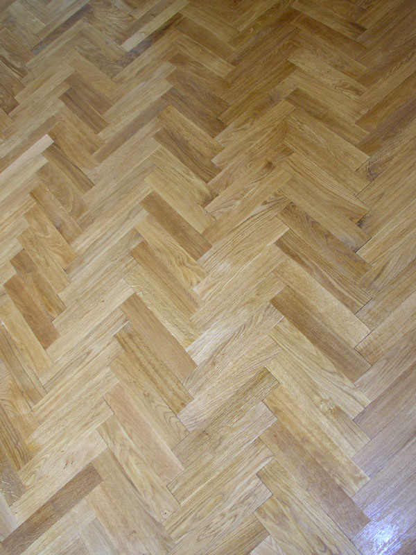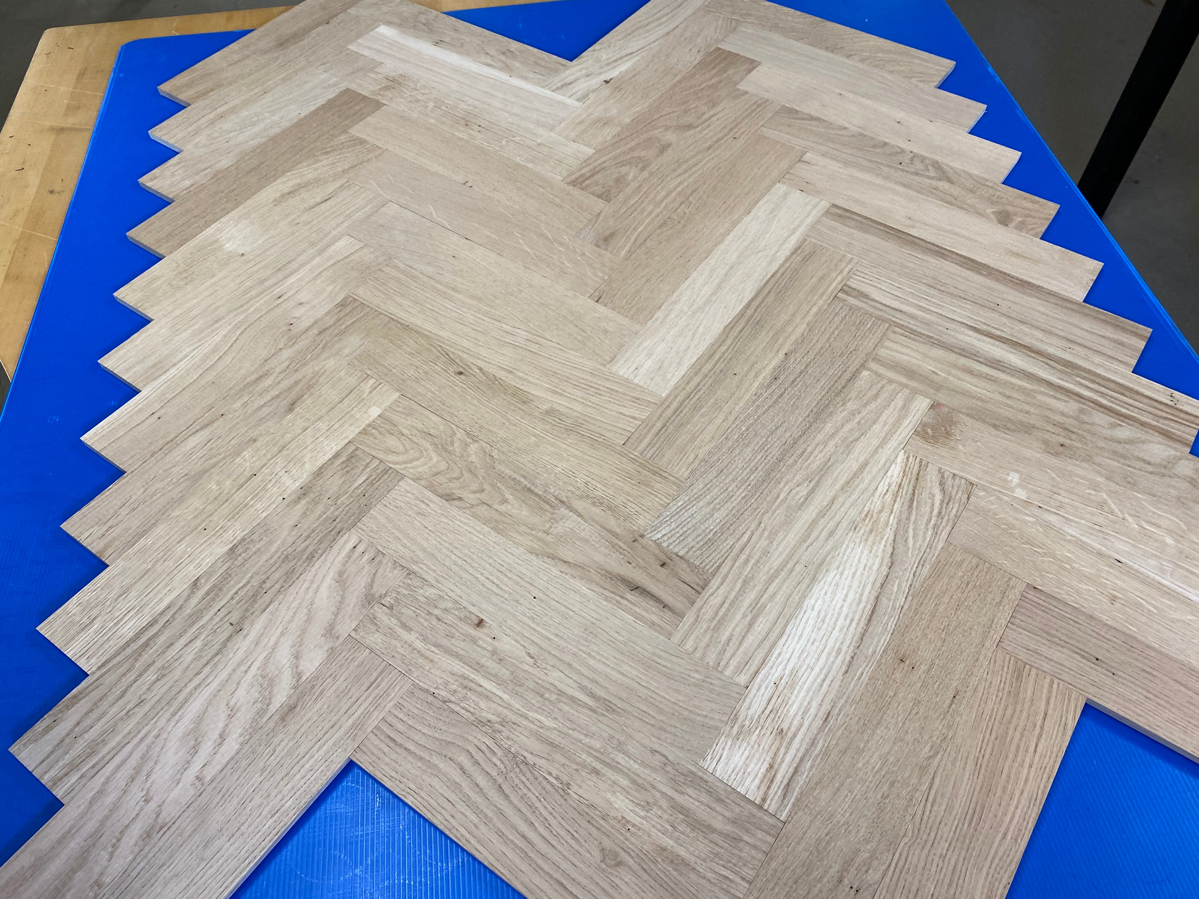 Massiv fiskbens-/enstavsparkett av obehandlad ek. Kan läggas i flera mönster. Vissa stavar är med små kvistar.