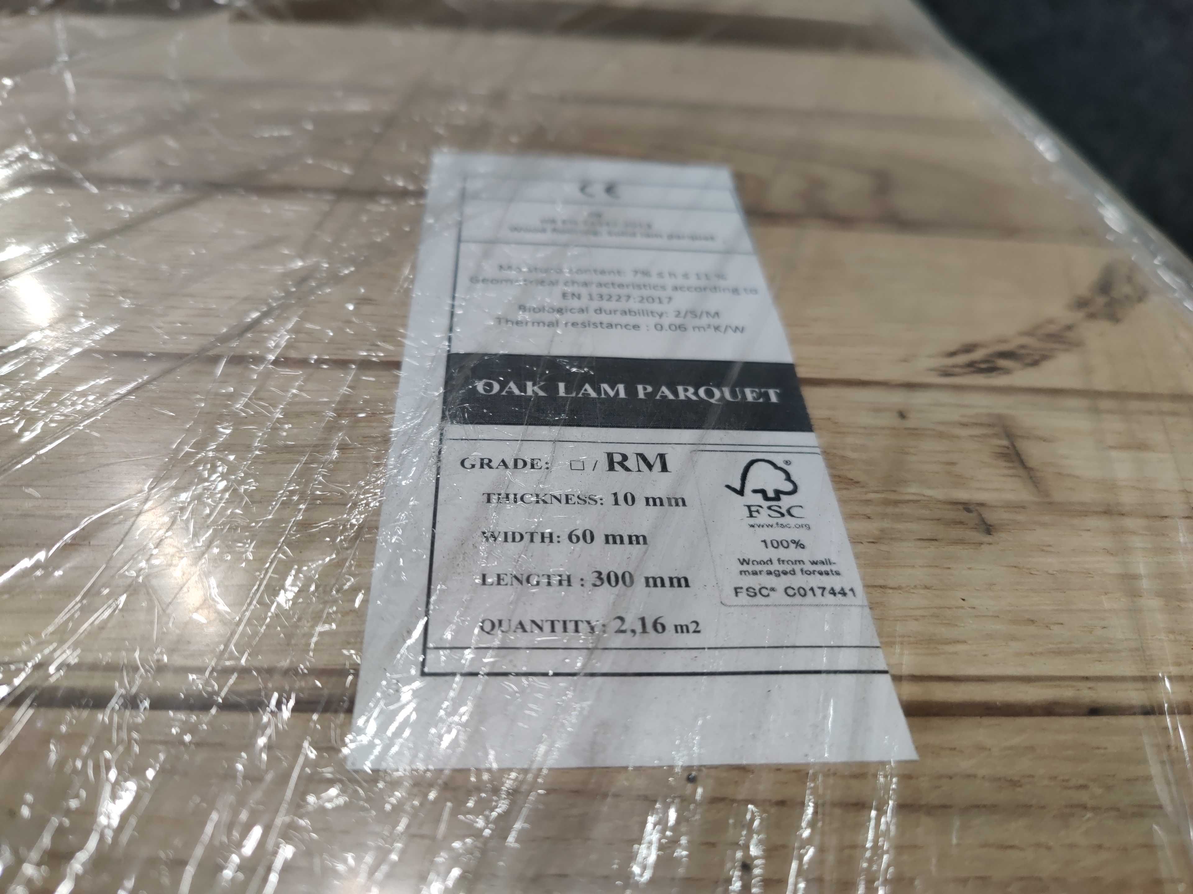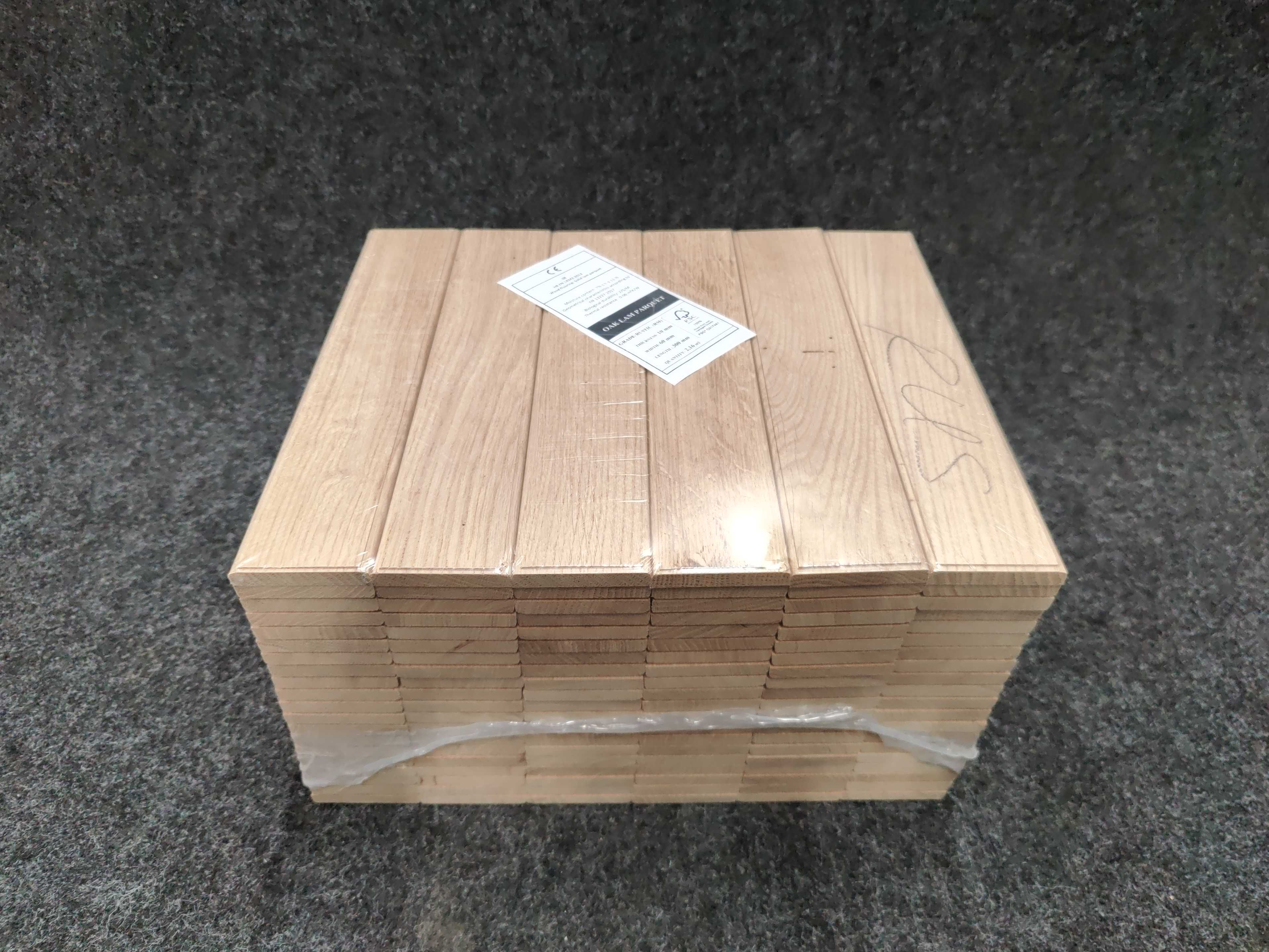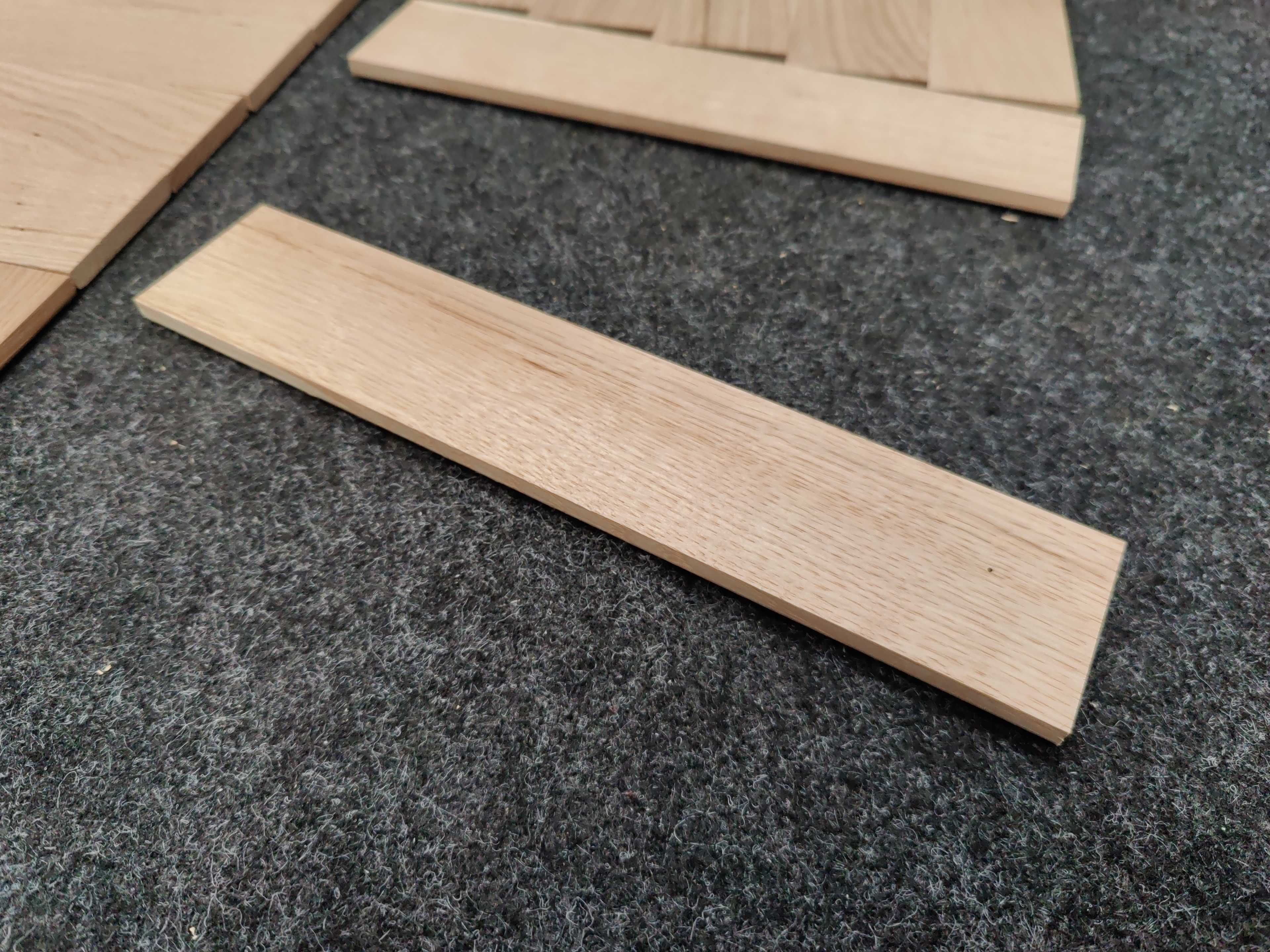 Massiv fiskbens-/enstavsparkett av obehandlad ek. Kan läggas i flera mönster. Vissa stavar är med små kvistar.