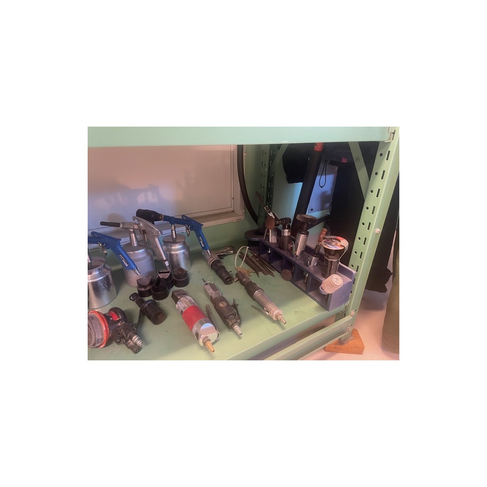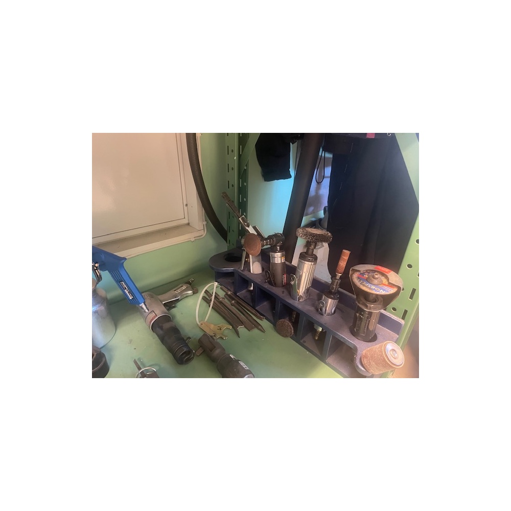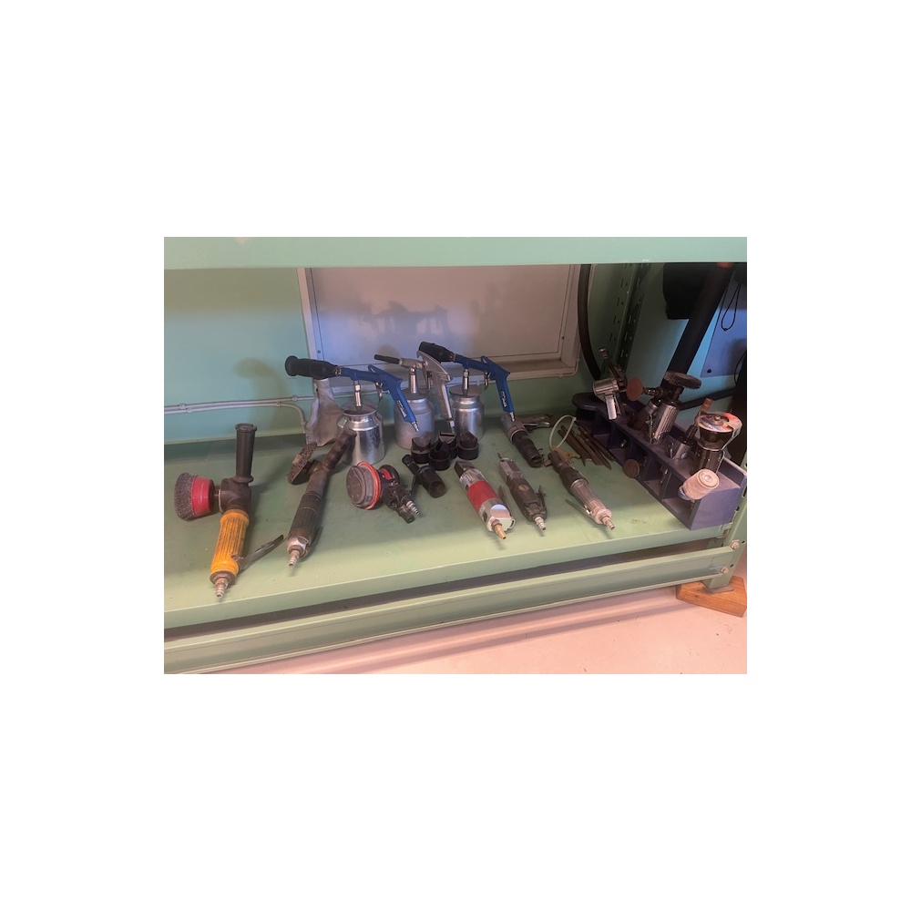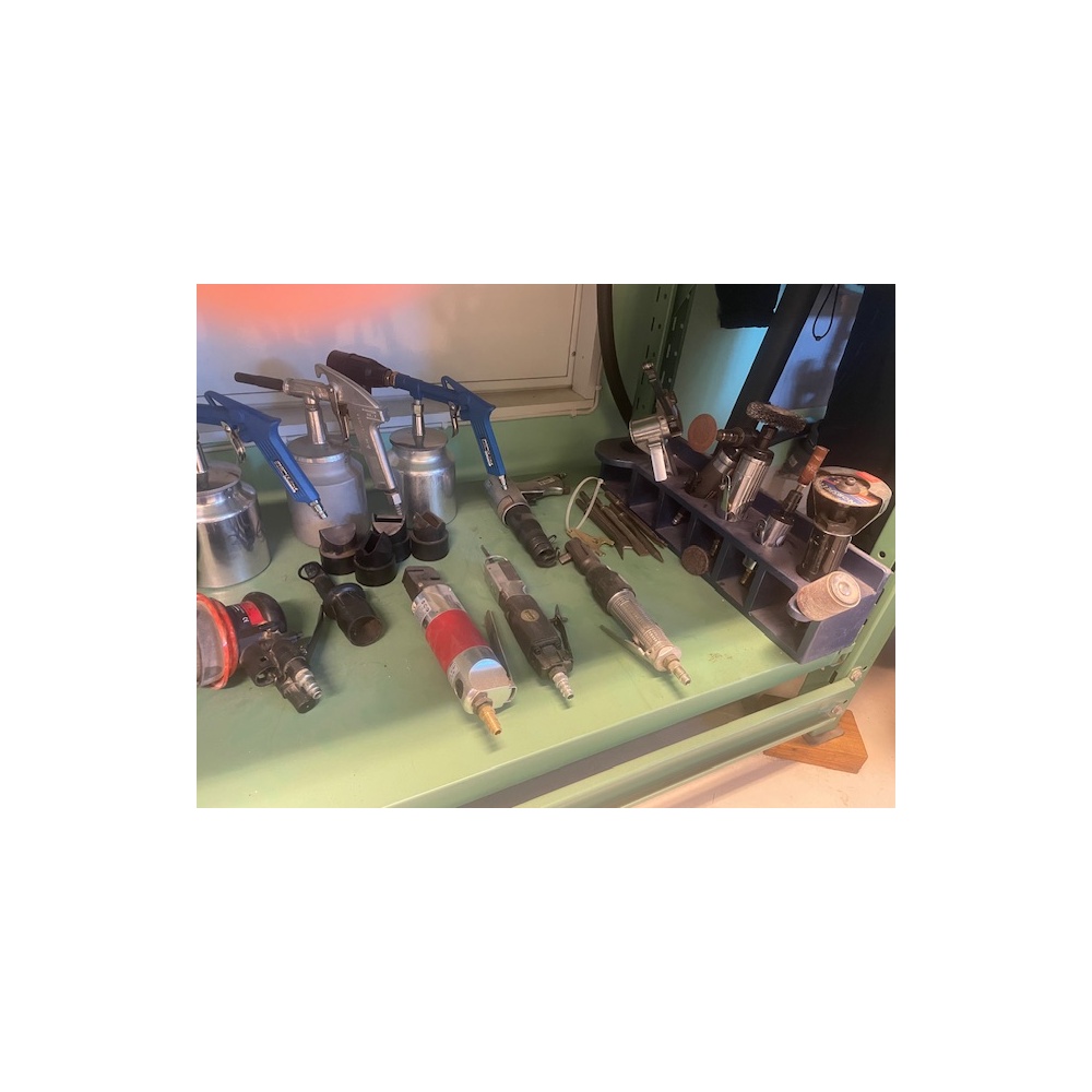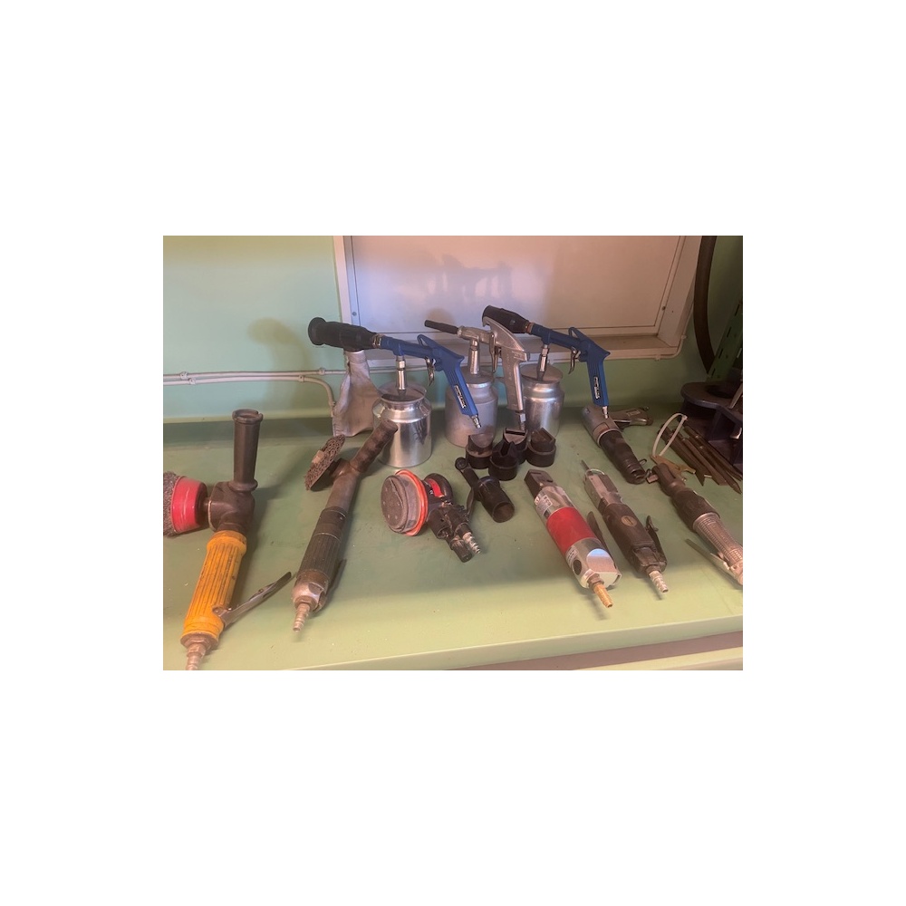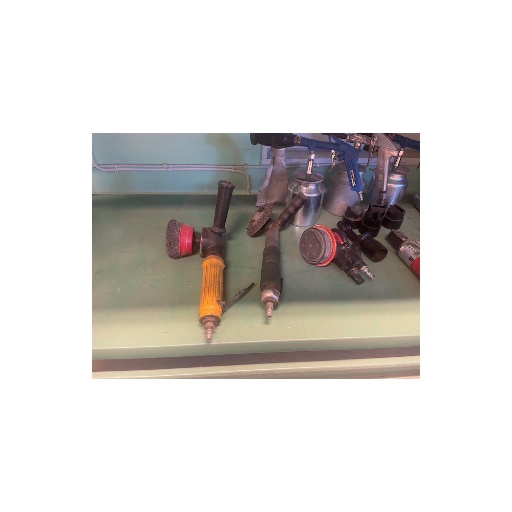 Blandat parti pneumatiska verktyg och tillbehör, bl.a. slipmaskiner, polermaskiner, excenterslip, tryckluftspistoler med behållare samt diverse slip- och polertillbehör. Verktyg för verkstads- och industribruk. Begagnat skick enligt bilder.
