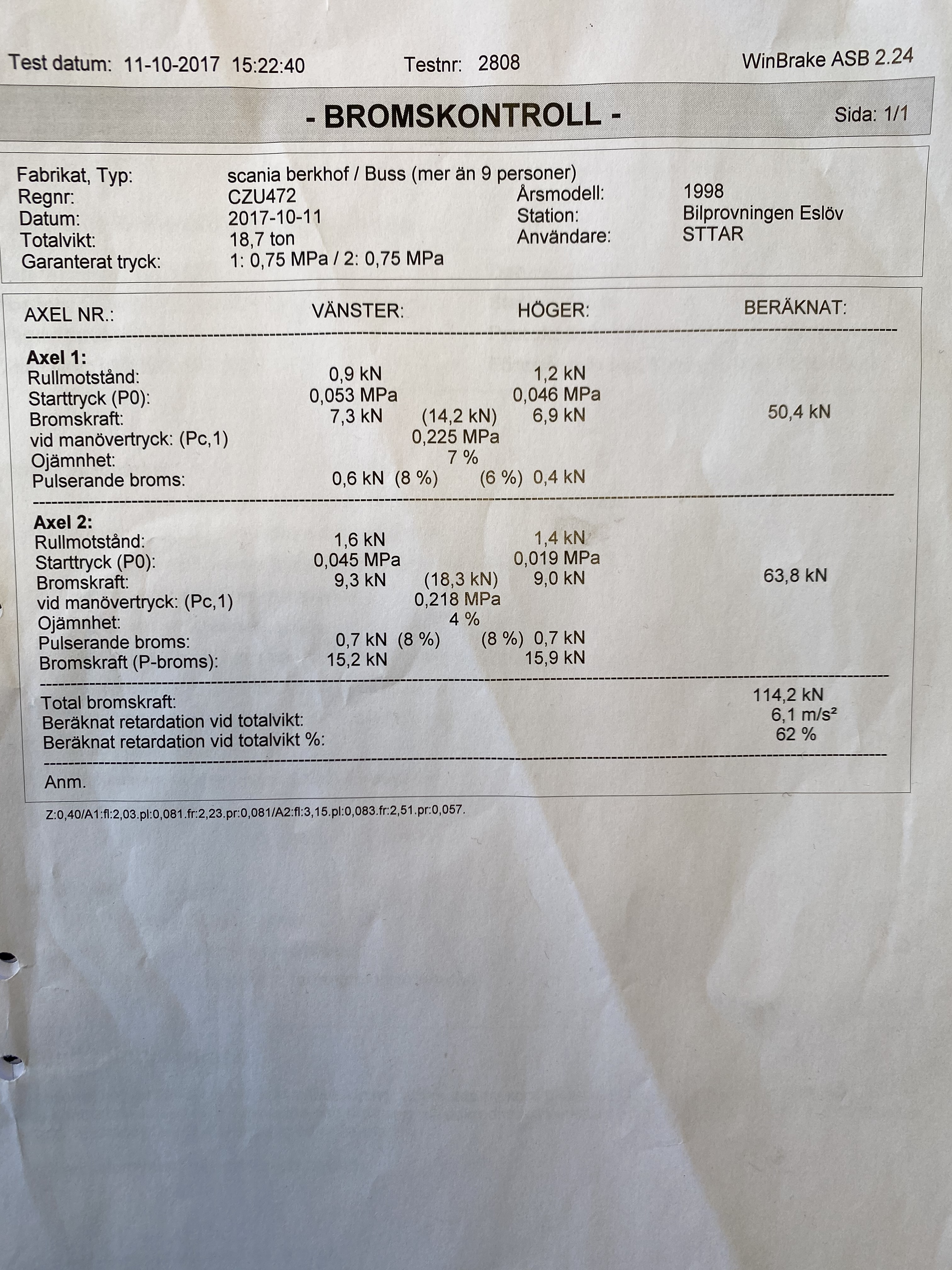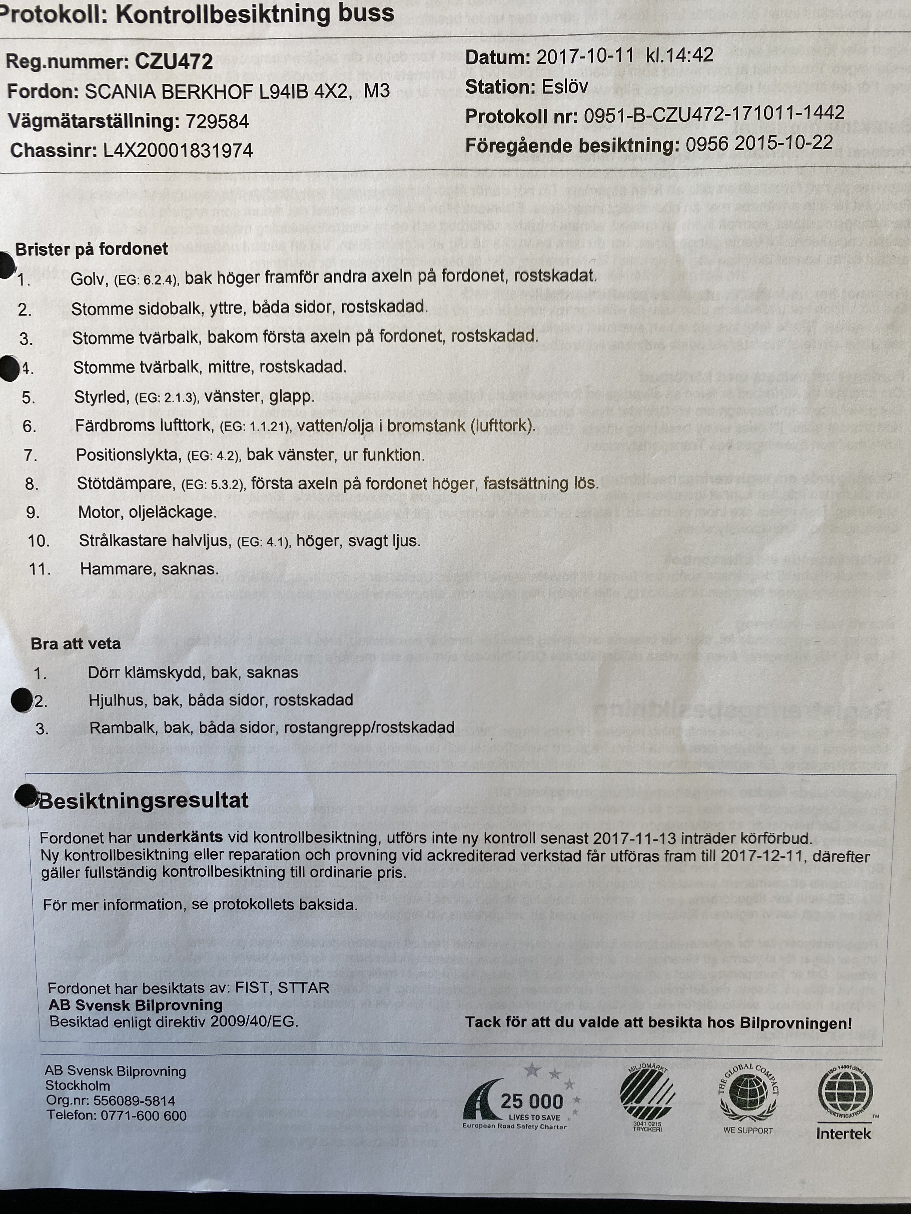 Senast besiktad 2017. Underkänd på ett antal punkter. Se bild för mer information.