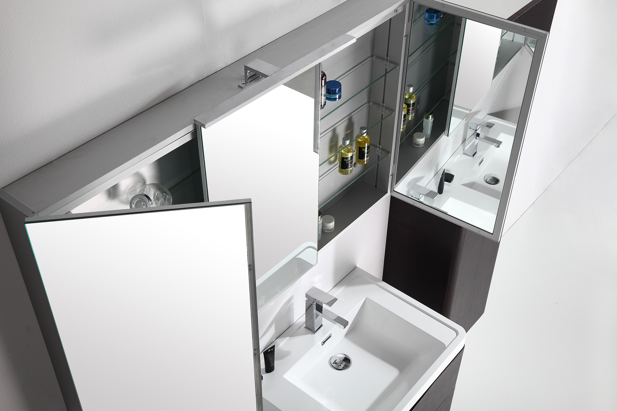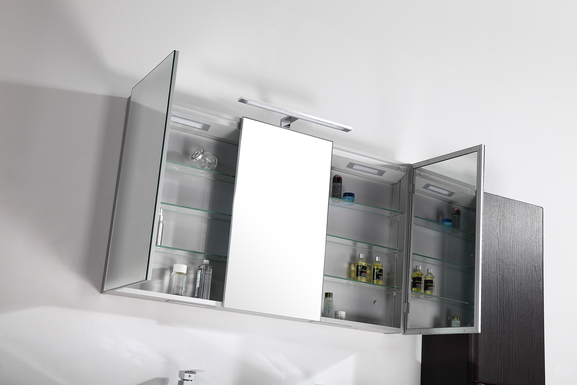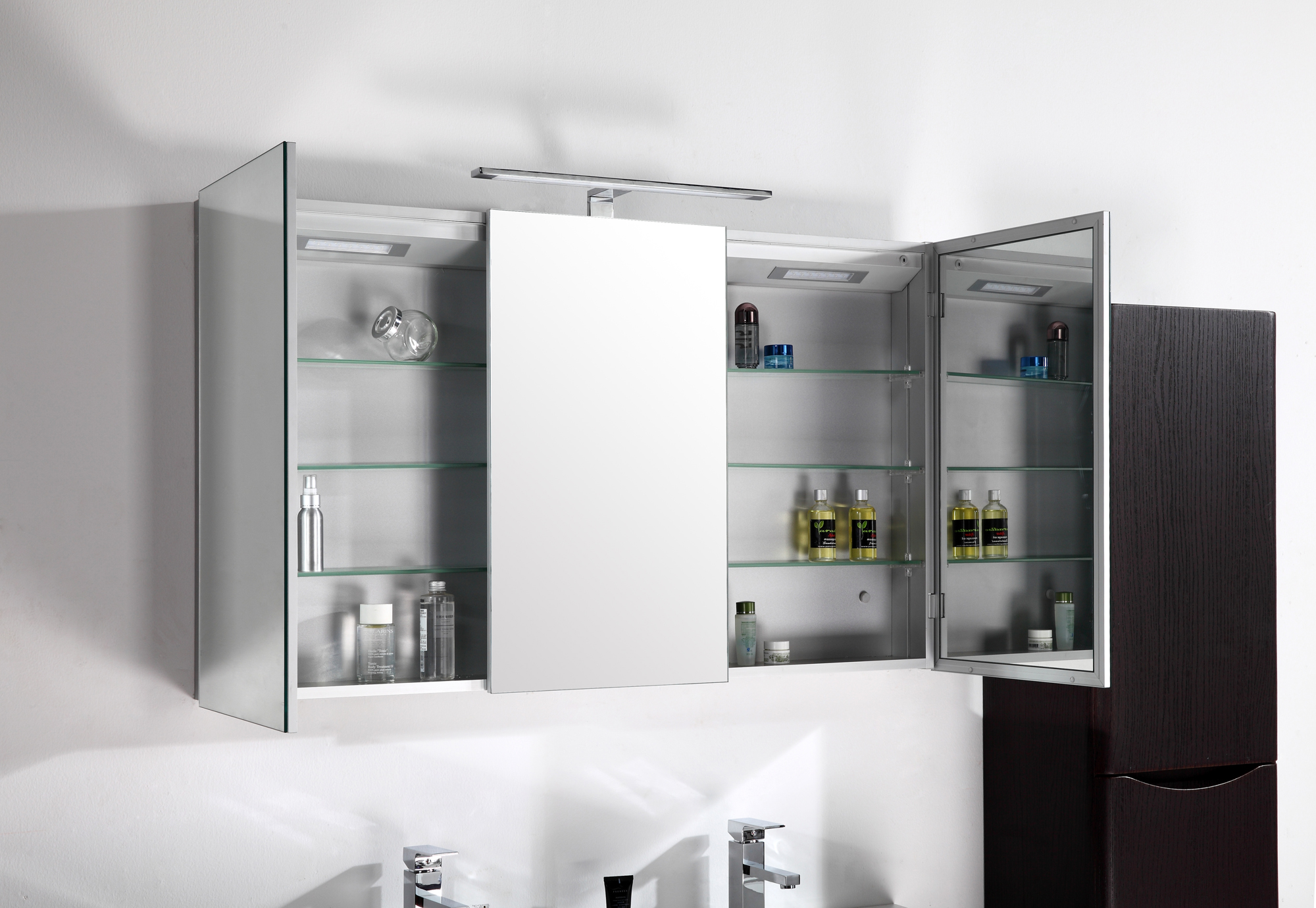Vackert och praktiskt spegelskåp i aluminium från Sibylla-serien, med LED-belysning undertill och inuti, eluttag, spegel även på insidan och fina glashyllor för dina hygienartiklar.
