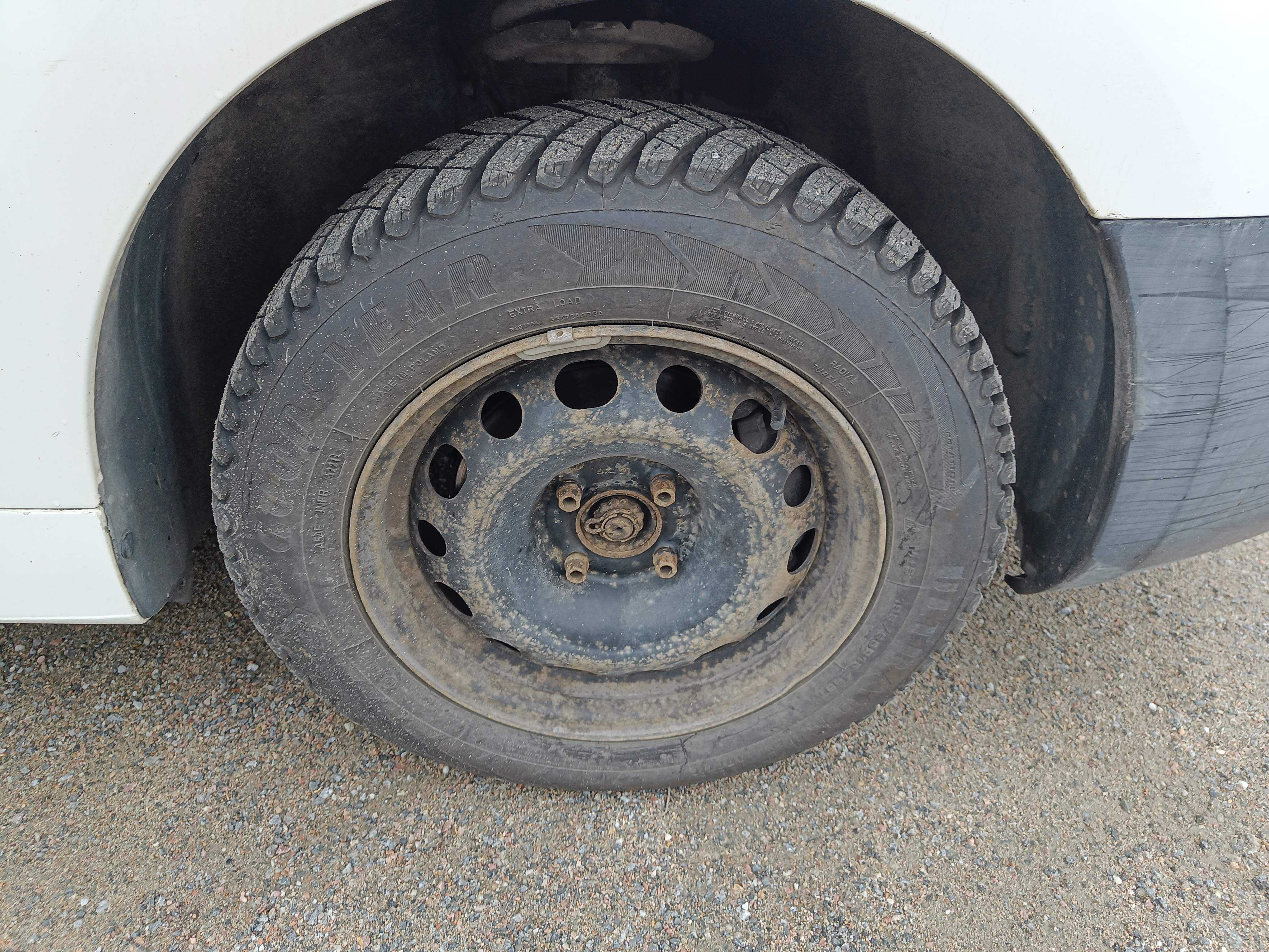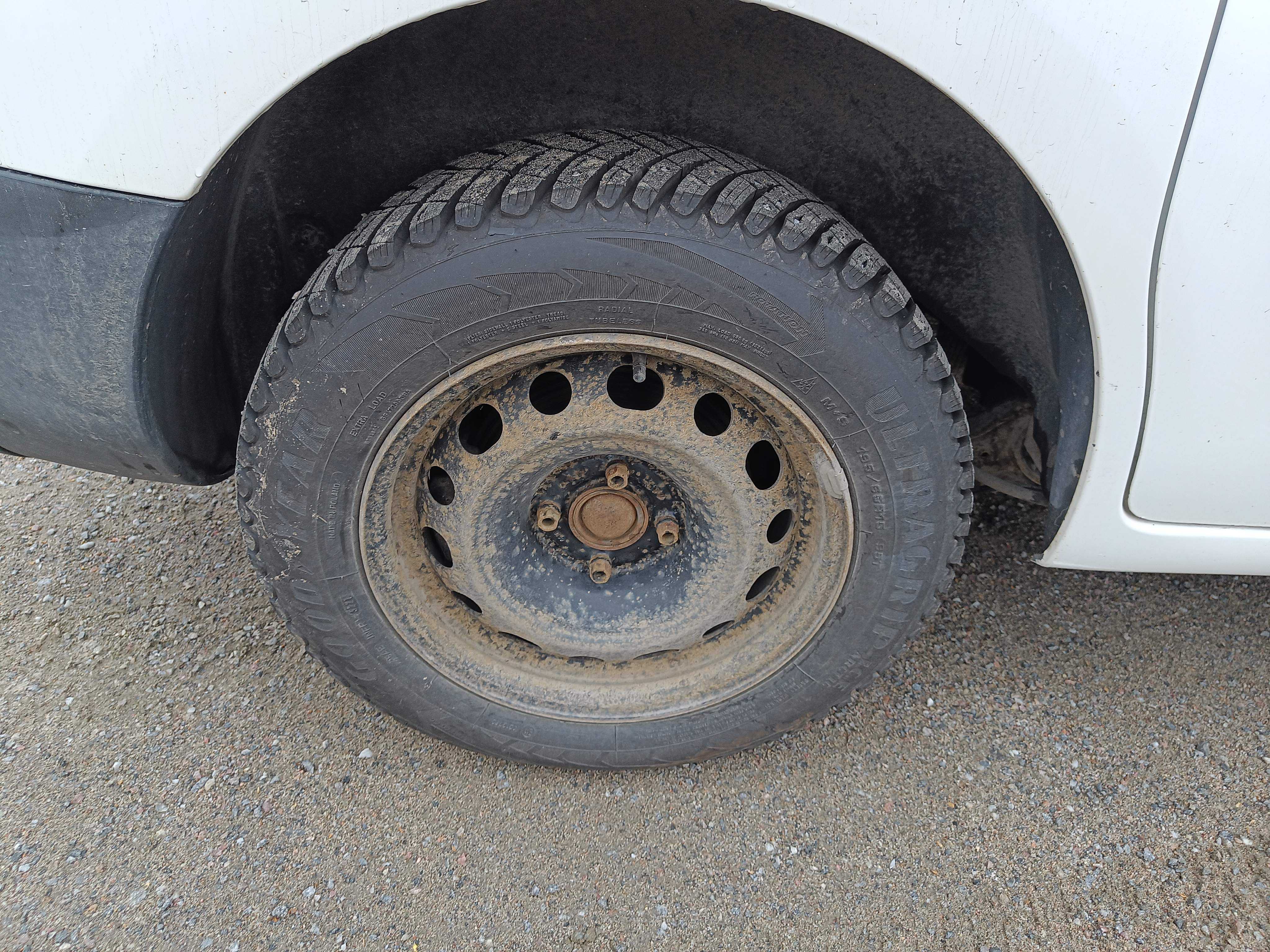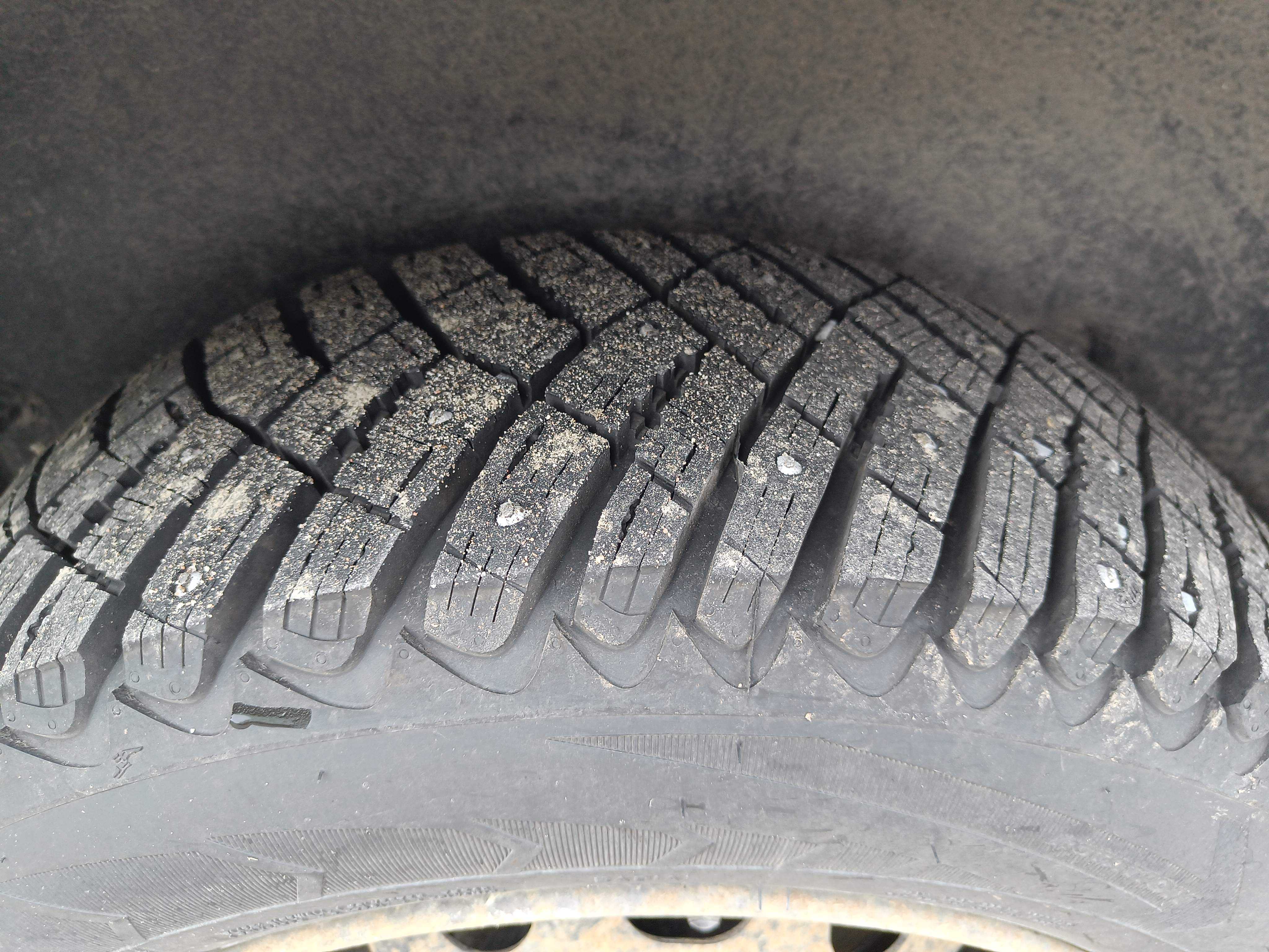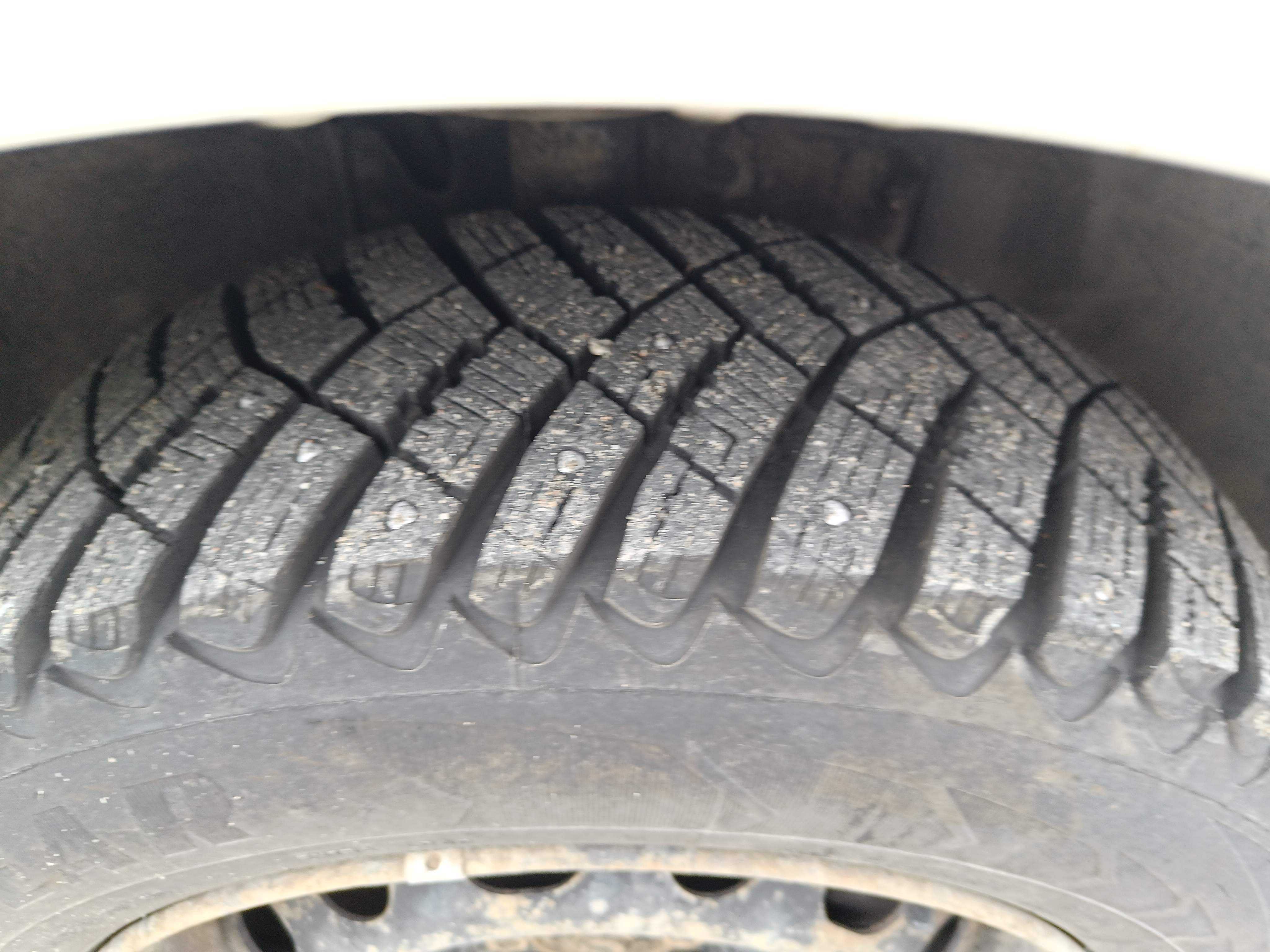 Dubbade vinterdäck på stålfälgar, cirka 50% kvarstår av mönsterdjupet.
